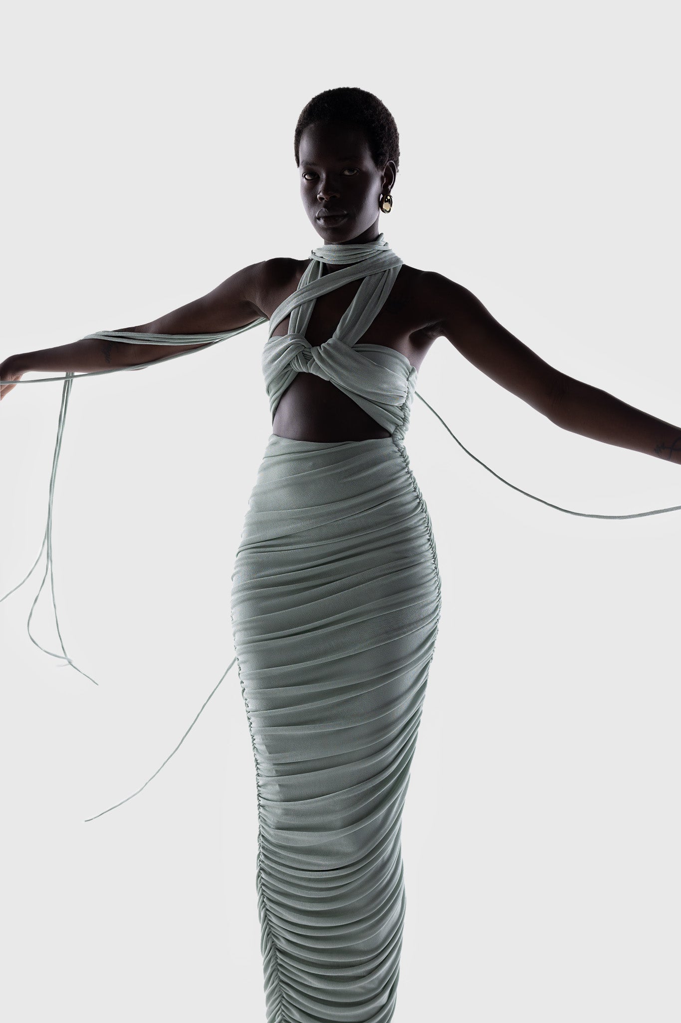 Kesh in new form. A asymmetric ruched maxi with cross over bust strap detailing.