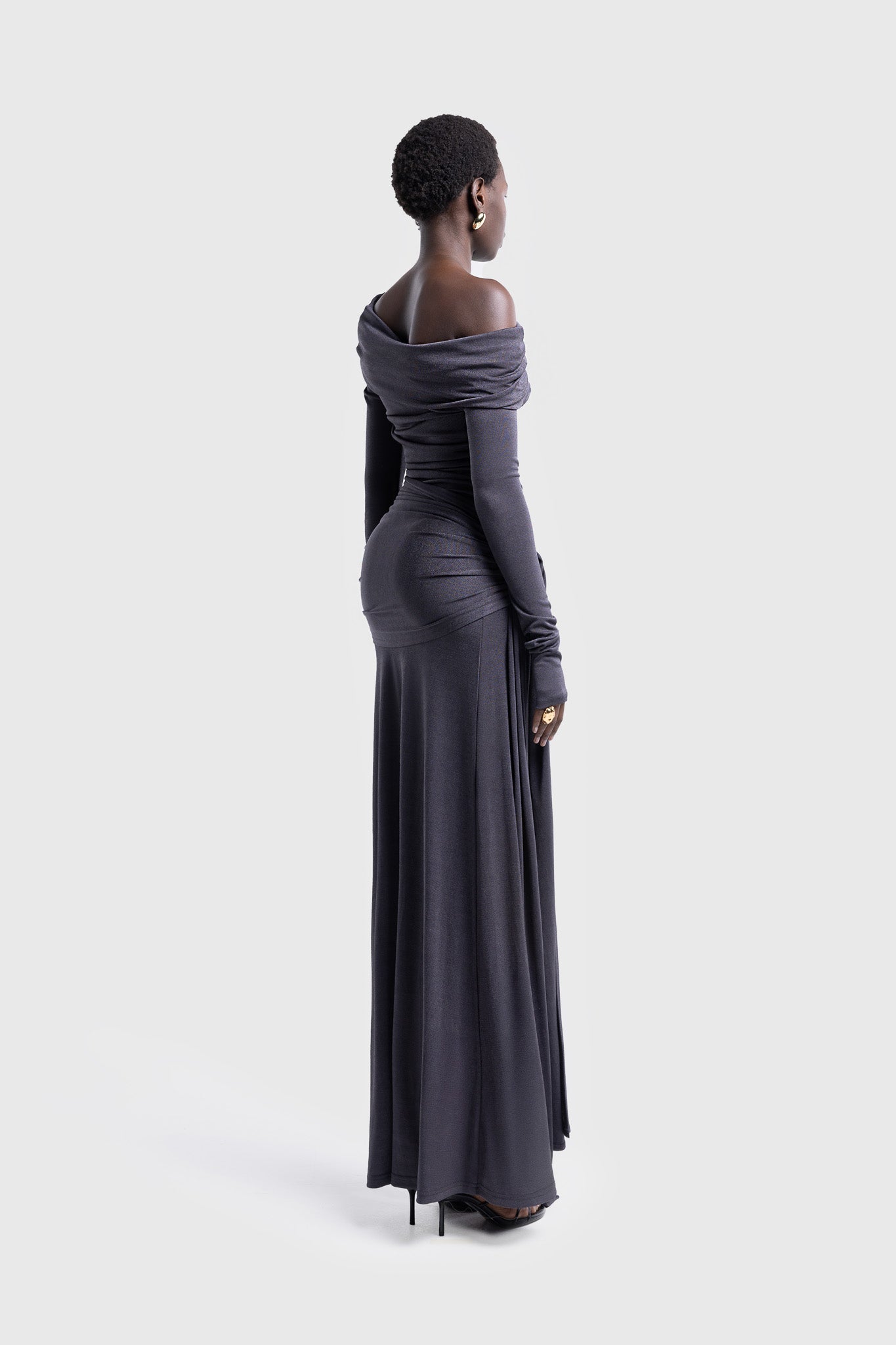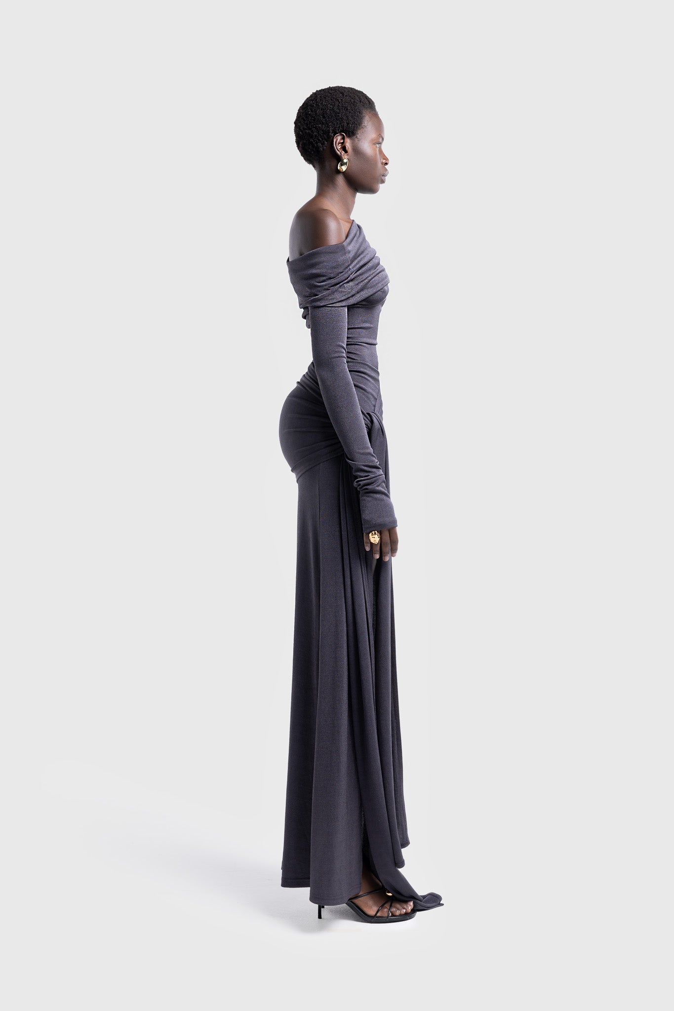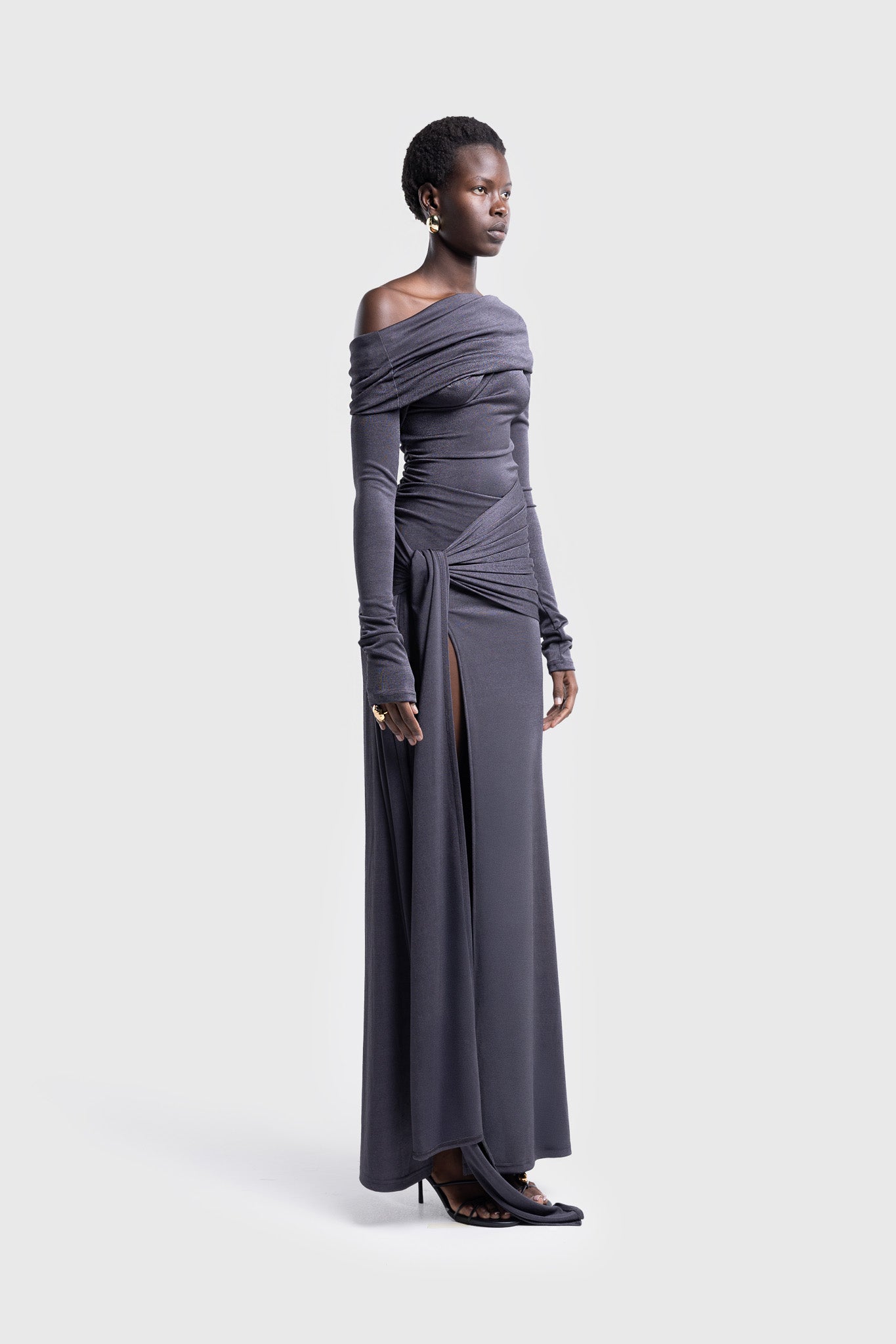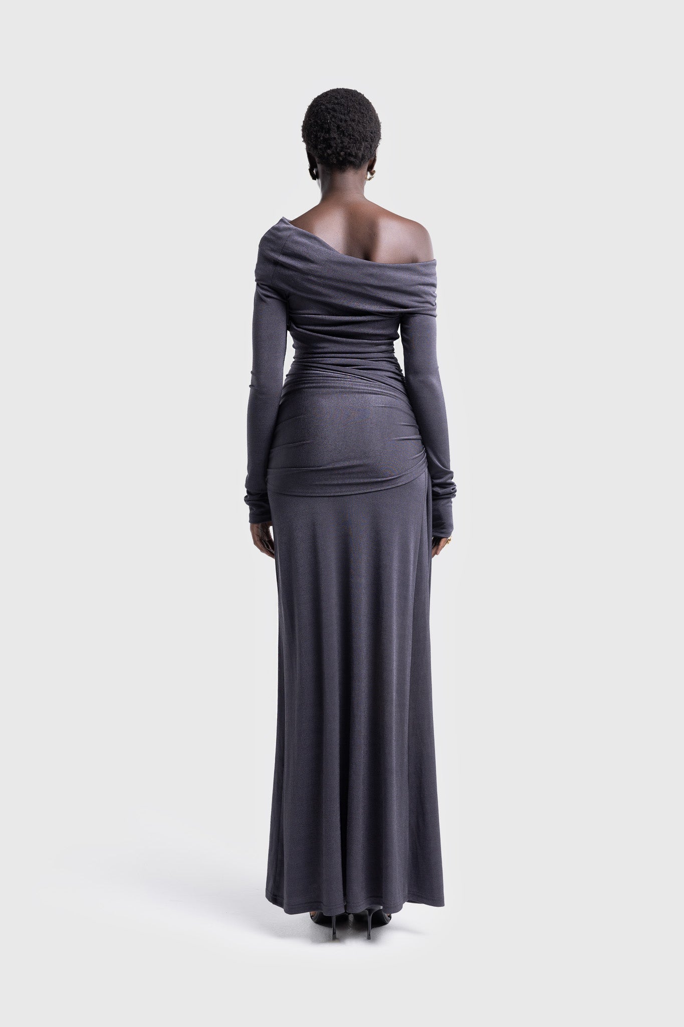 Nira is a flattering long dress with asymmetric ruched neckline and overlayed bum panel with self tie straps.