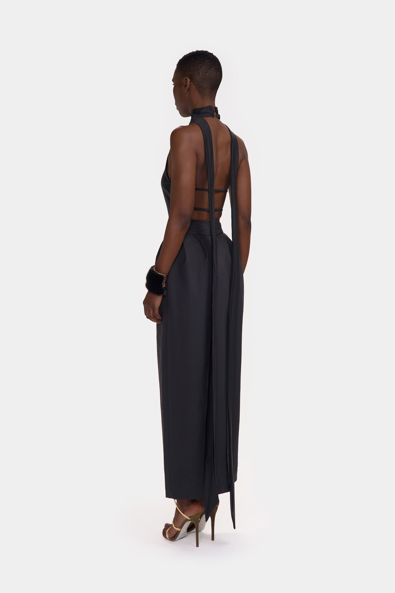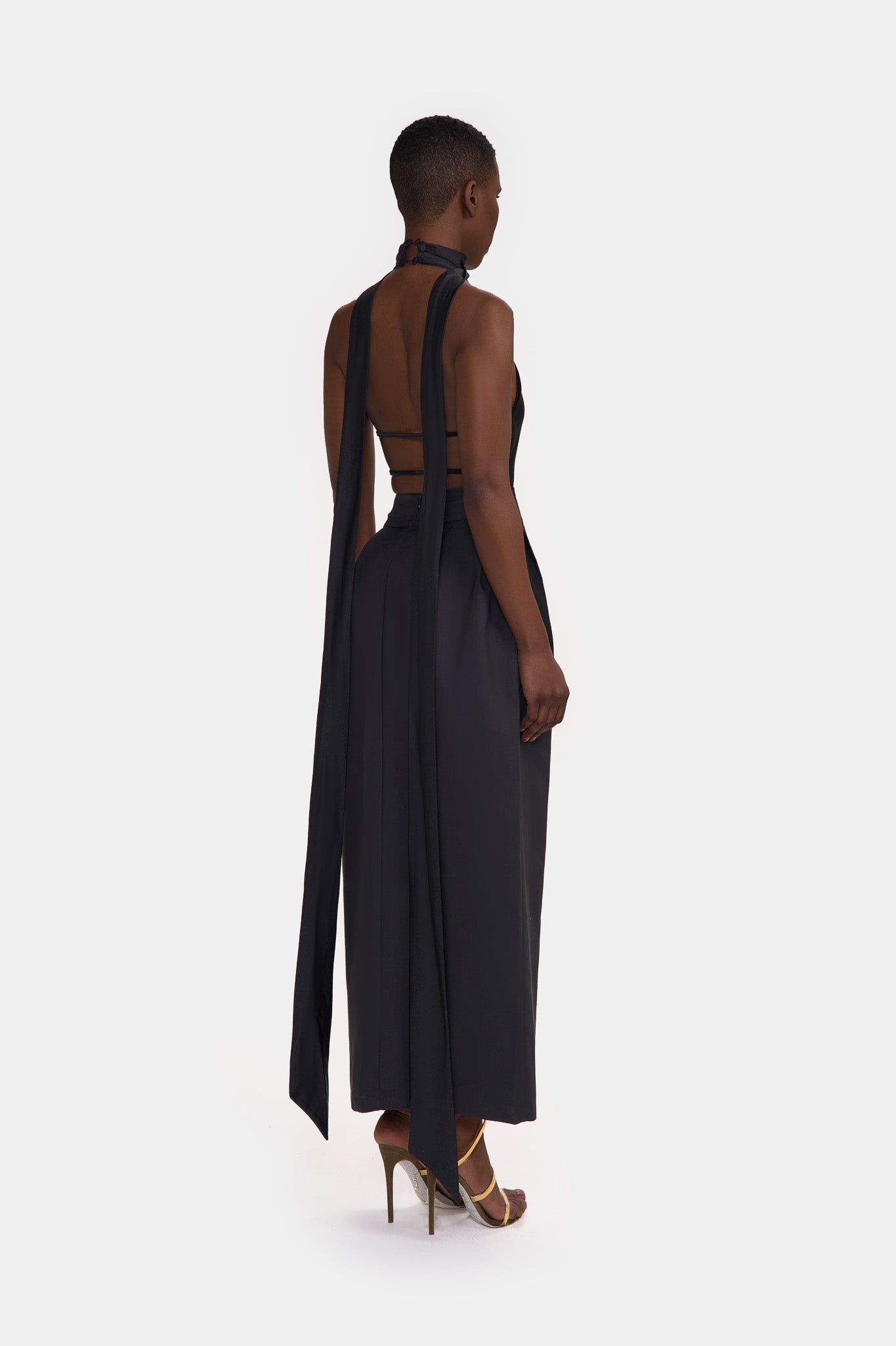 A figure hugging Halter Bodysuit with a sexy unique design. Complete with a skinny neck scarf and open back with spaghetti strap detailing, she's stunning! Pair with our High waist slit maxi skirt to finish the look.