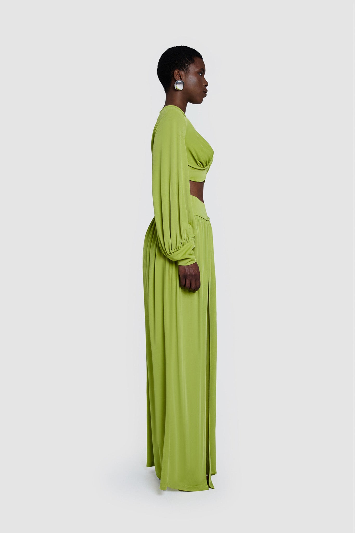Elevate your spring wardrobe with our Iku Crop Top in Pistachio. This cropped top features bust shaping for a flattering silhouette, ruching over the bust for added texture, and flowy loose sleeves with cuffs and fabric covered buttons. Pair with the Iku Maki Skirt.