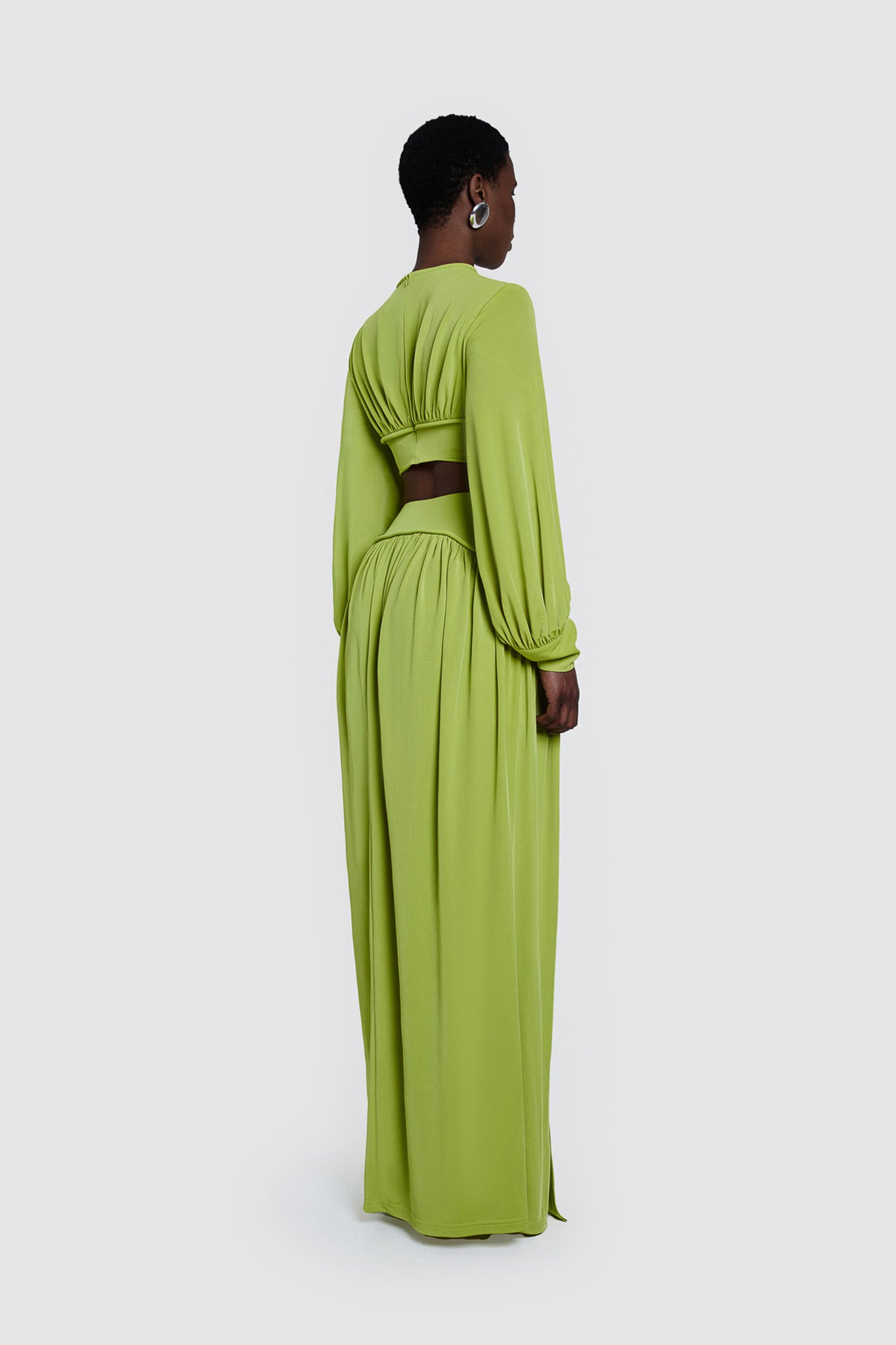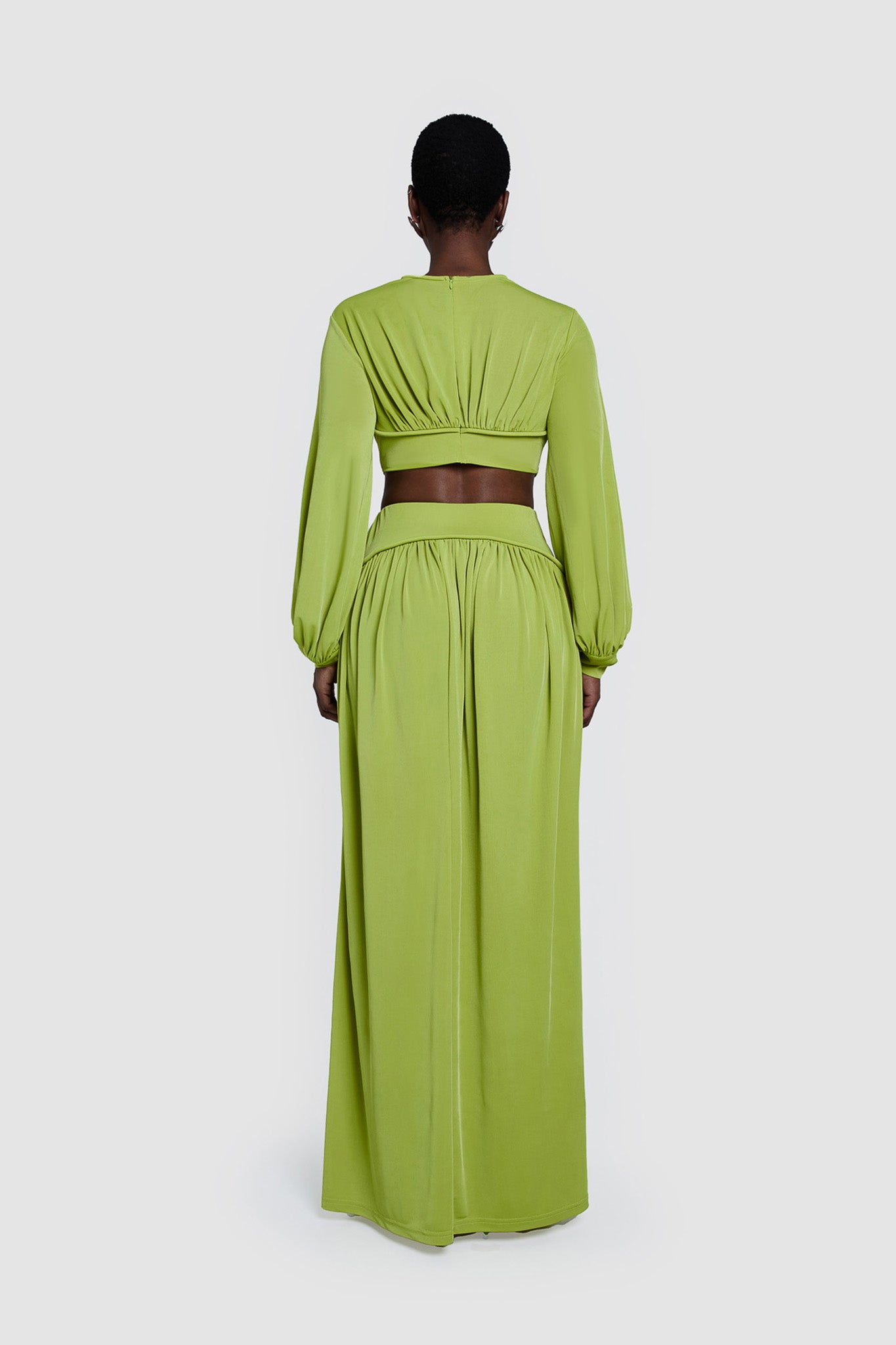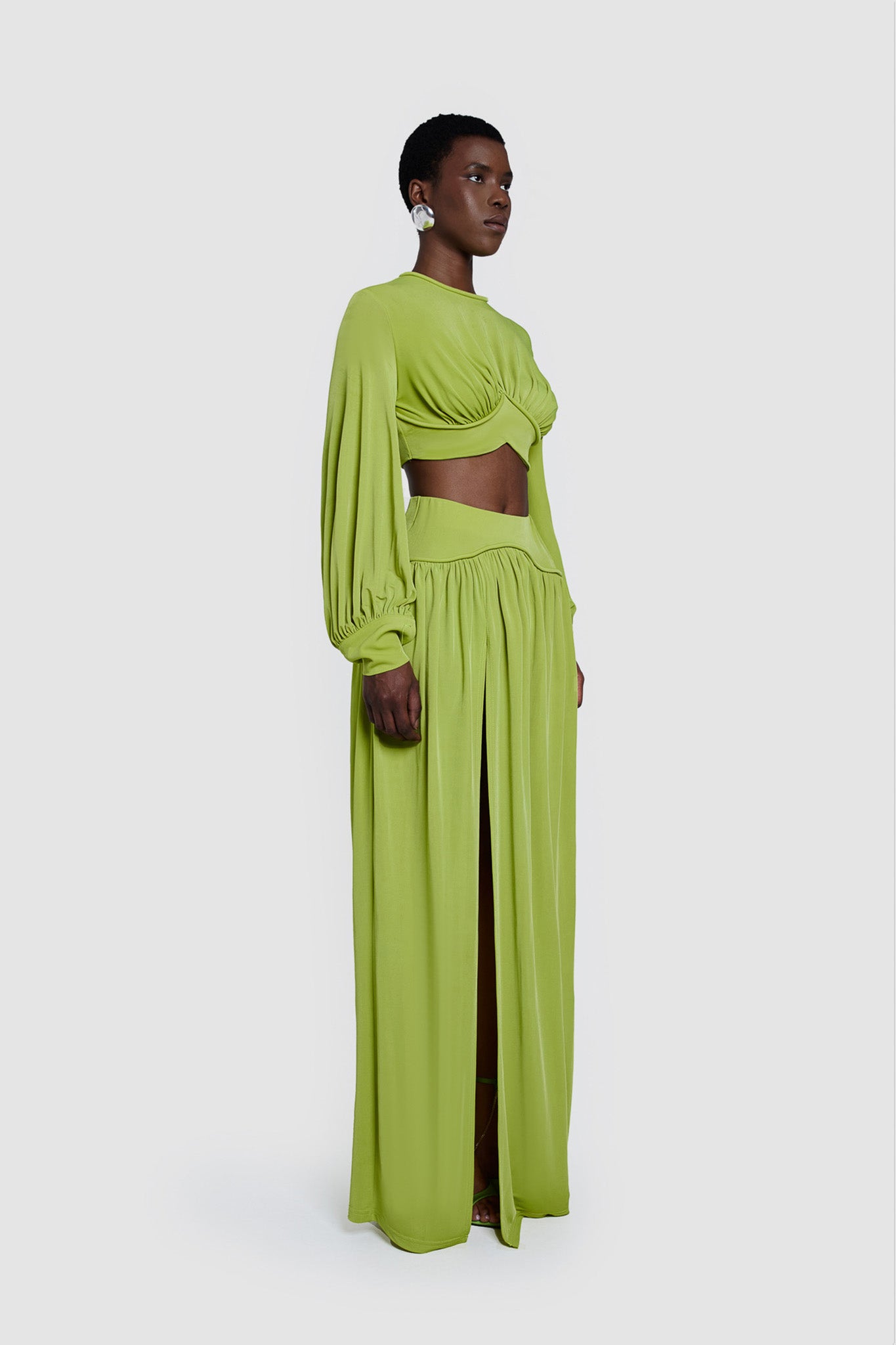 Elevate your spring wardrobe with our Iku Maxi Skirt in Pistachio. Flowy and light, this skirt features high slits and delicate ruching for added drama. The thick, elastic waistband provides shaping and a comfortable fit, making it the perfect spring skirt. Pair with the Iku Crop.