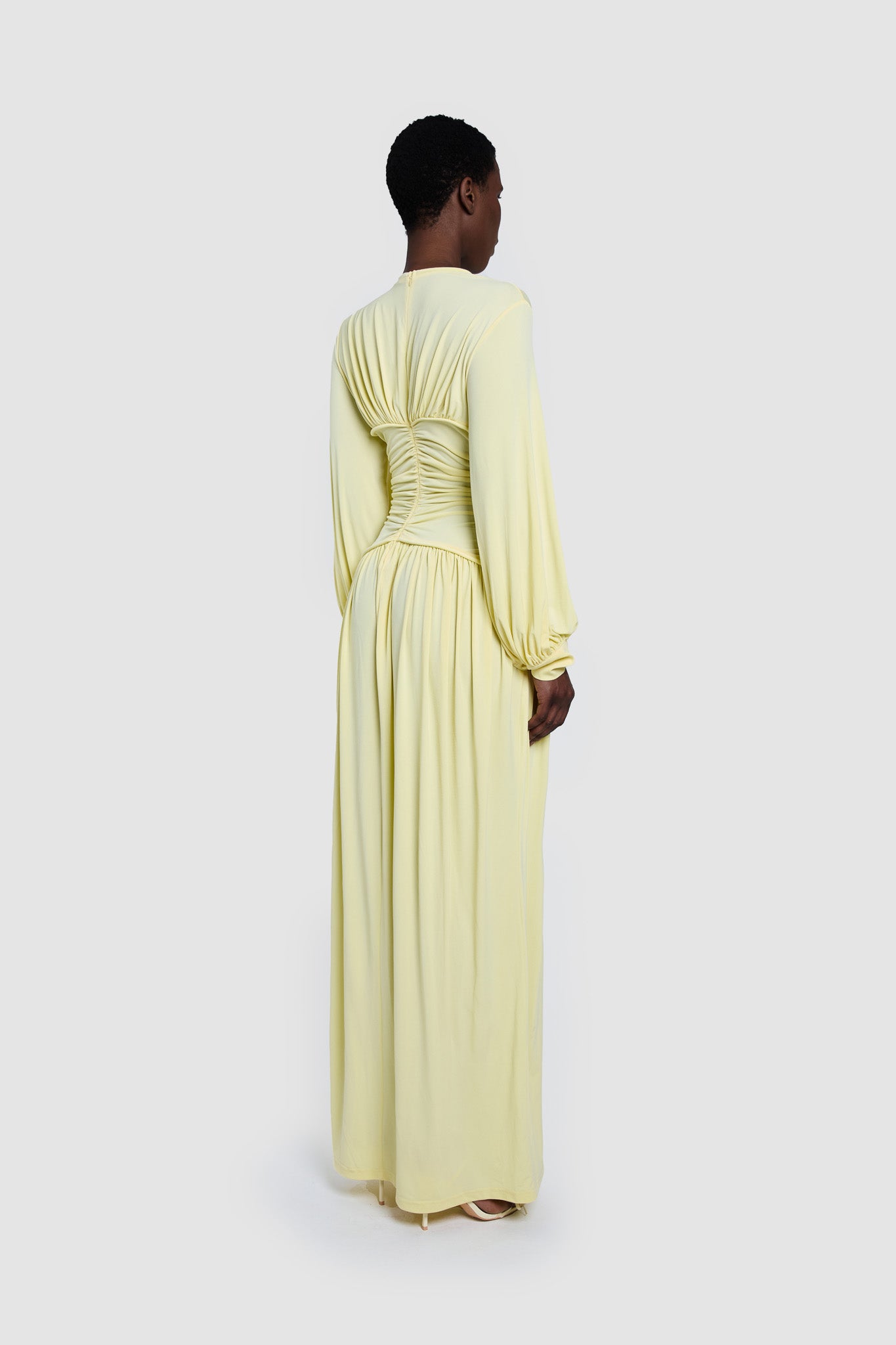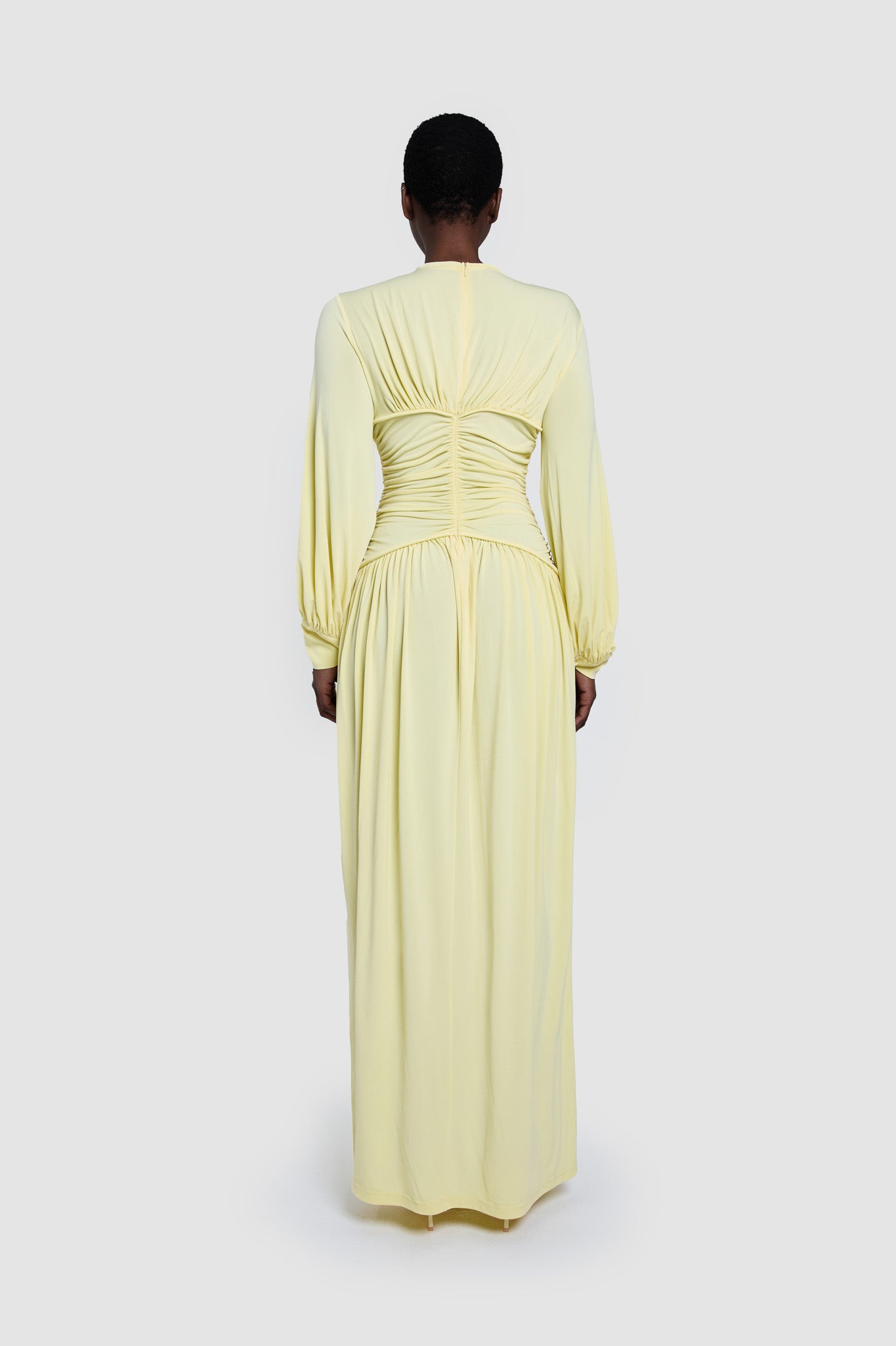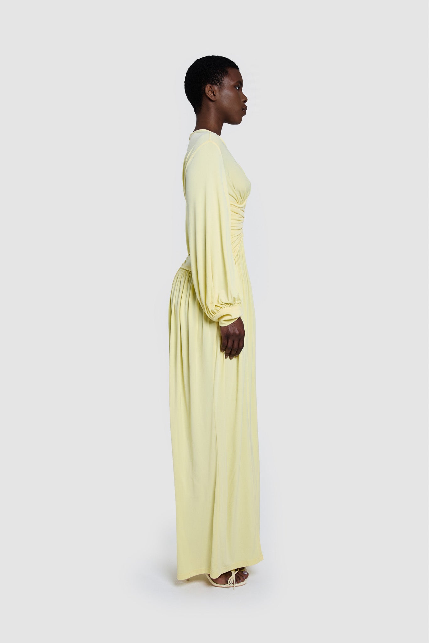 The Iku Maxi in Soft Limone offers a flattering hourglass shape with its ruched waist and flowy bottom. The lightweight, soft fabric lends a comfortable feel while the loose sleeves and slits add a touch of flowiness. Enjoy effortless style with this must-have piece.