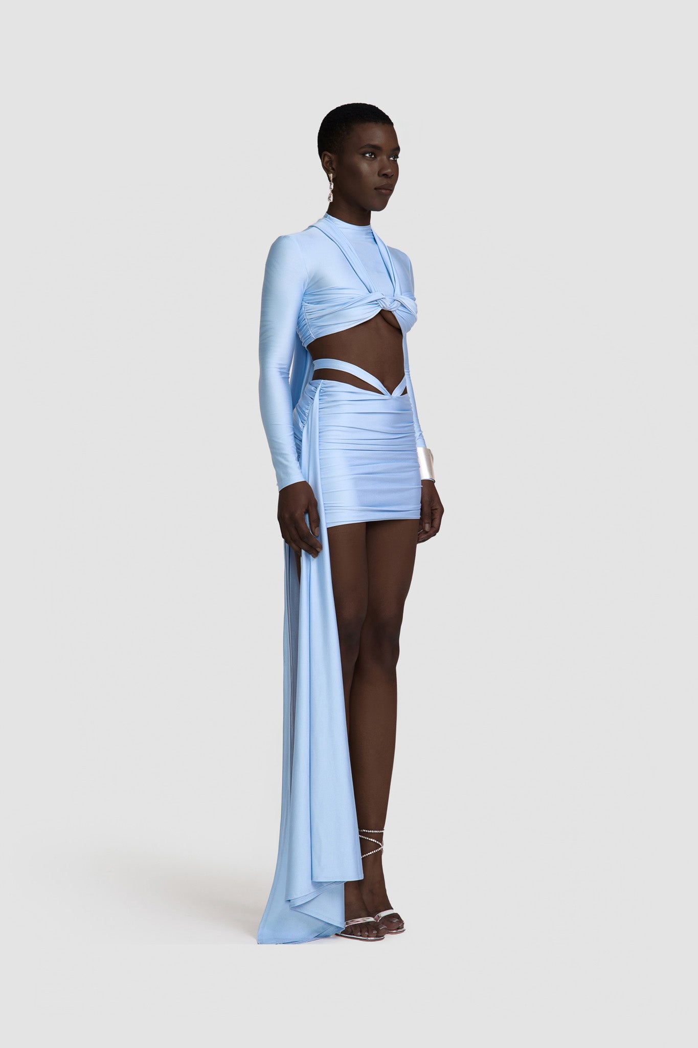 Looking for an easy to wear 2 piece that will take you from day to night? The KESH set is IT! A super cute cropped top with ruched crossover bust detailing, neck strap and long sleeves. Crop and Mini Skirt sold as separates.