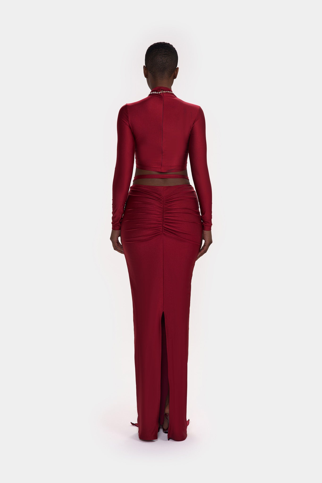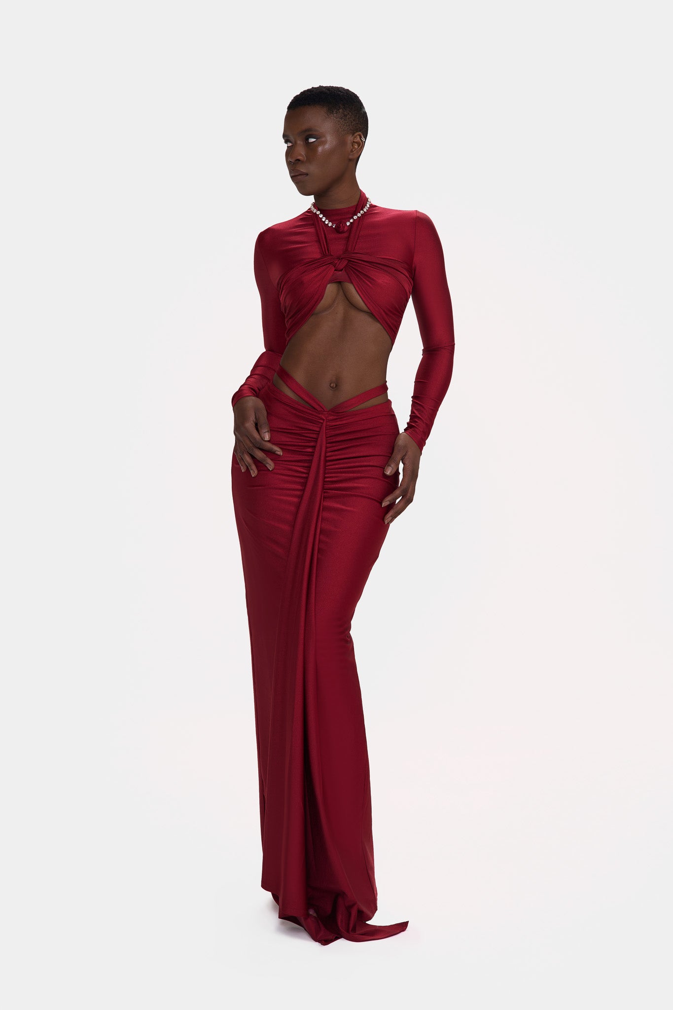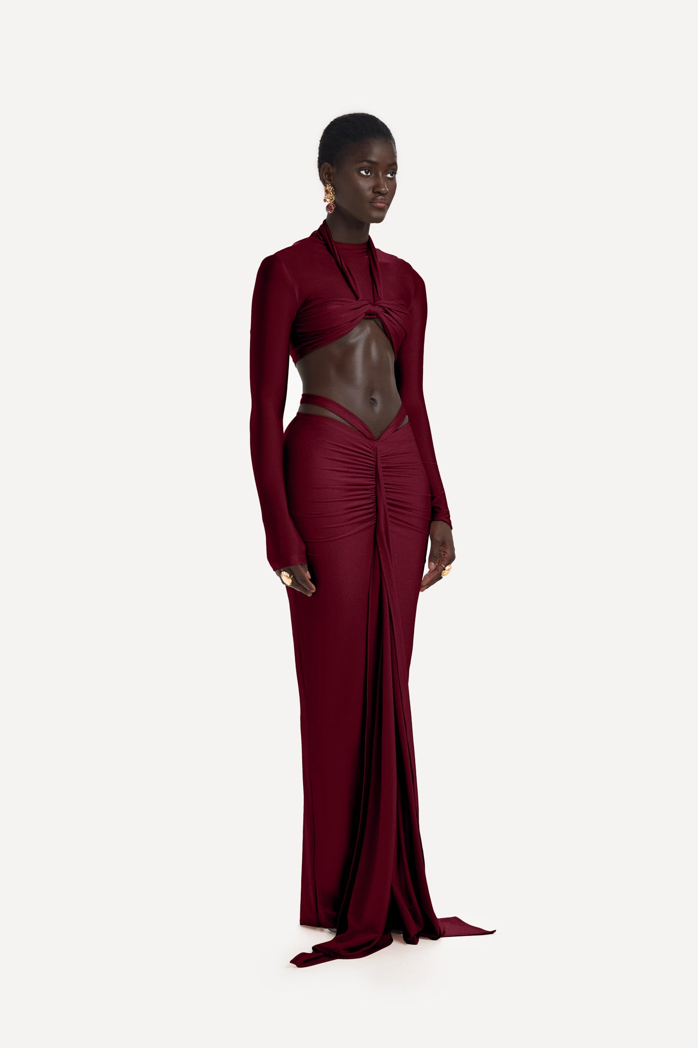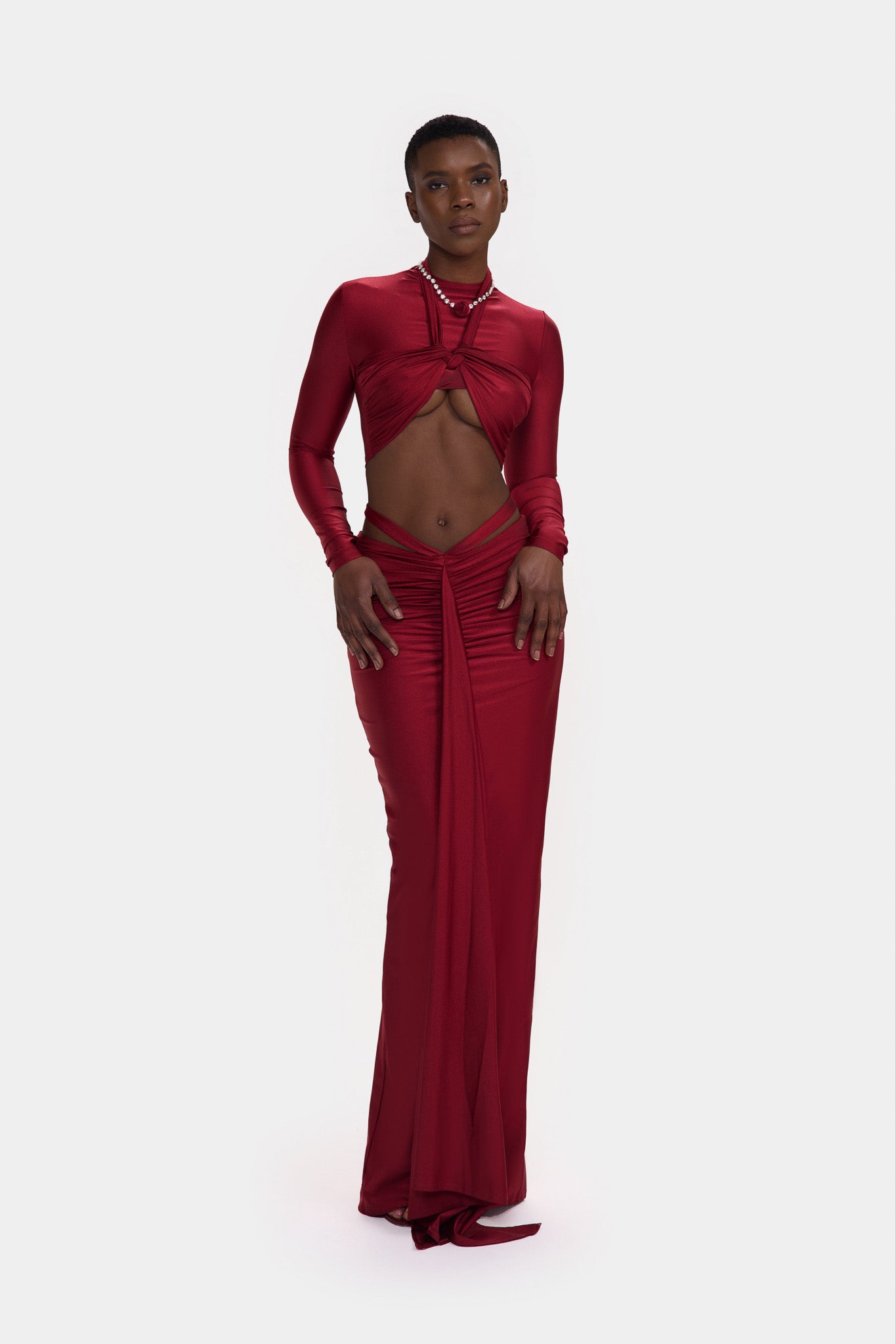 Looking for an easy to wear 2 piece that will take you from day to night? The KESH set is IT! With a long front drape to elongate your silhouette and ruching on the bum to accentuate, the Kesh maxi skirt is simple yet creates all the drama you need! Crop and Maxi skirt sold as separates.