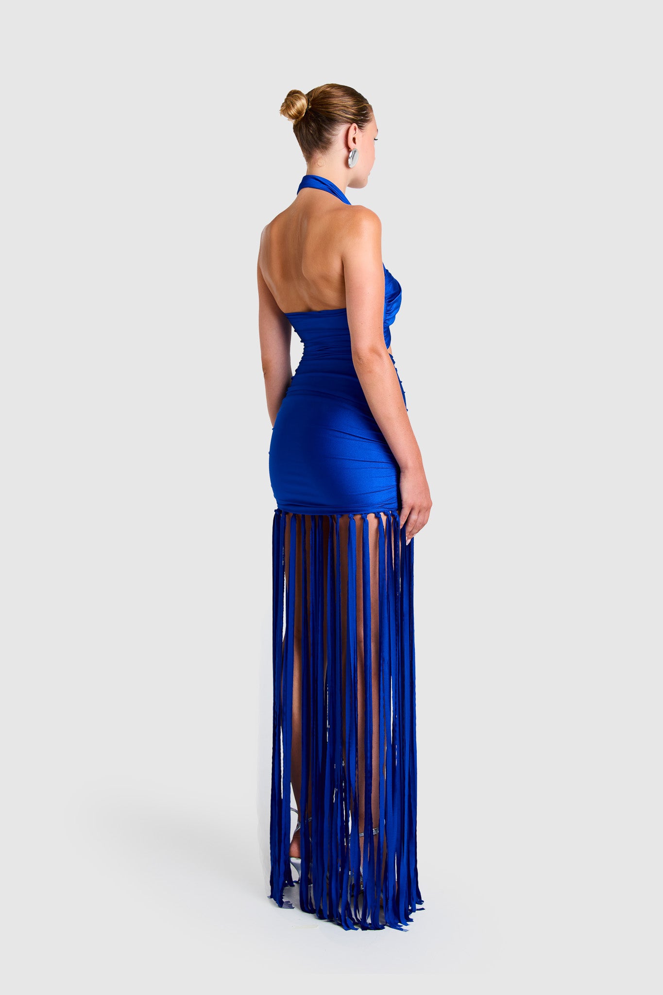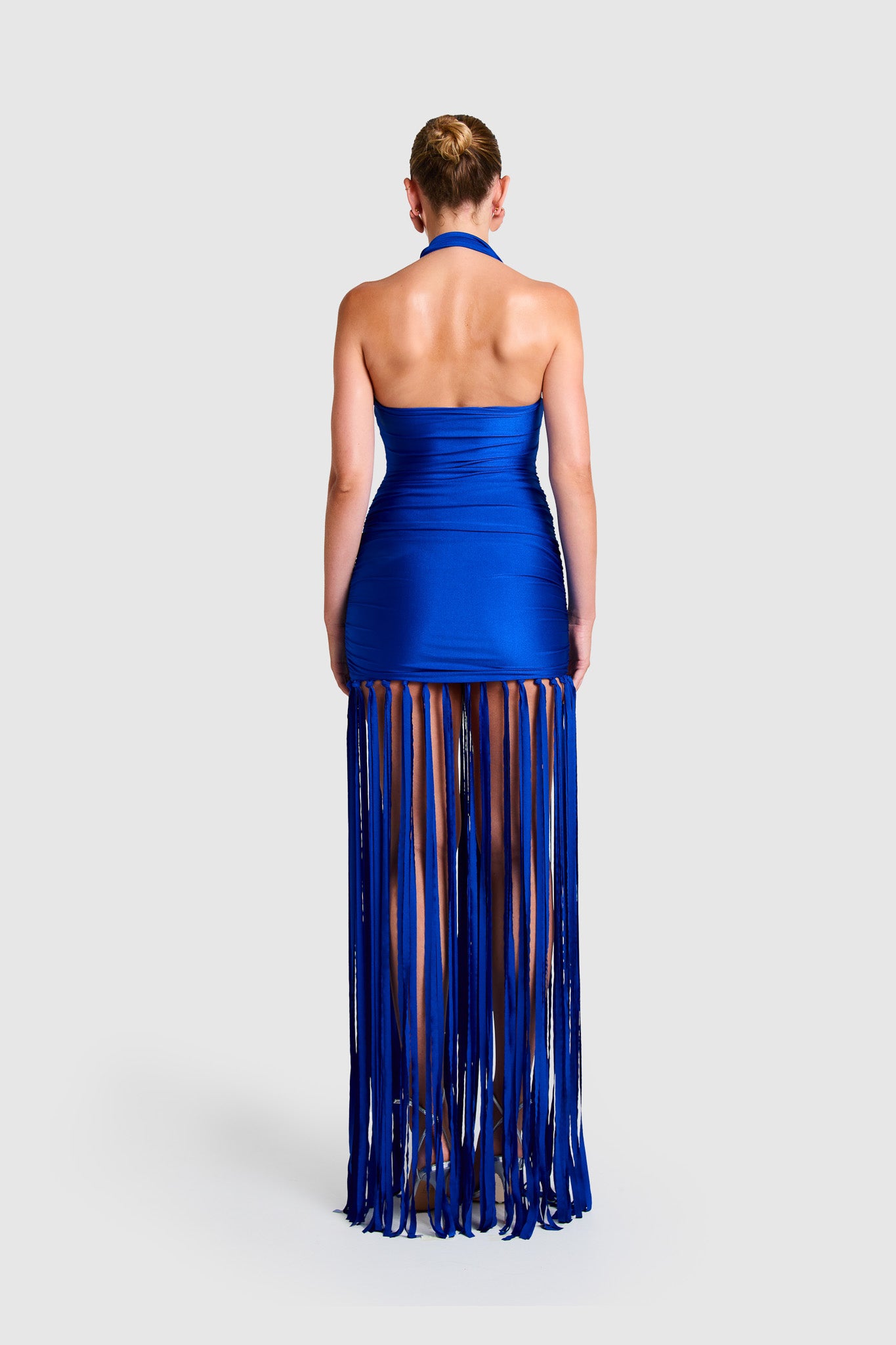 Dress with floor length laser cut tassels and bandeau halter straps that can be worn in different ways
