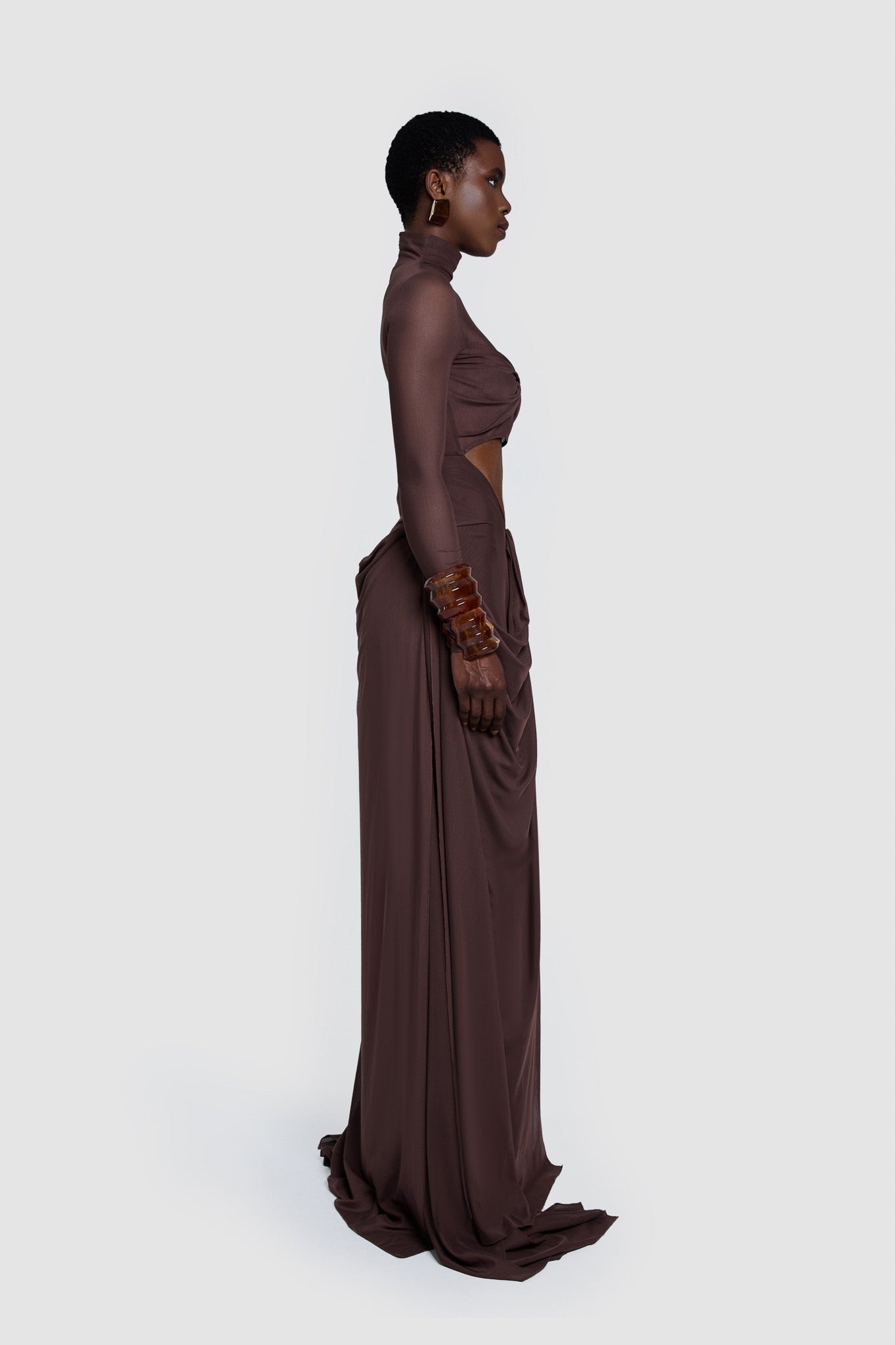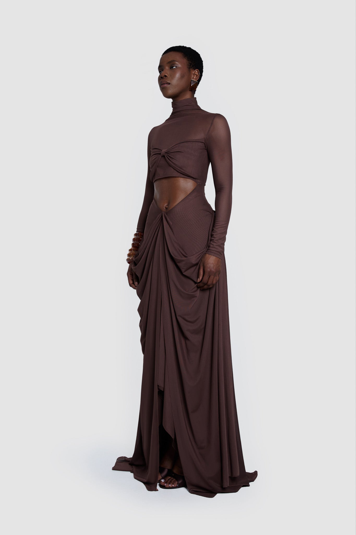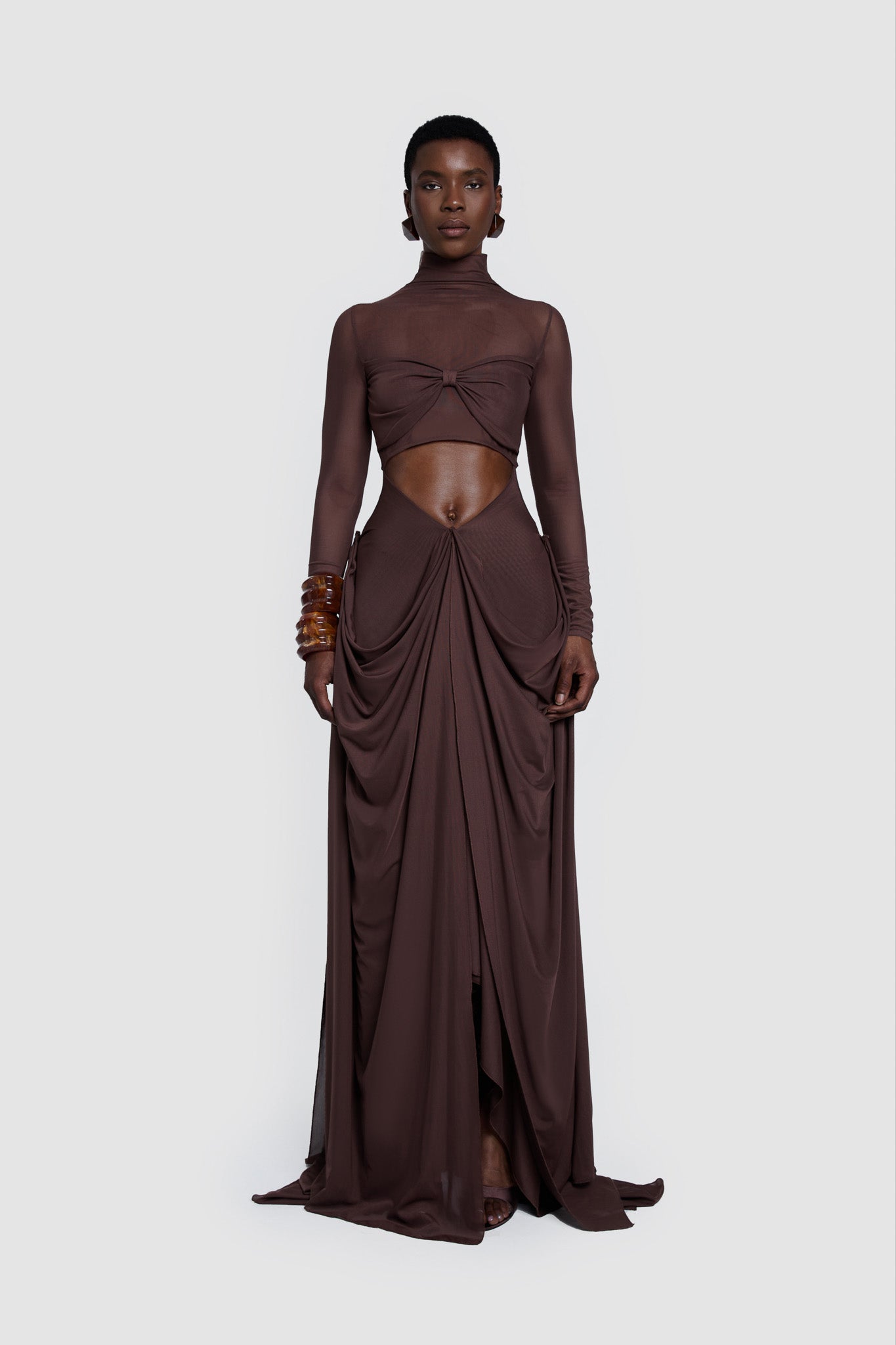 Tao is new and heaven in drapery form! With carefully placed draped panels to help accentuate and flatter your bodys shape, it is a show stopper piece. Perfect for any main event energy.