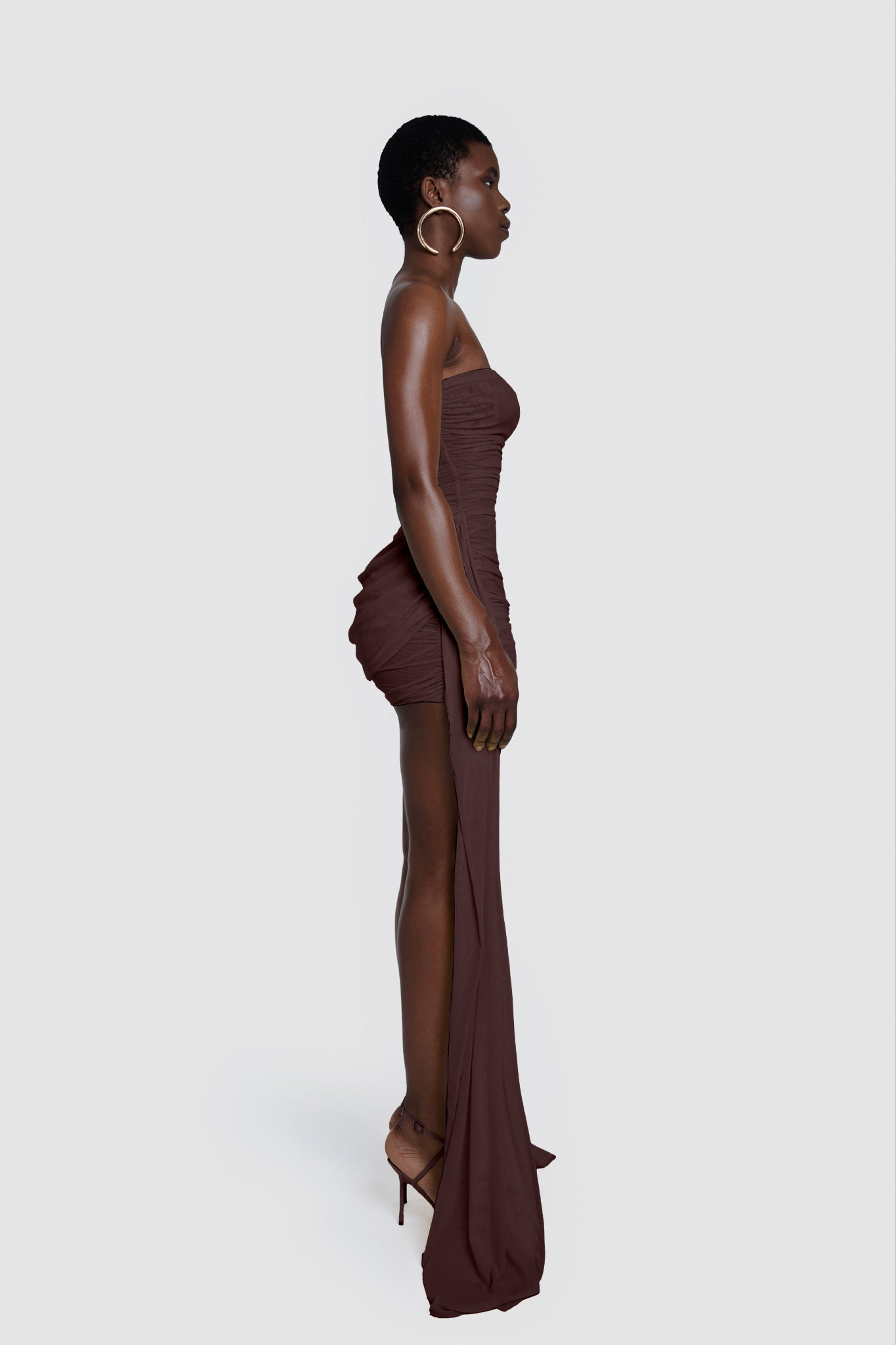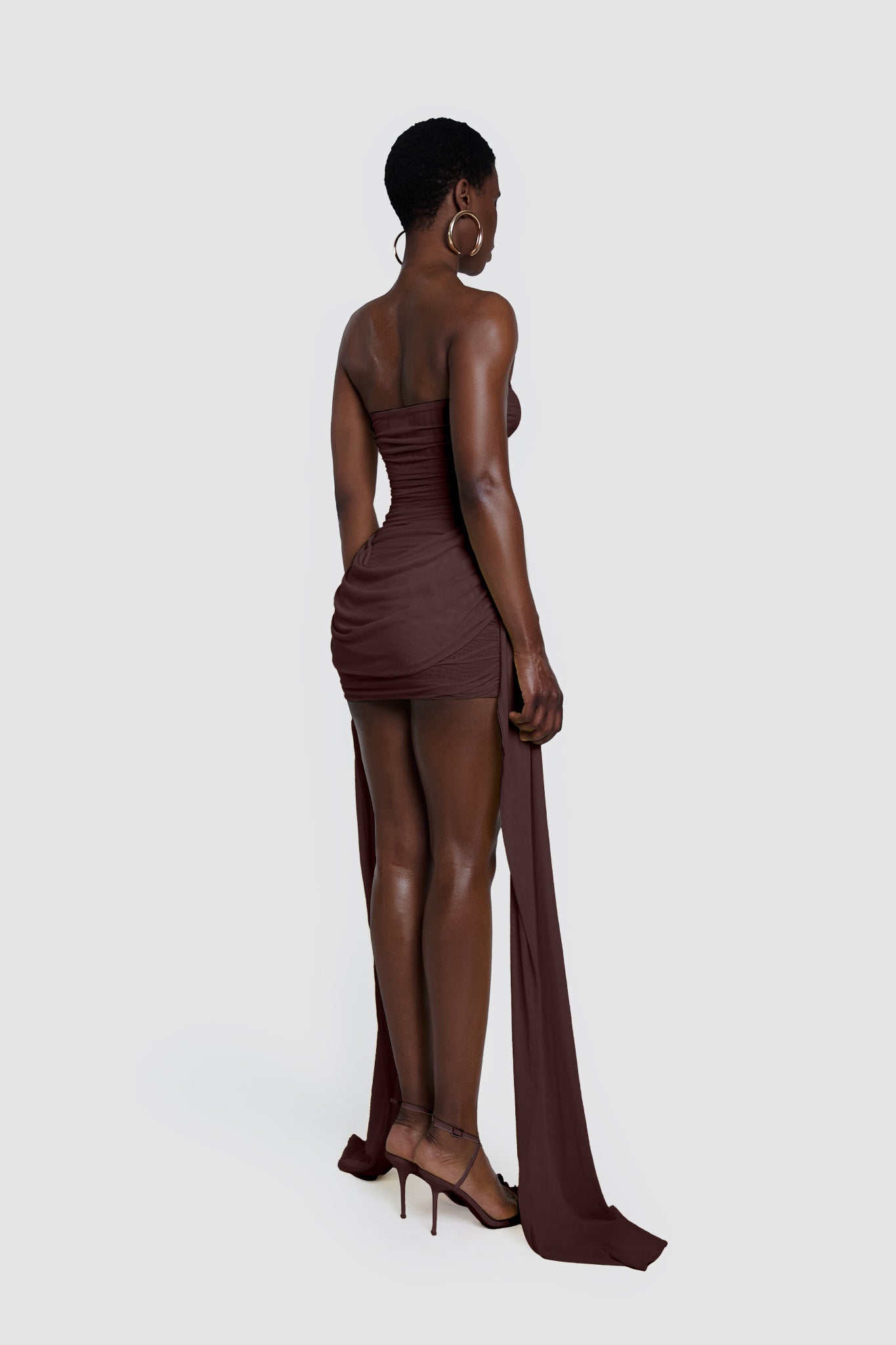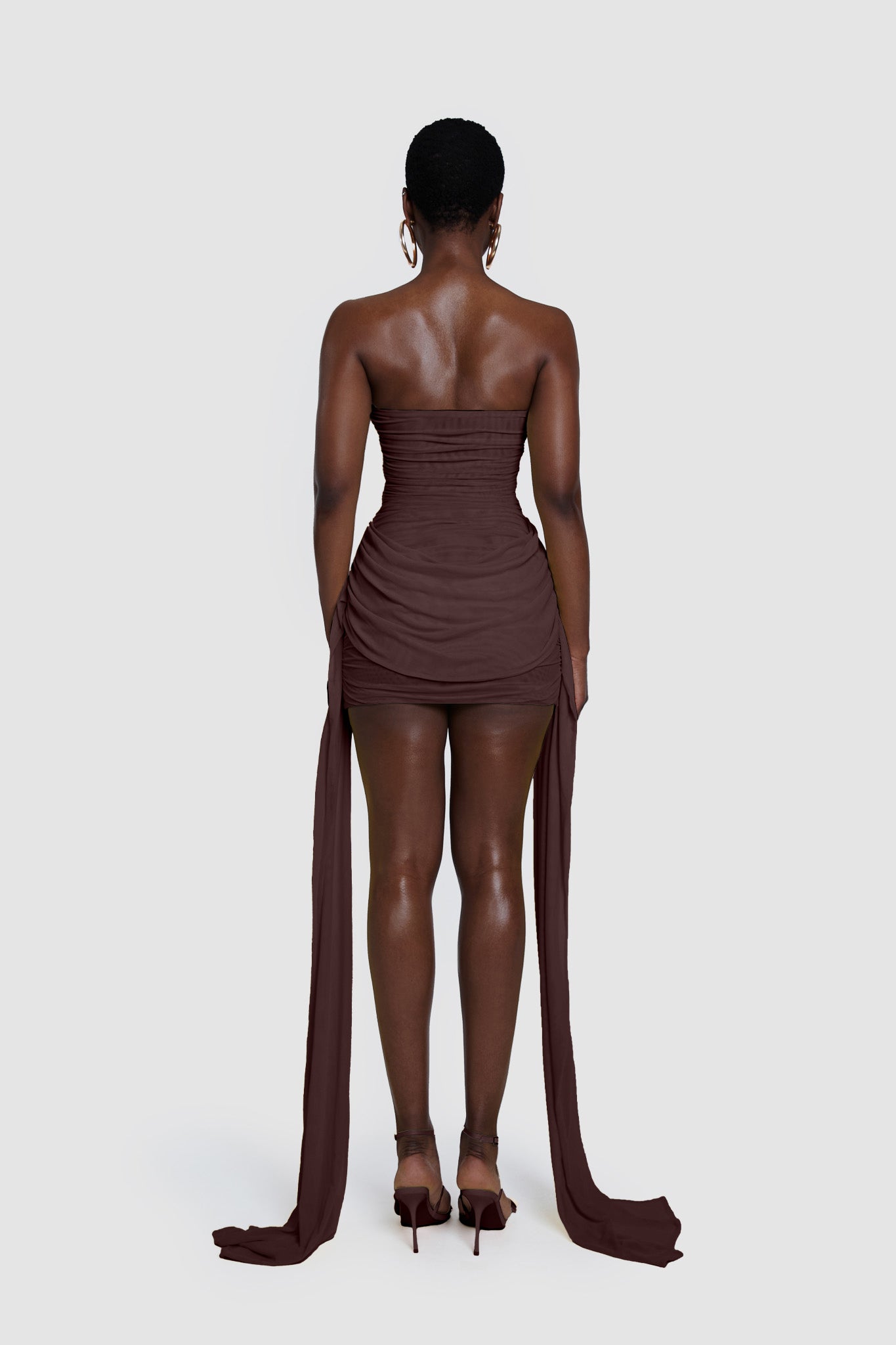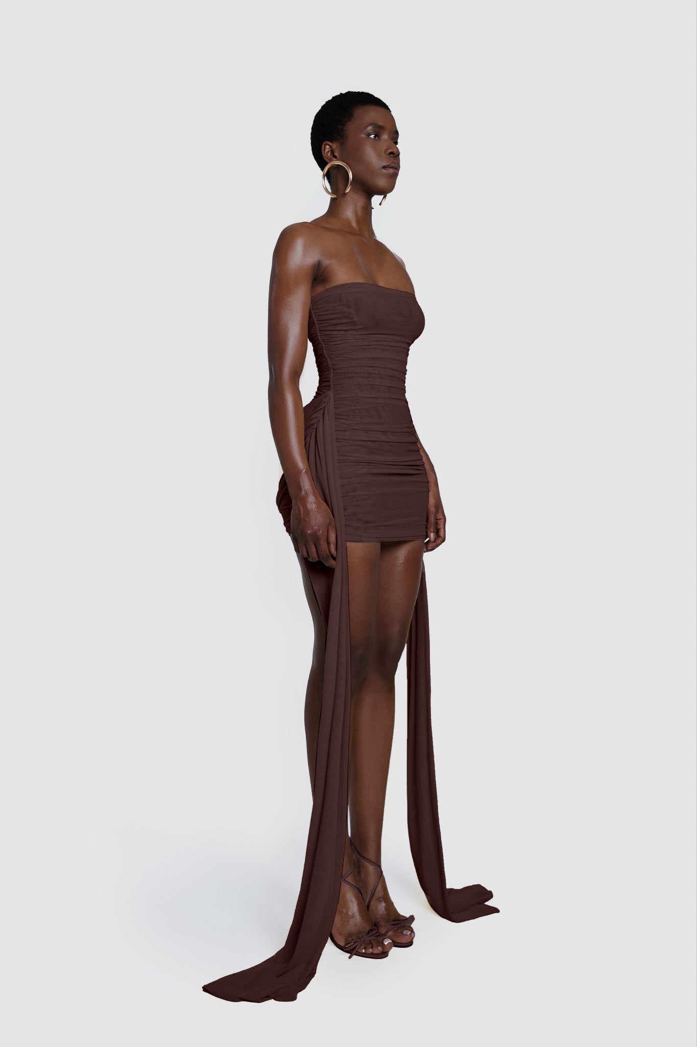 Zaya is made from a super soft, stretchy double layered mesh. With exaggerated ruching though out and floor length side straps, she is the perfect, versatile, stand-out mini that will get everyones attention in the room!