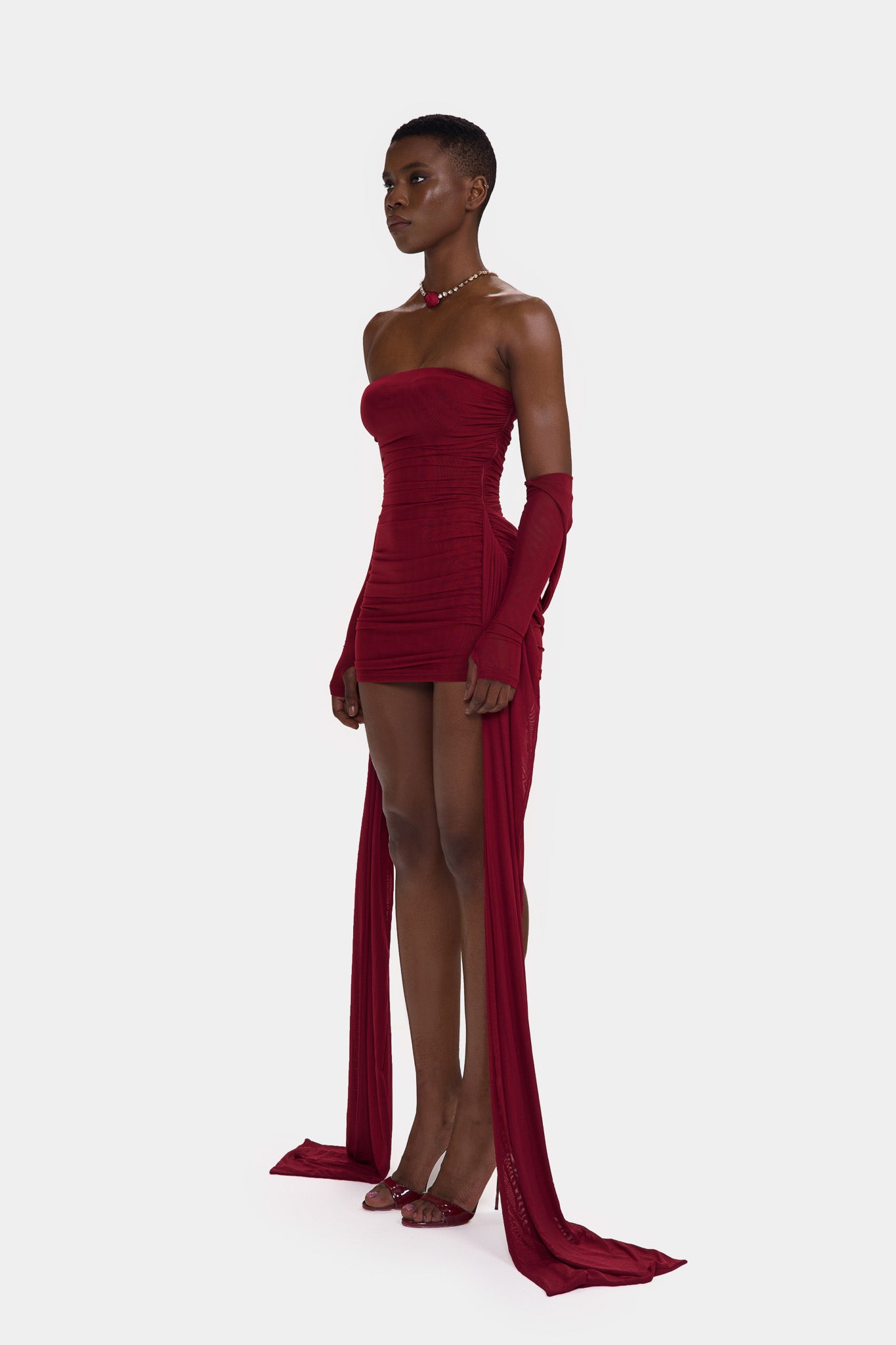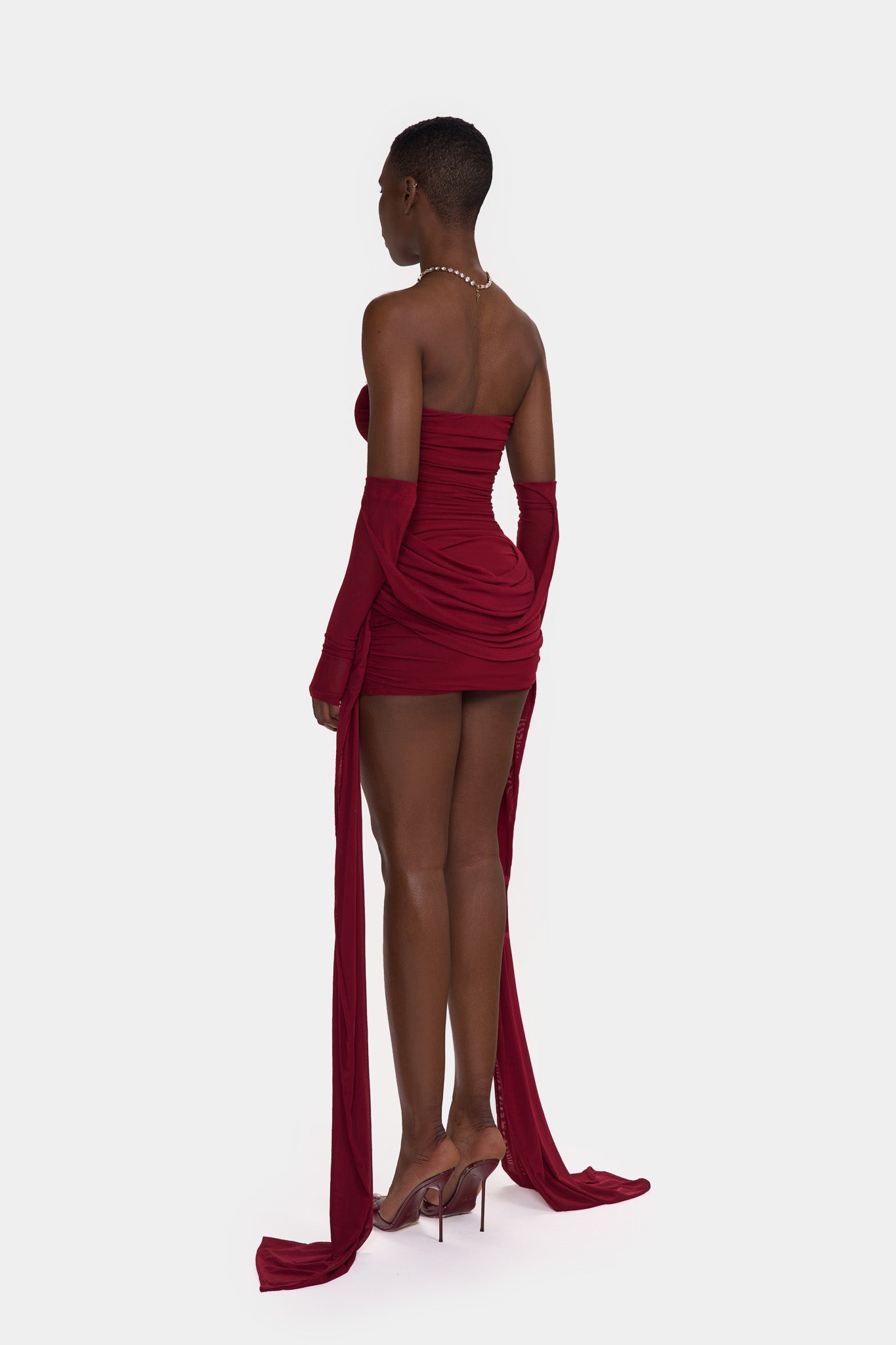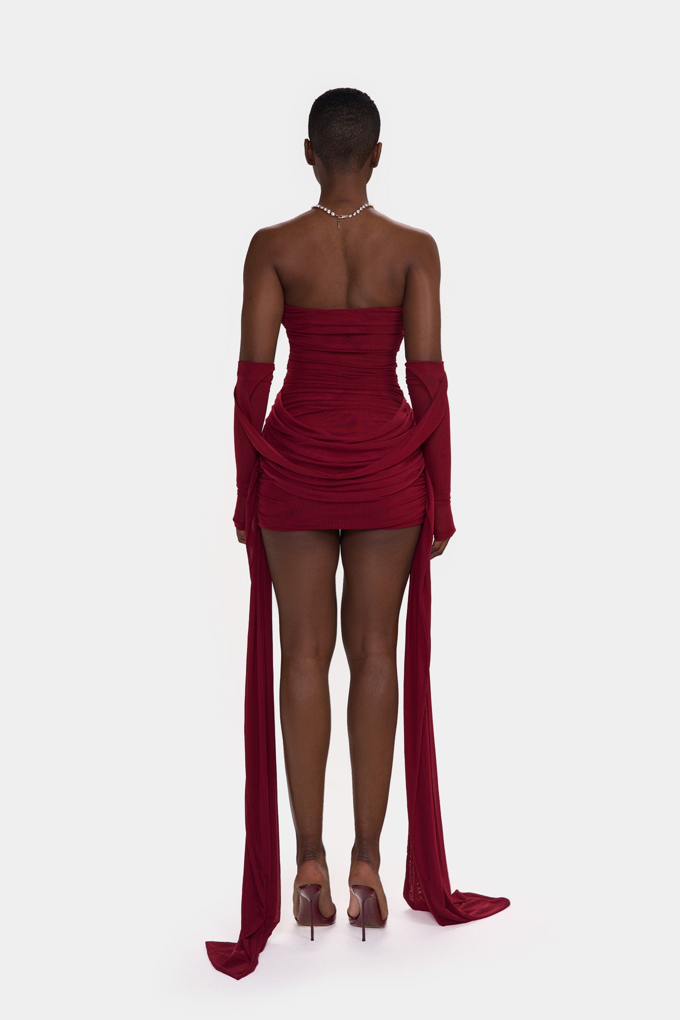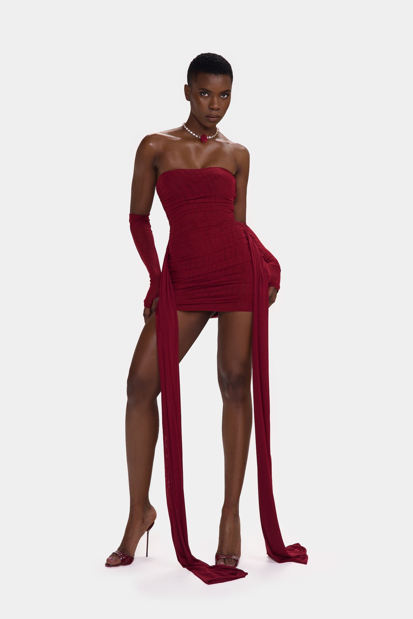 Zaya is made from a super soft, stretchy double layered mesh. With exaggerated ruching though out and floor length side straps, she is the perfect, versatile, stand-out mini that will get everyones attention in the room!
