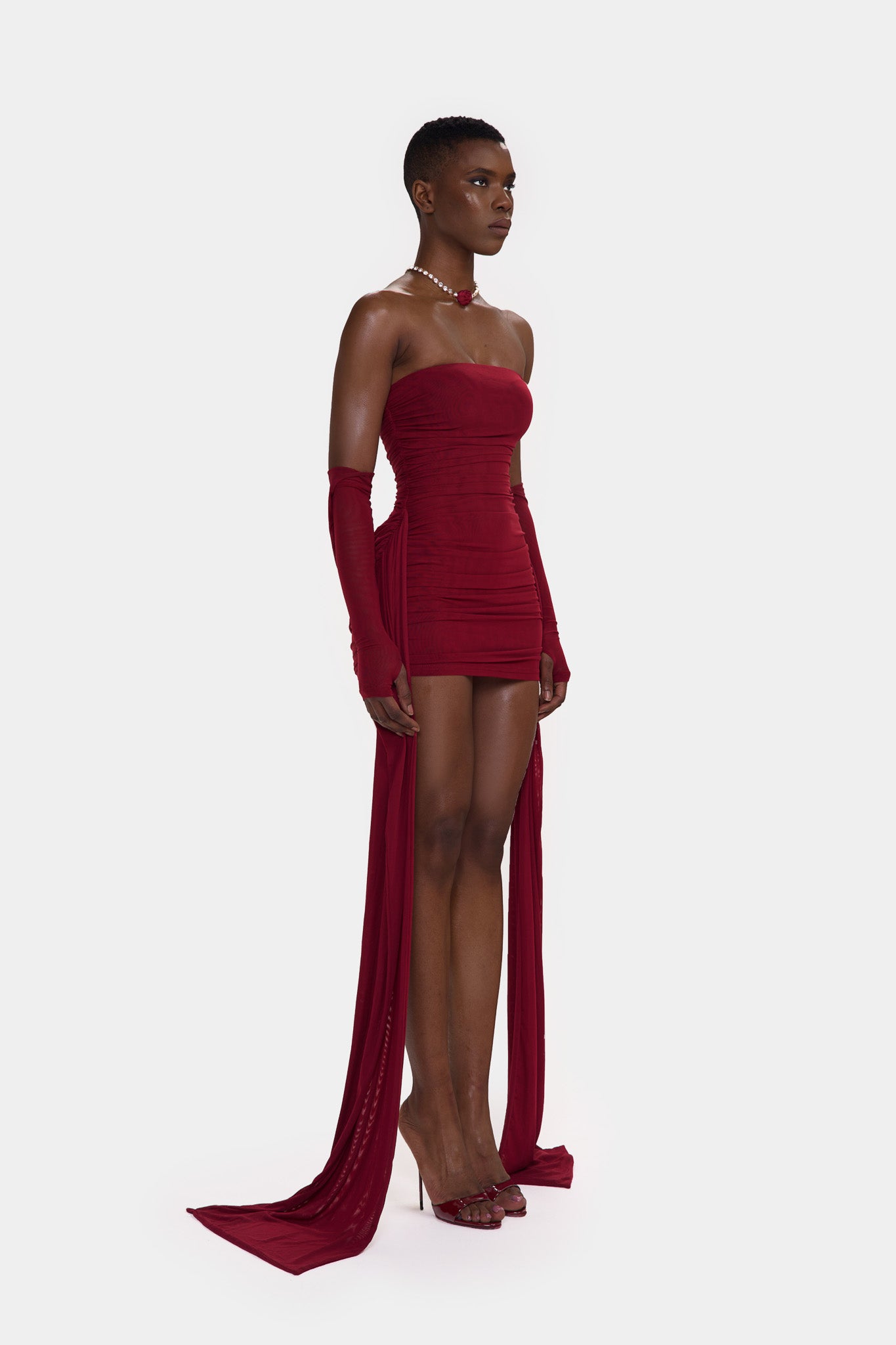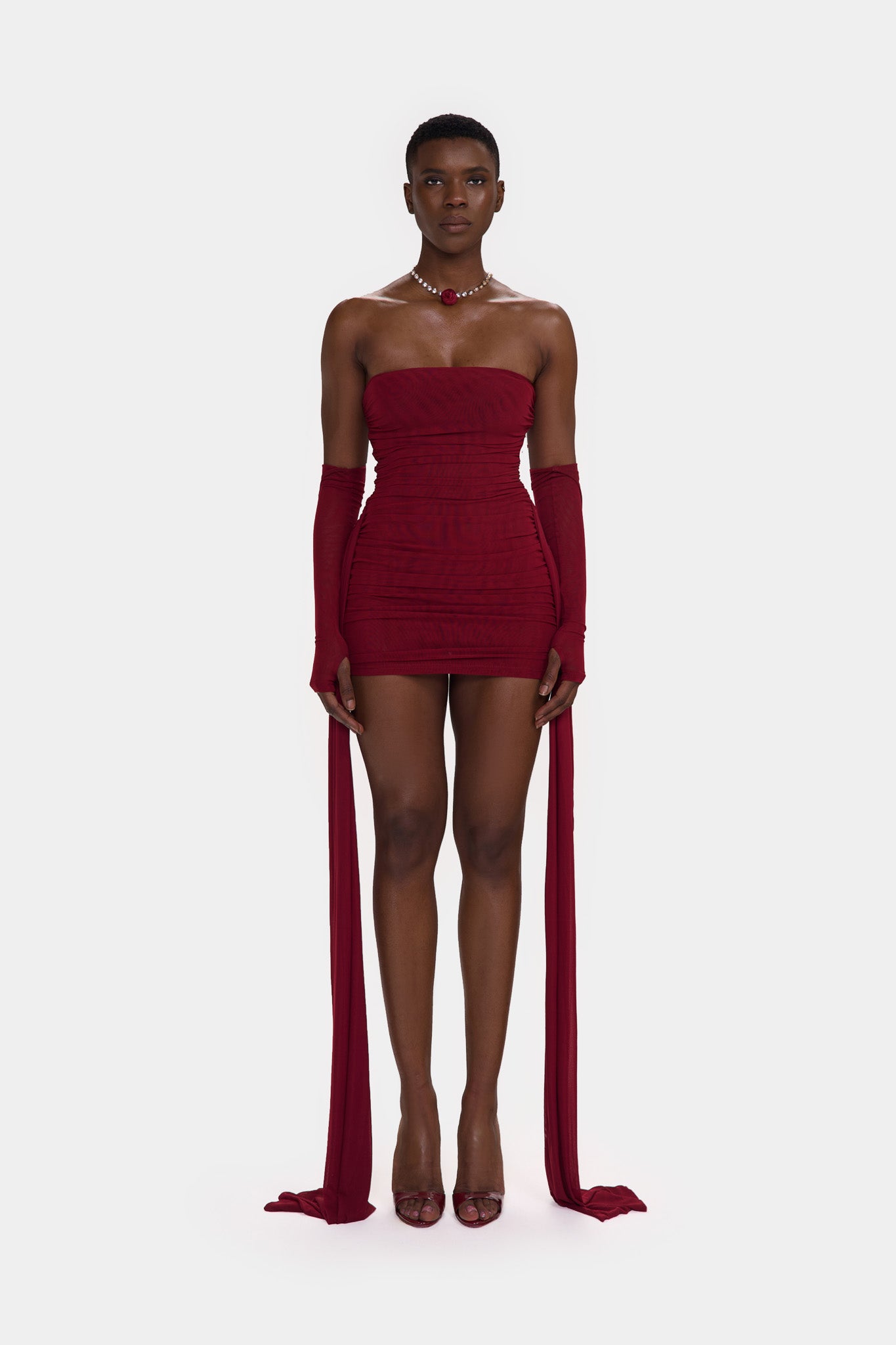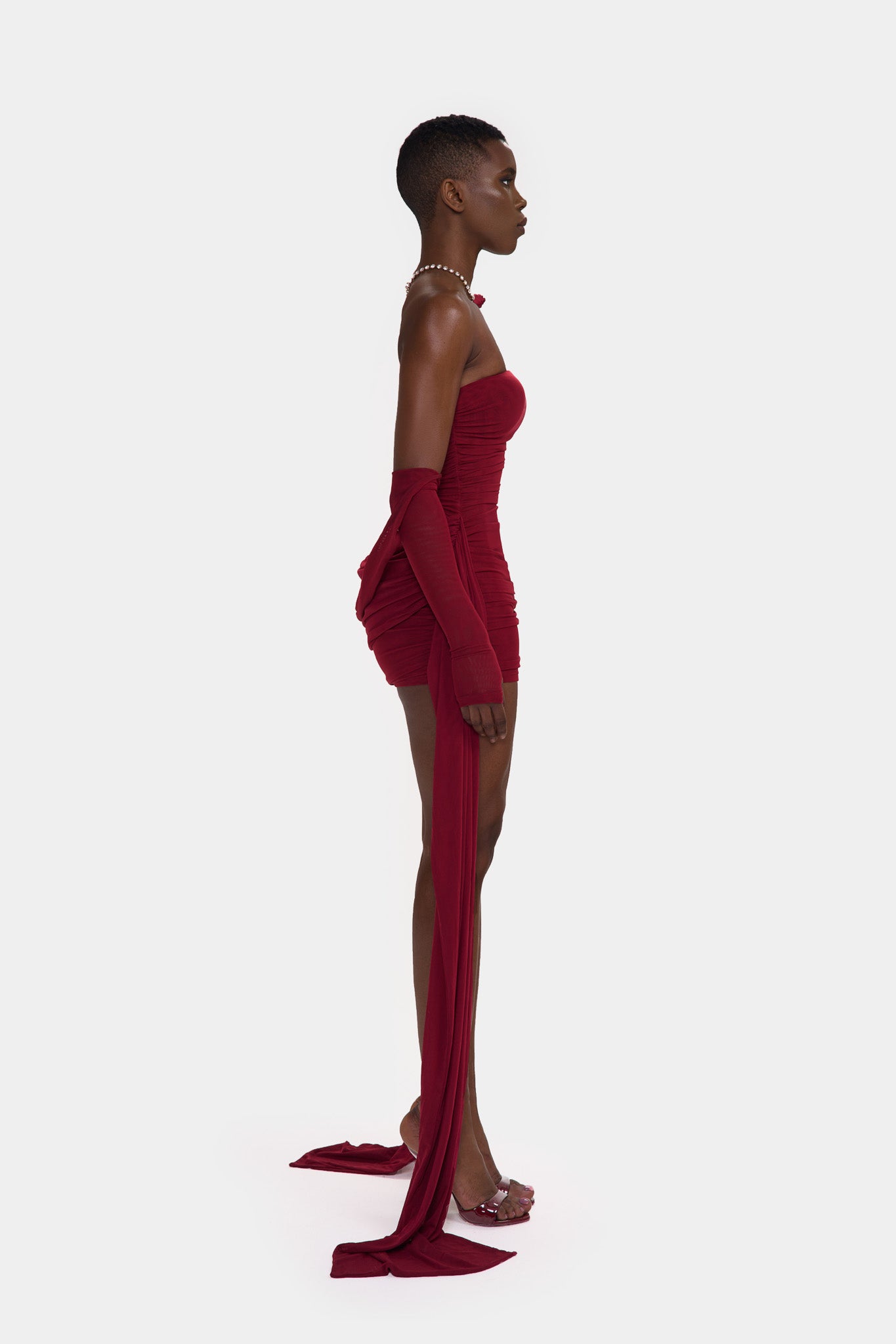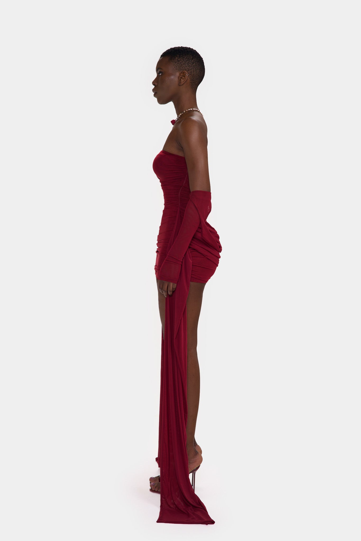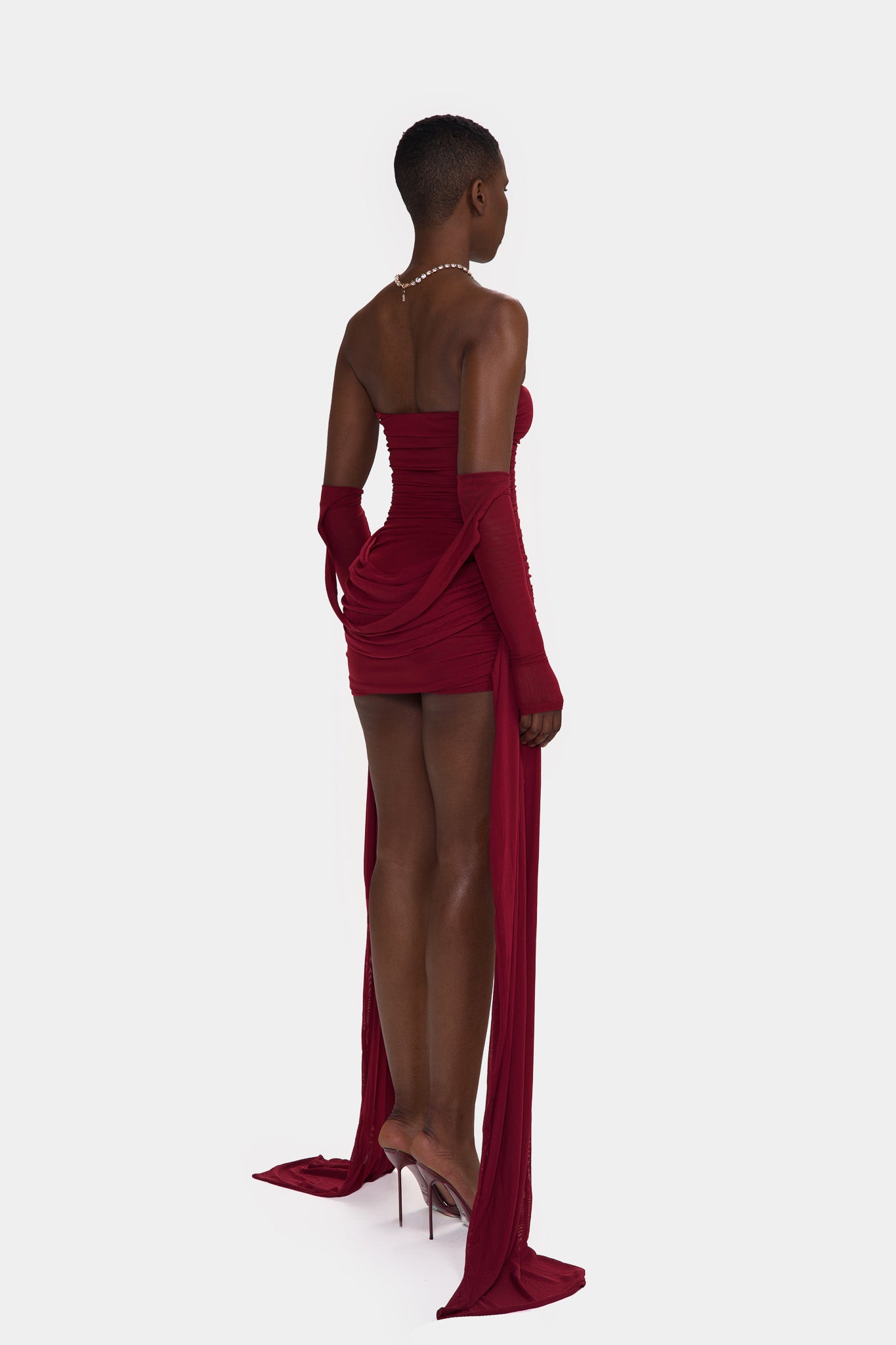 Zaya is made from a super soft, stretchy double layered mesh. With exaggerated ruching though out and floor length side straps, she is the perfect, versatile, stand-out mini that will get everyones attention in the room!