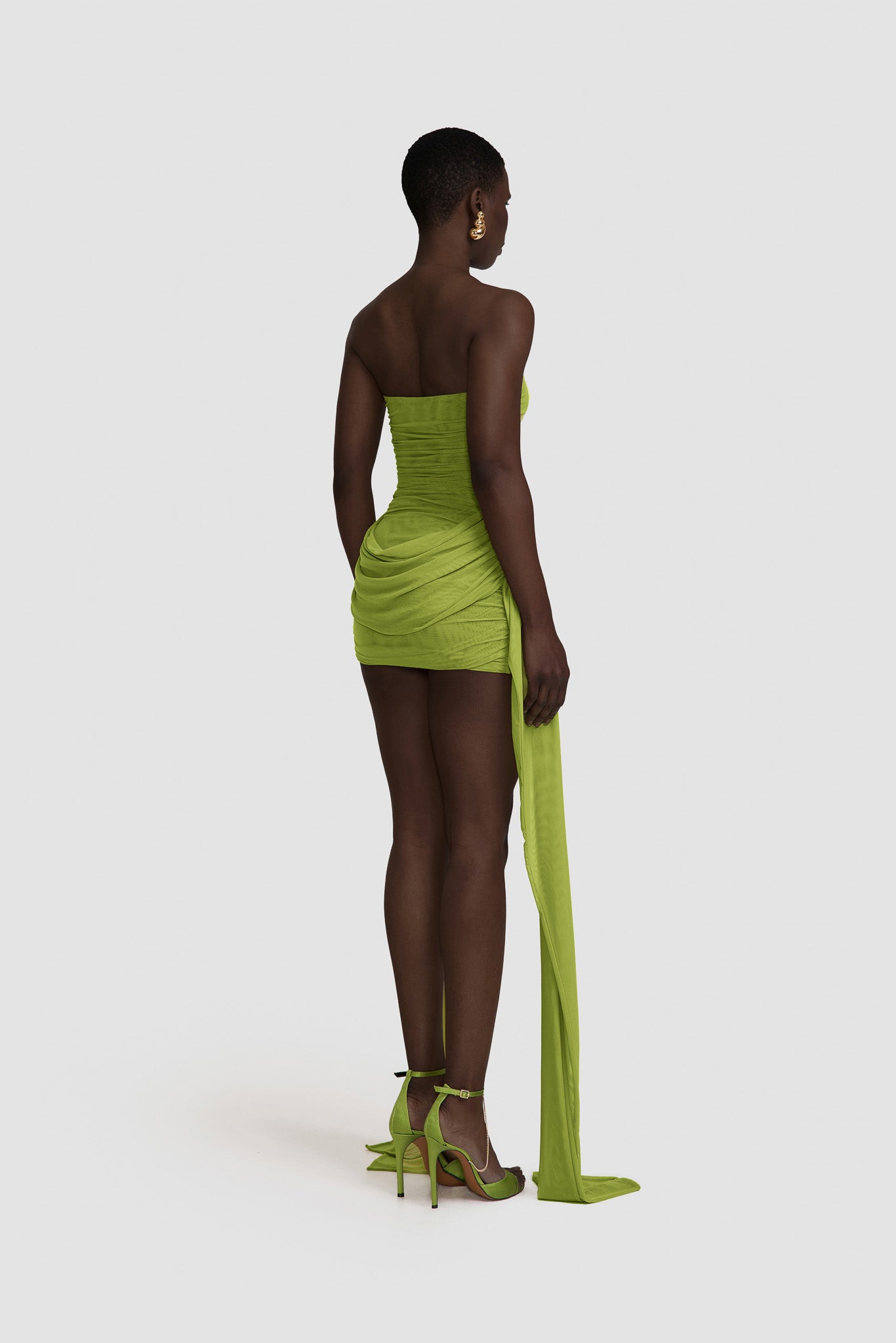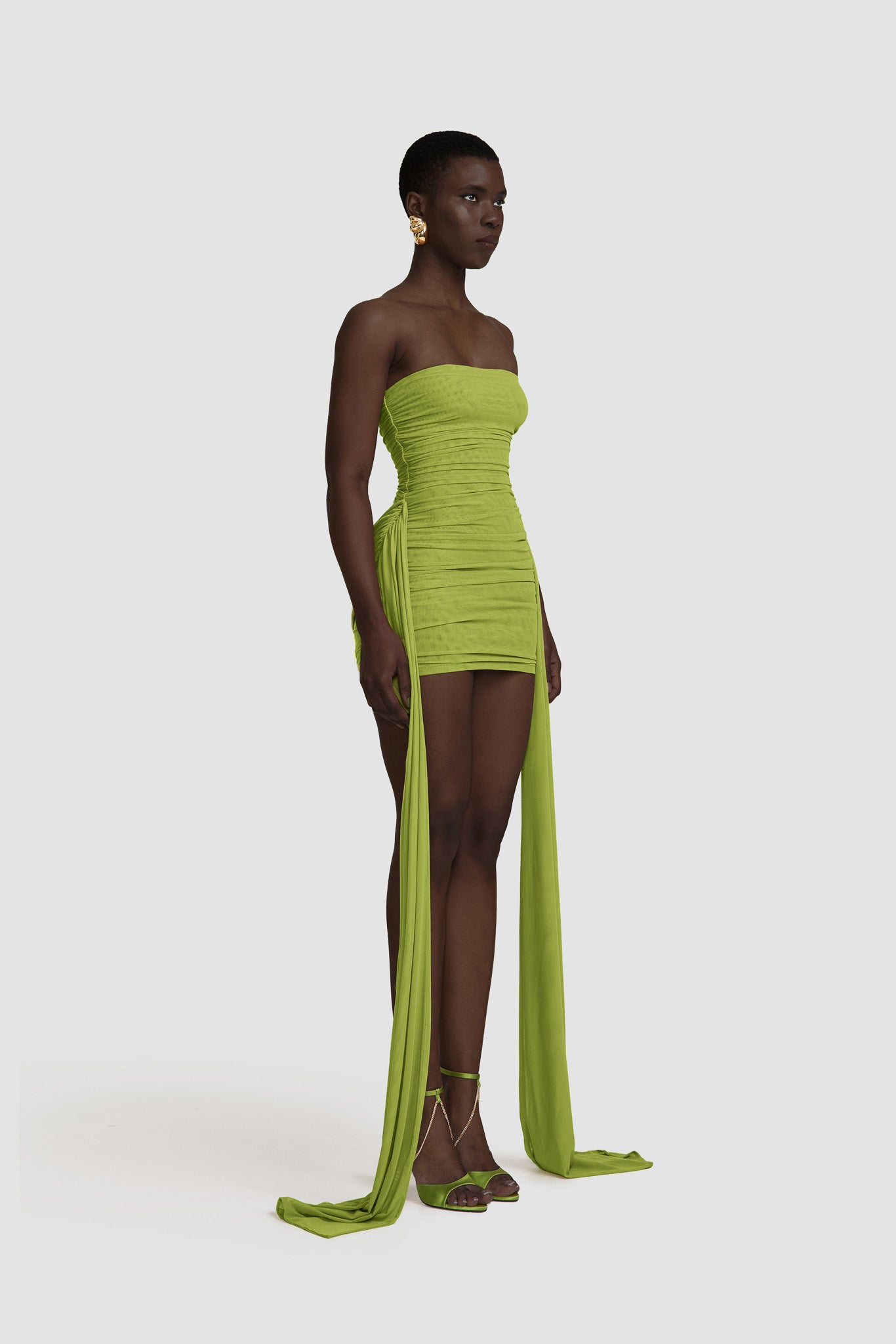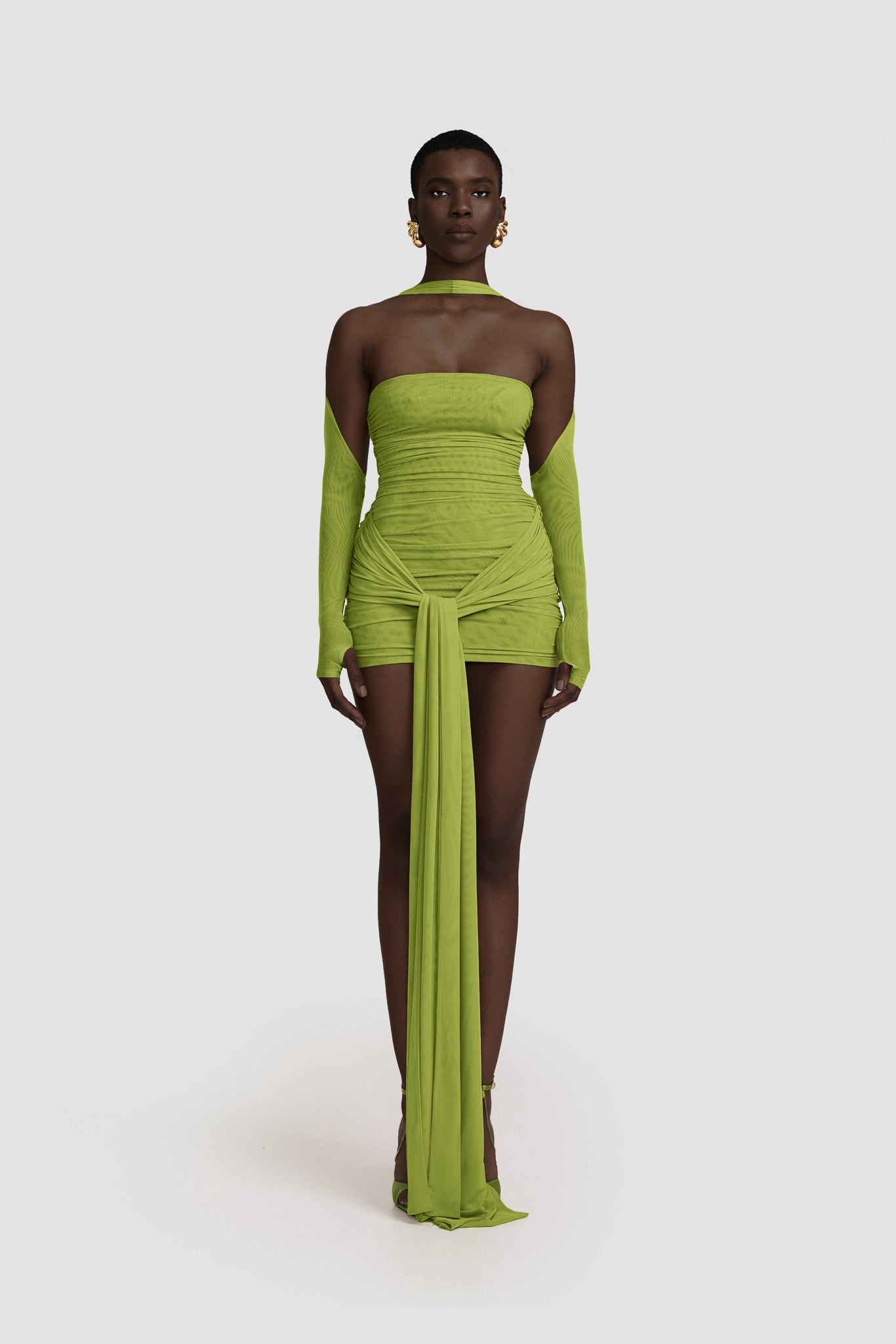 Zaya is made from a super soft, stretchy double layered mesh. With exaggerated ruching though out and floor length side straps, she is the perfect, versatile, stand-out mini that will get everyones attention in the room!
