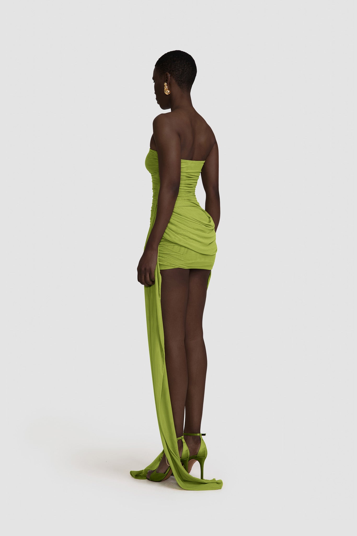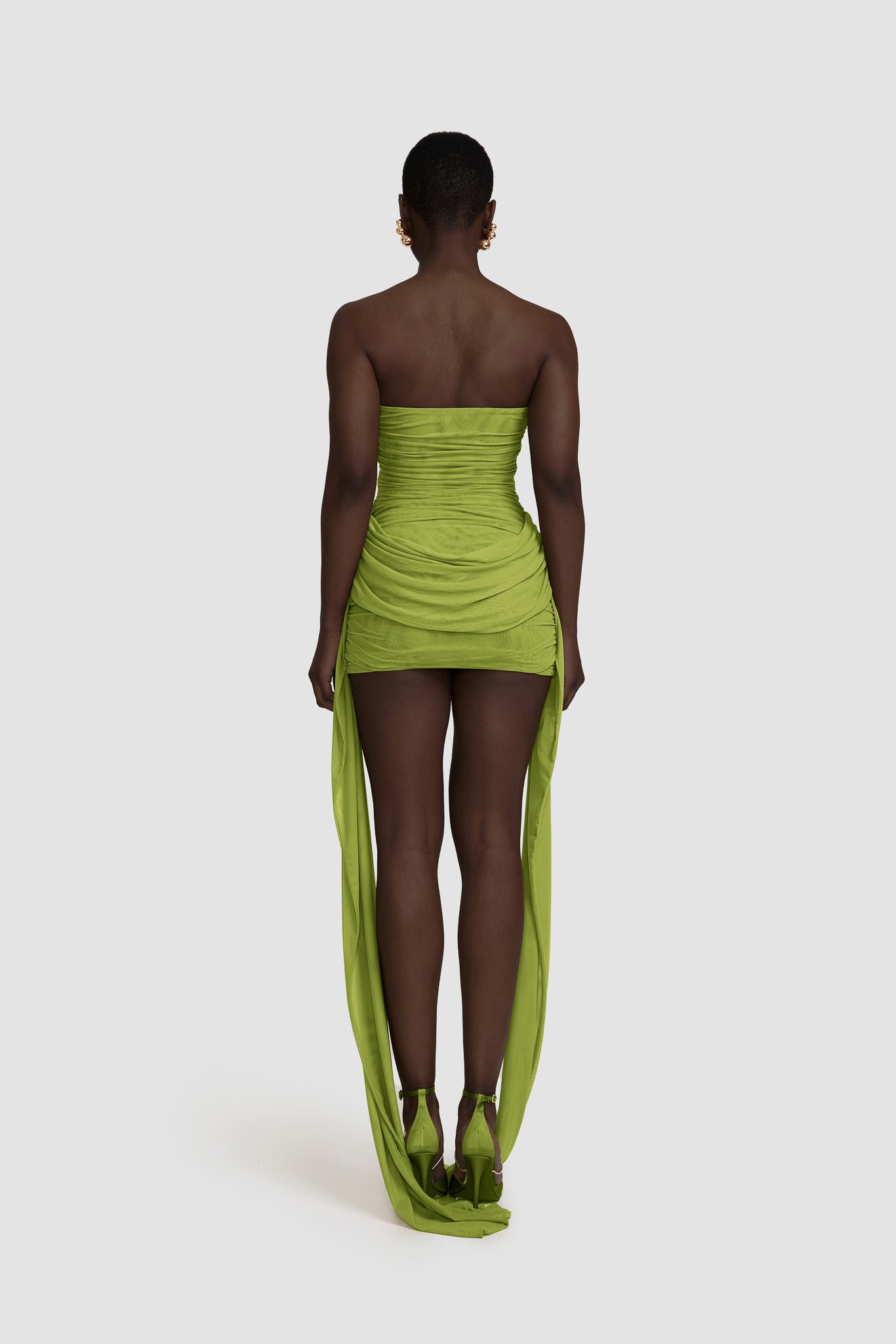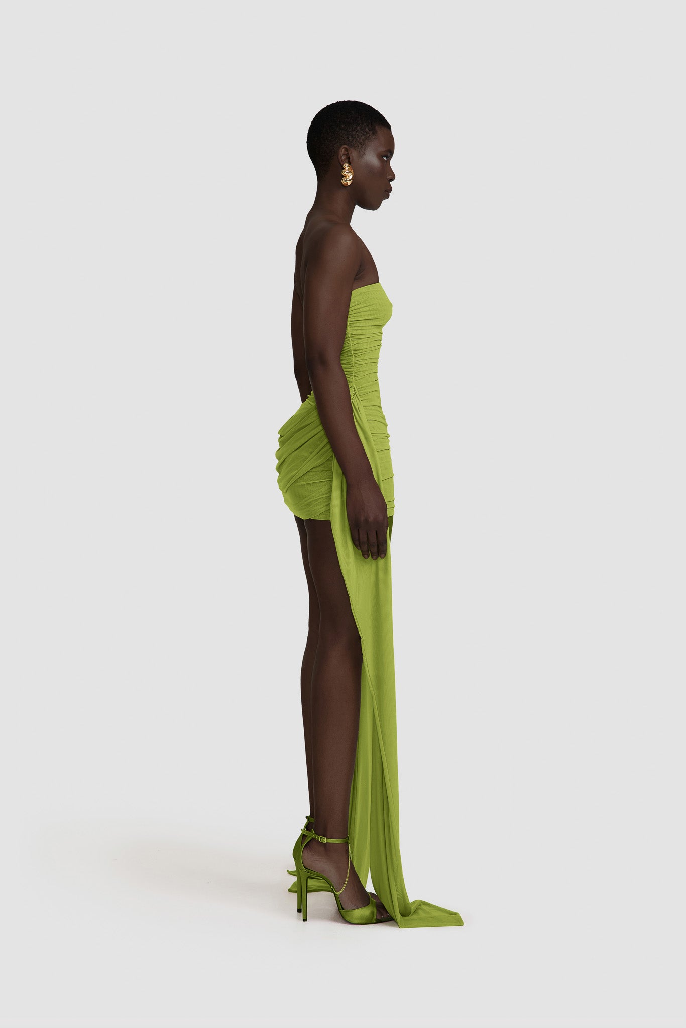 Zaya is made from a super soft, stretchy double layered mesh. With exaggerated ruching though out and floor length side straps, she is the perfect, versatile, stand-out mini that will get everyones attention in the room!