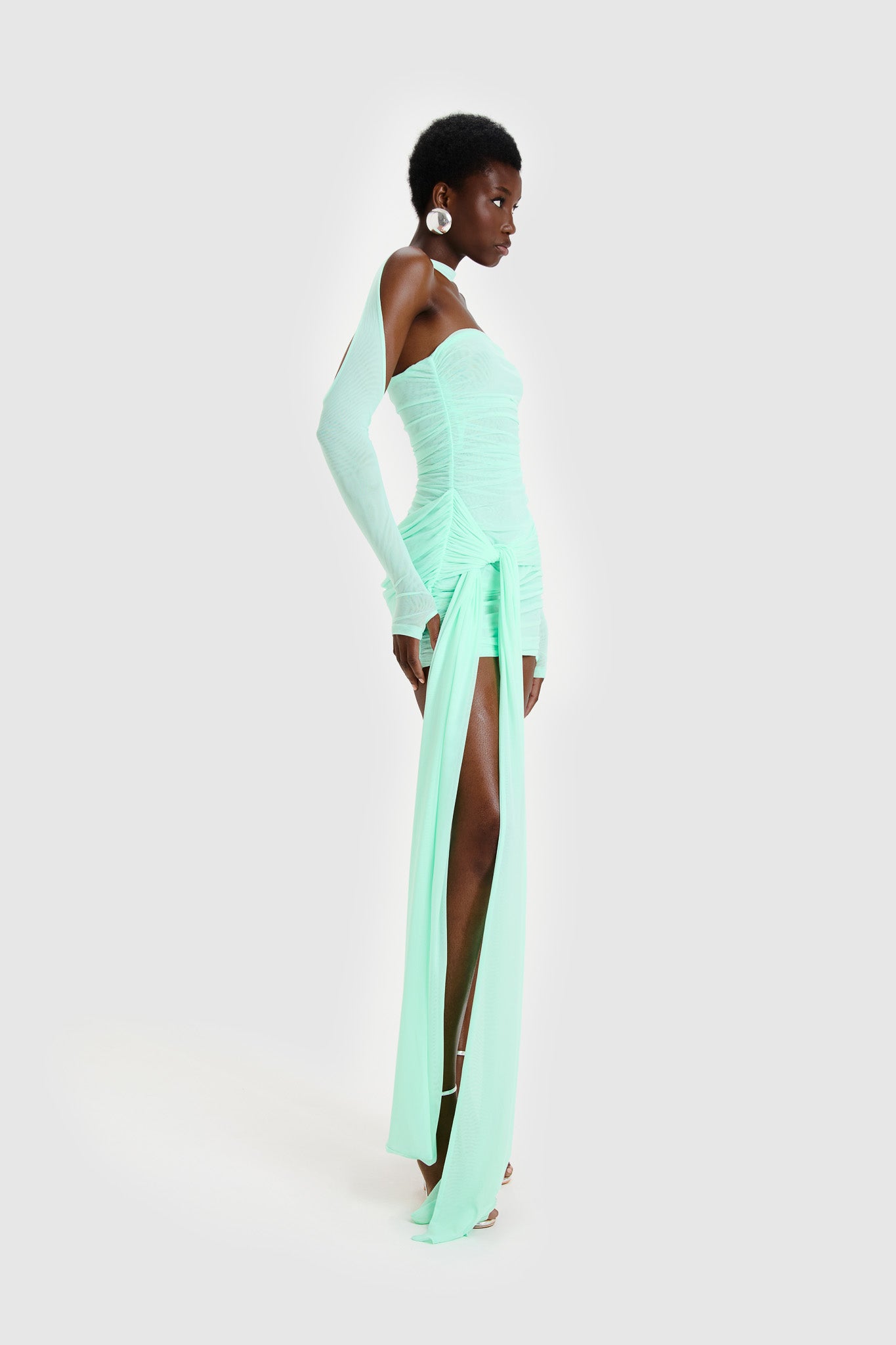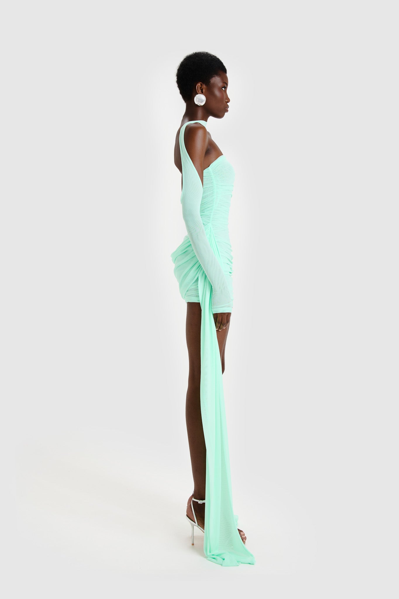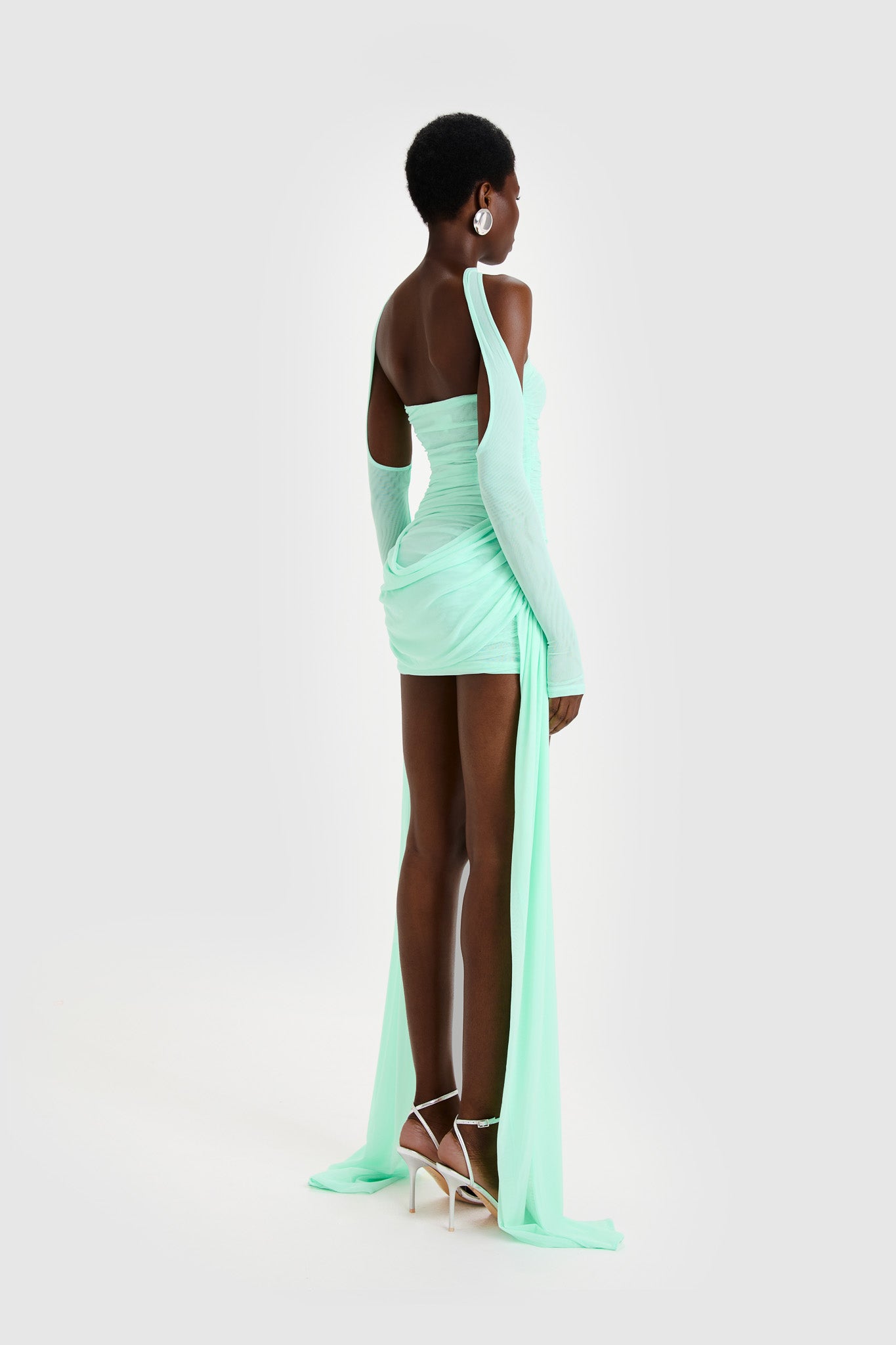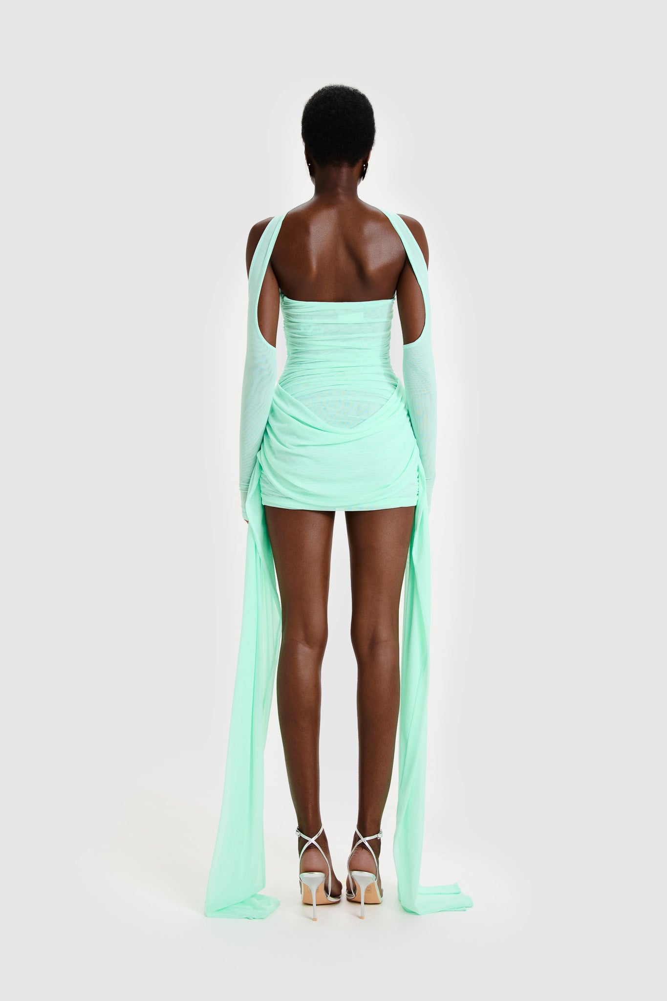 Zaya is made from a super soft, stretchy double layered mesh. With exaggerated ruching though out and floor length side straps, she is the perfect, versatile, stand-out mini that will get everyones attention in the room!