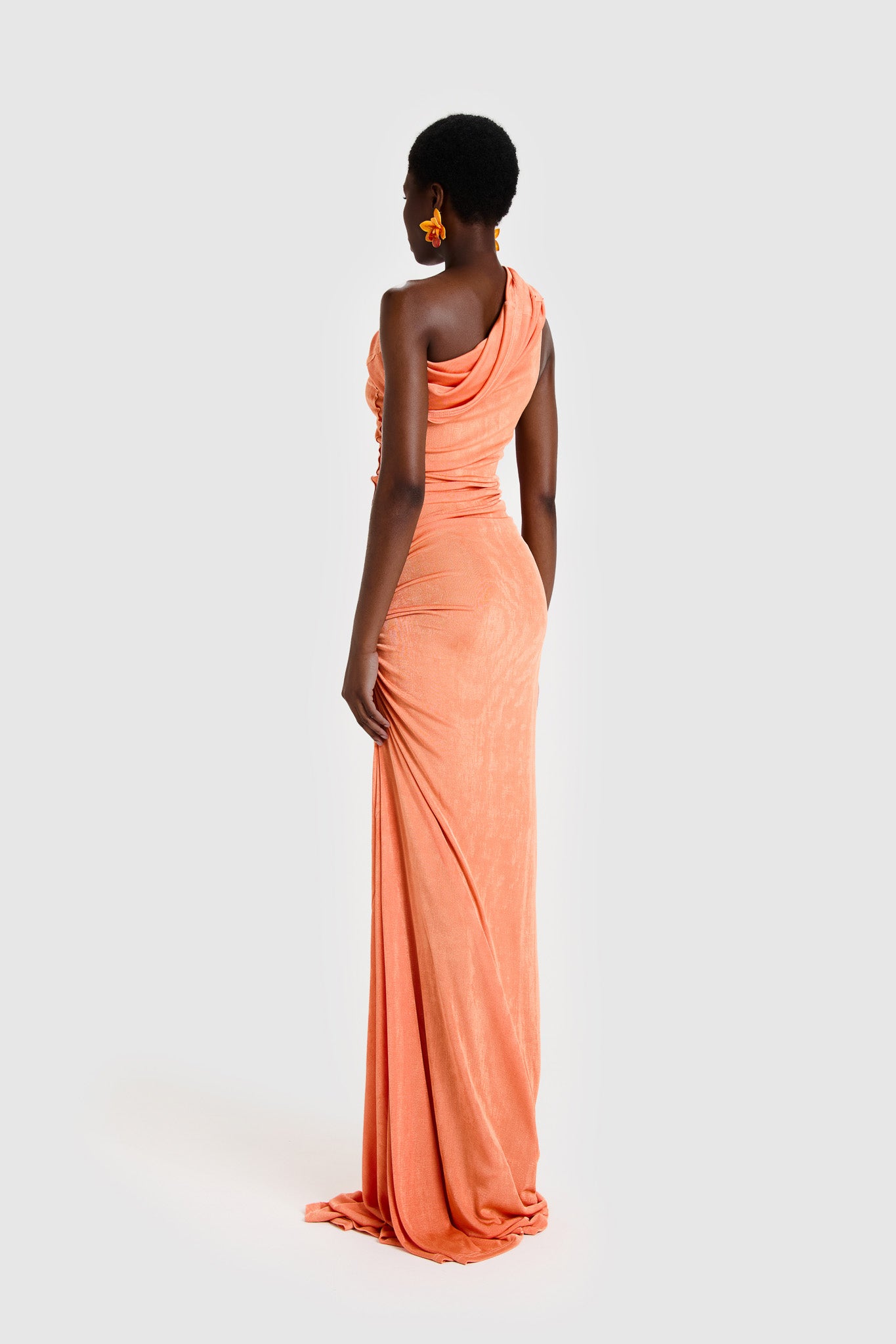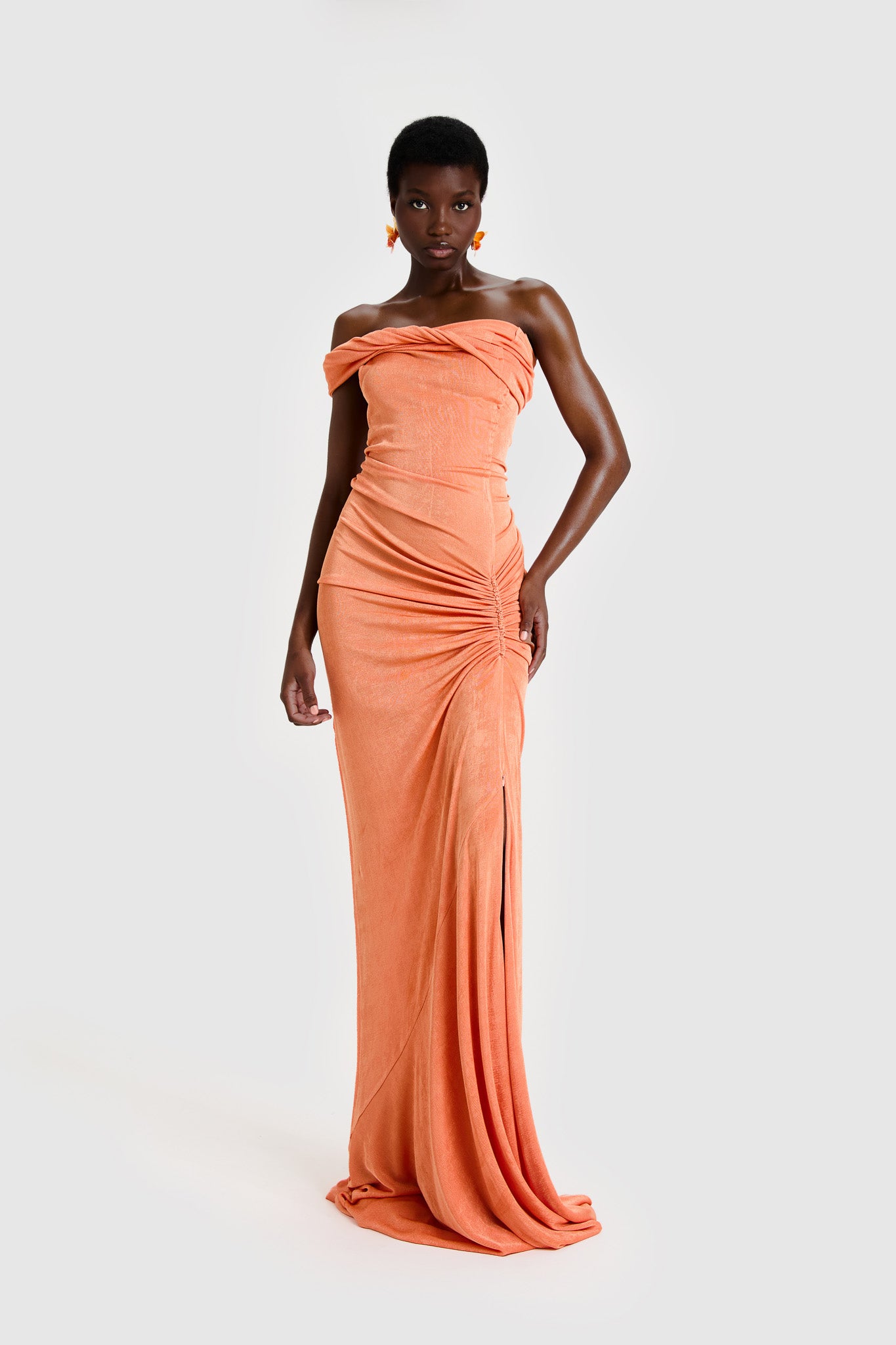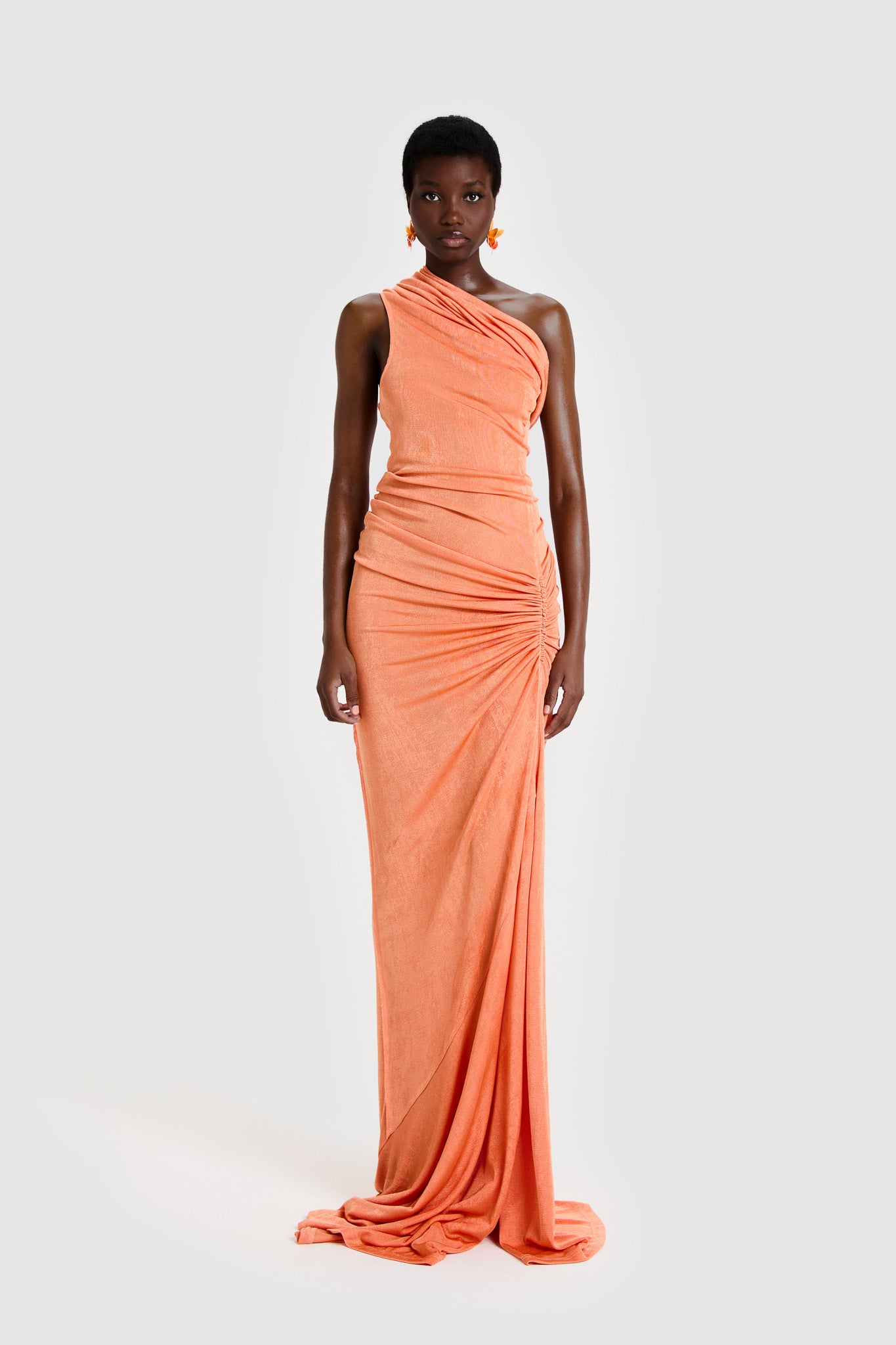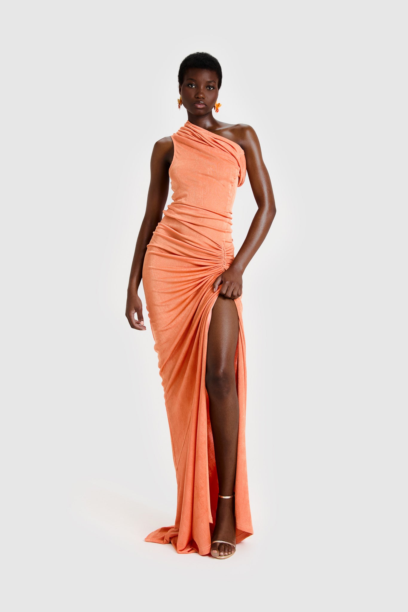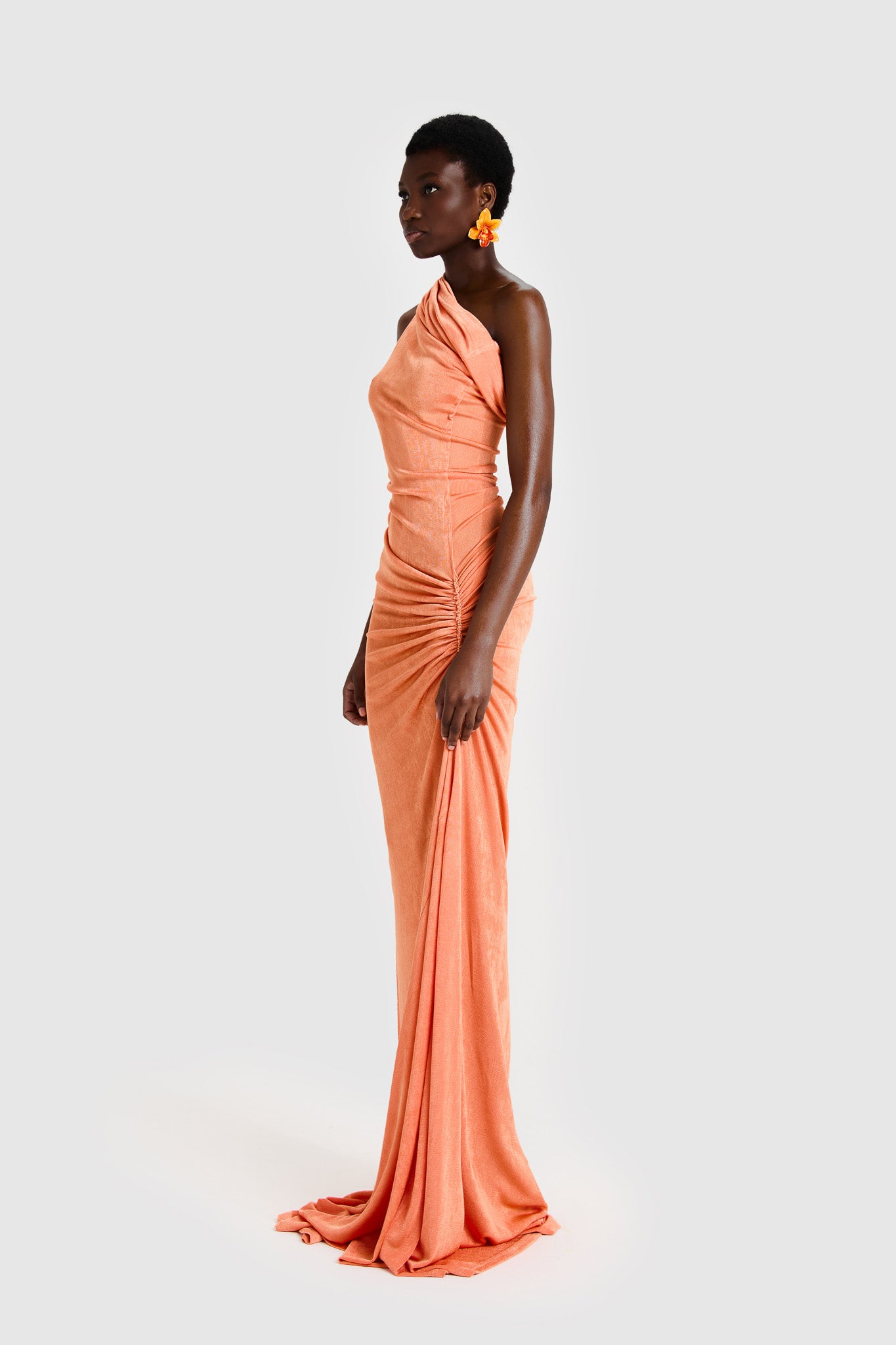 Made from a soft kitted fabric, this asymmetric style dress is the perfect contemporary maxi dress. With an elongated slanted neckline that can be worn in different ways, create a style that suits you. Constructed with raw edge detailing for an unfinished look, ruching throughout to accentuate your curves and a panelled pooled hem that skims the floor.