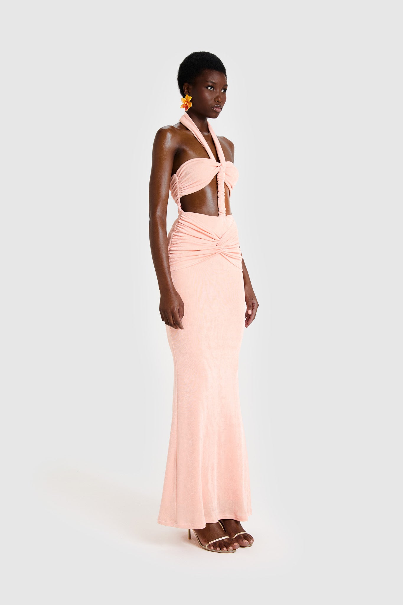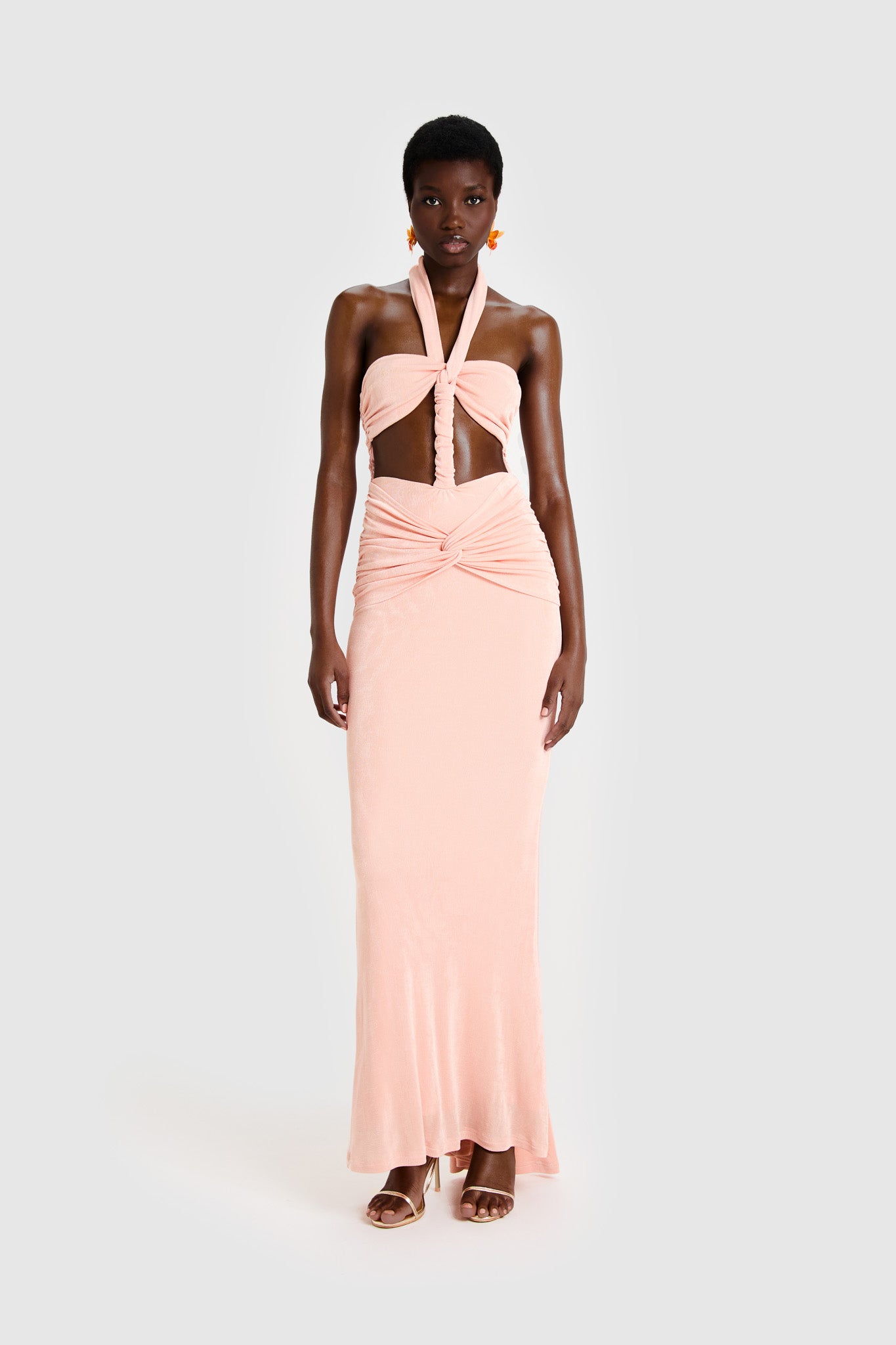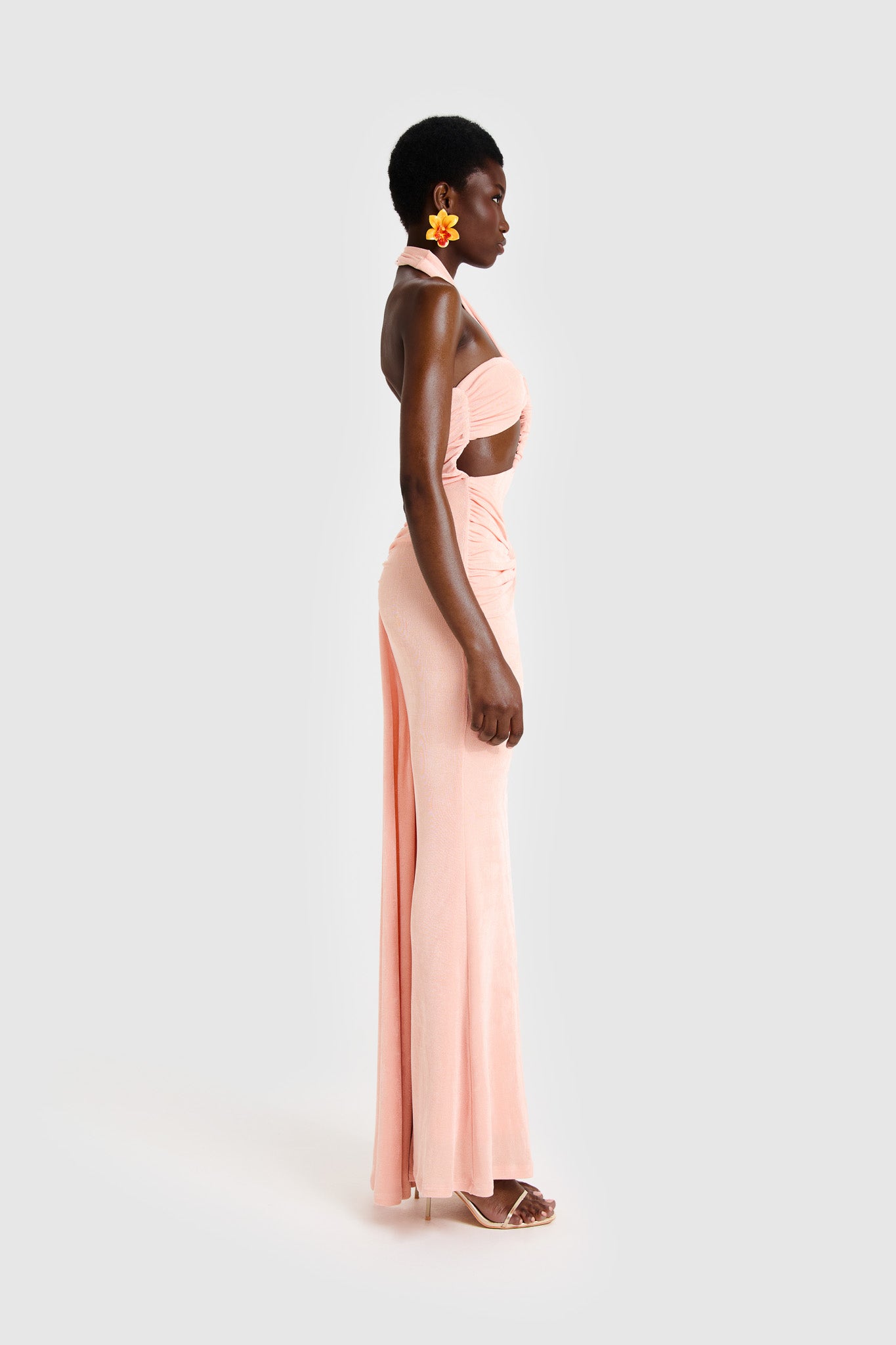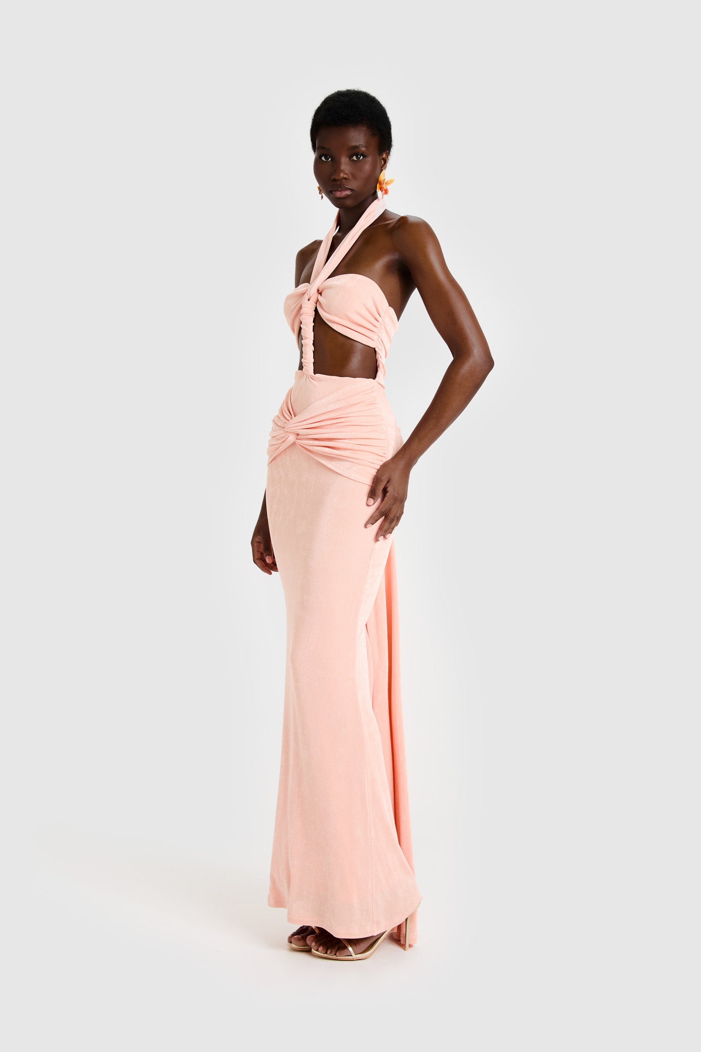 Halter dress with flared hem and ruching throughout. The mid cut-out with twisted rope detail will ensure you're turning heads at any event.