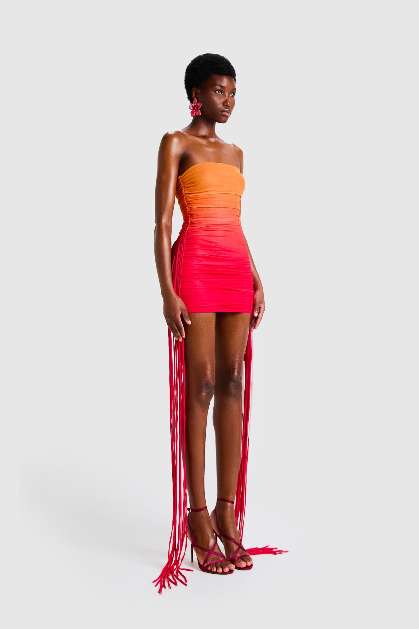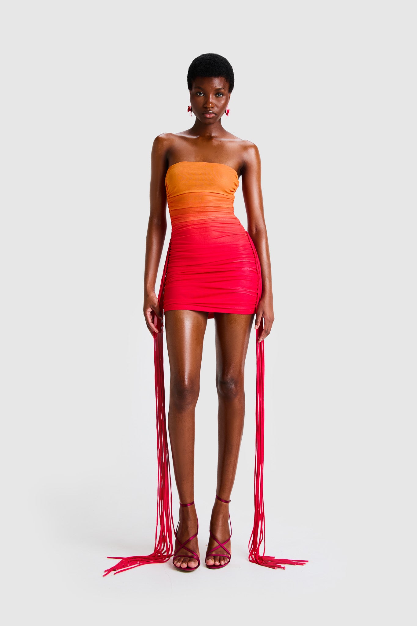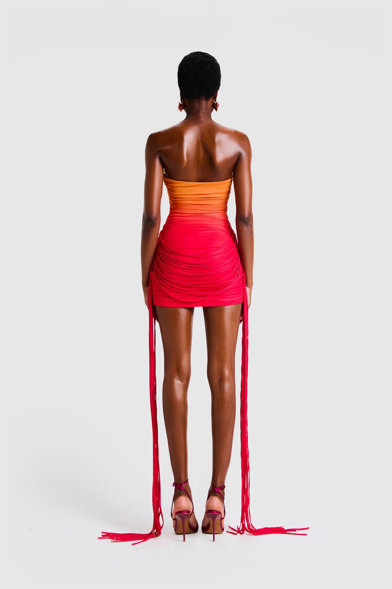 Zaya is made from a super soft, stretchy double layered mesh. With exaggerated ruching though out and floor length side straps in tassel form, she is the perfect, versatile, stand-out mini that will get everyones attention in the room!