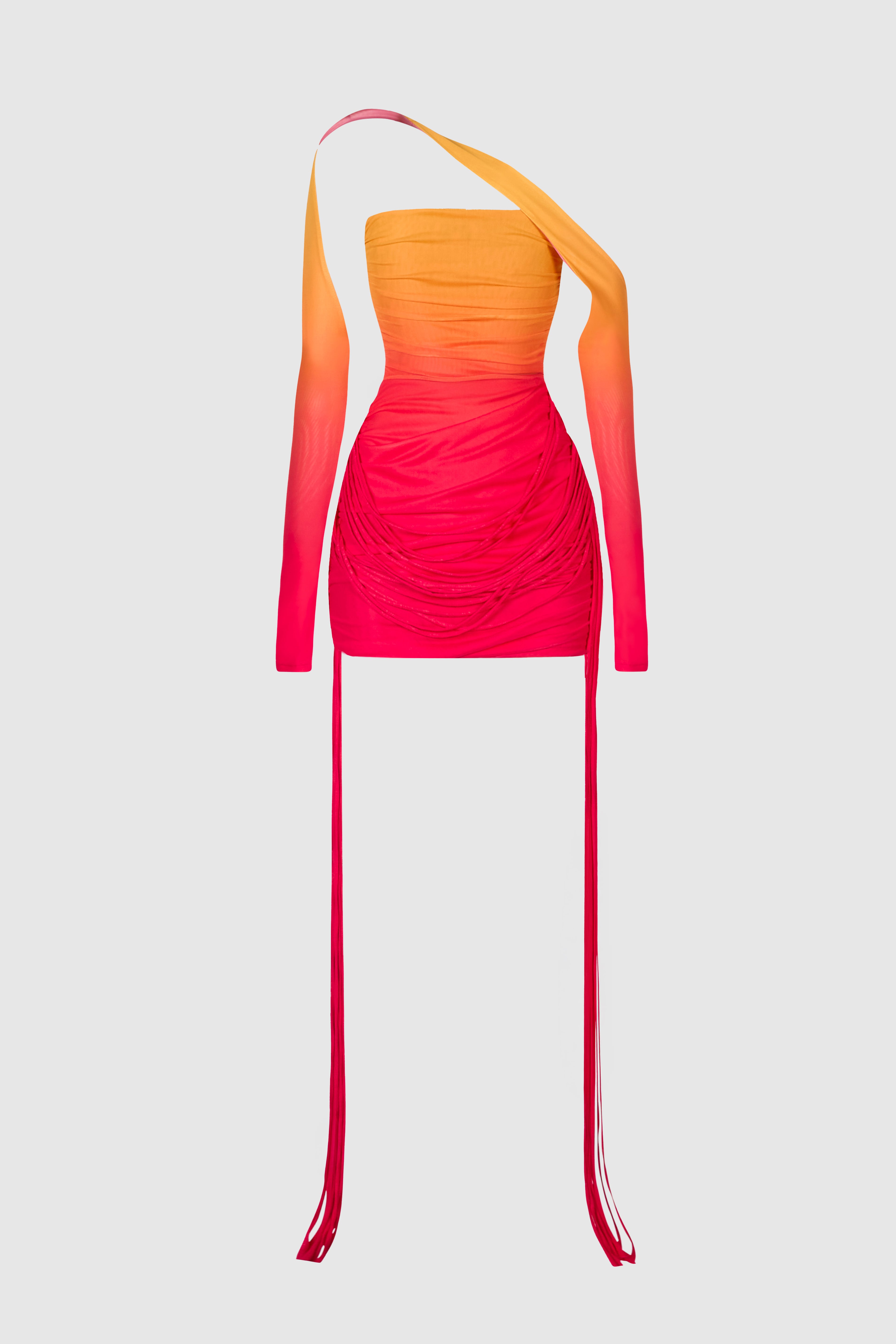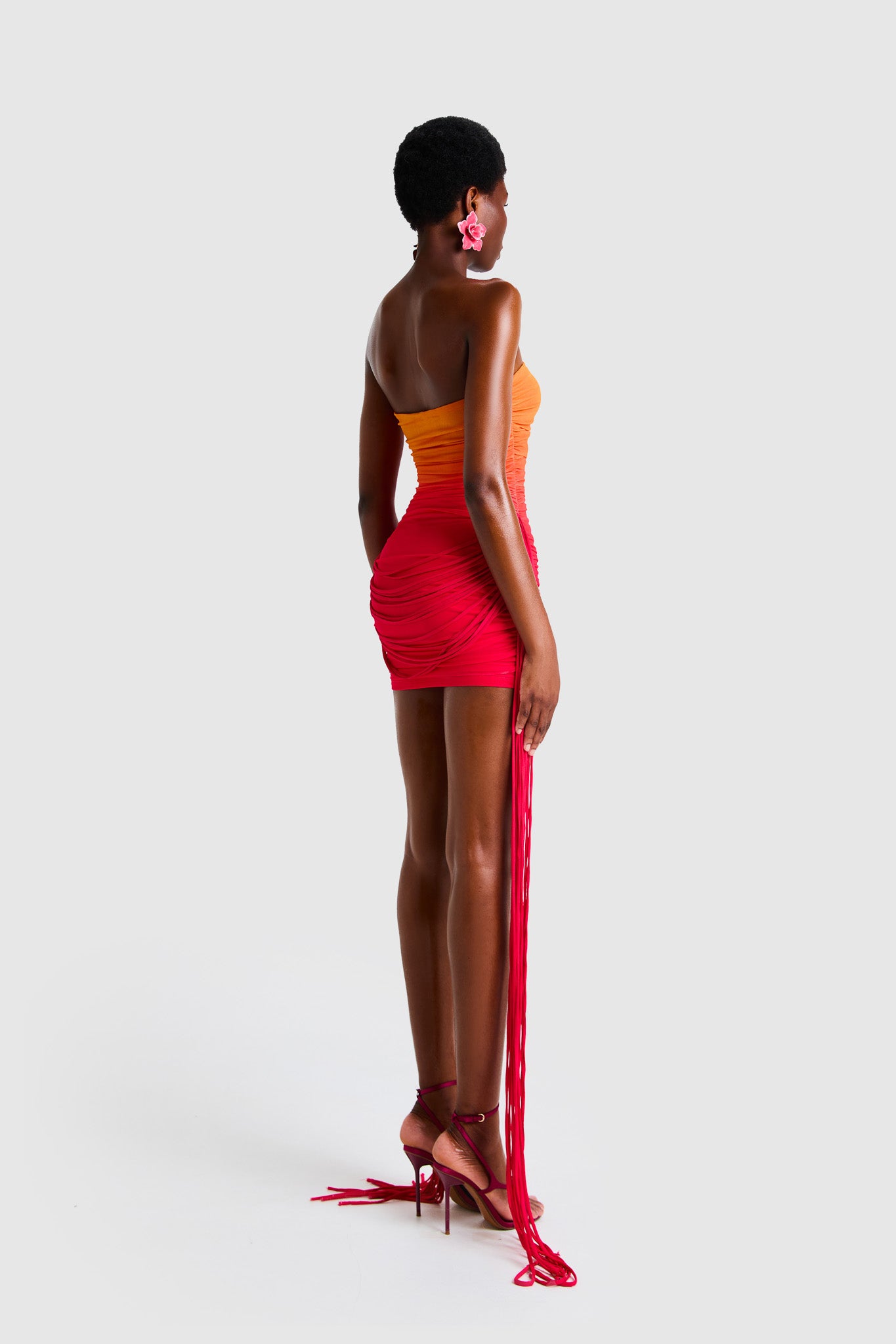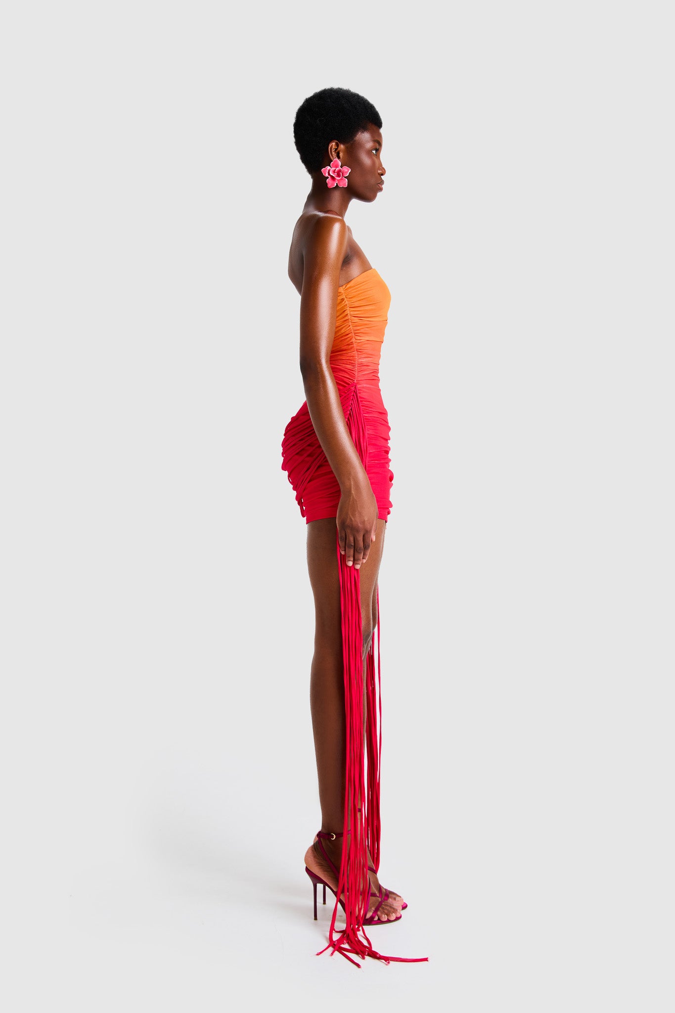 Zaya is made from a super soft, stretchy double layered mesh. With exaggerated ruching though out and floor length side straps in tassel form, she is the perfect, versatile, stand-out mini that will get everyones attention in the room!