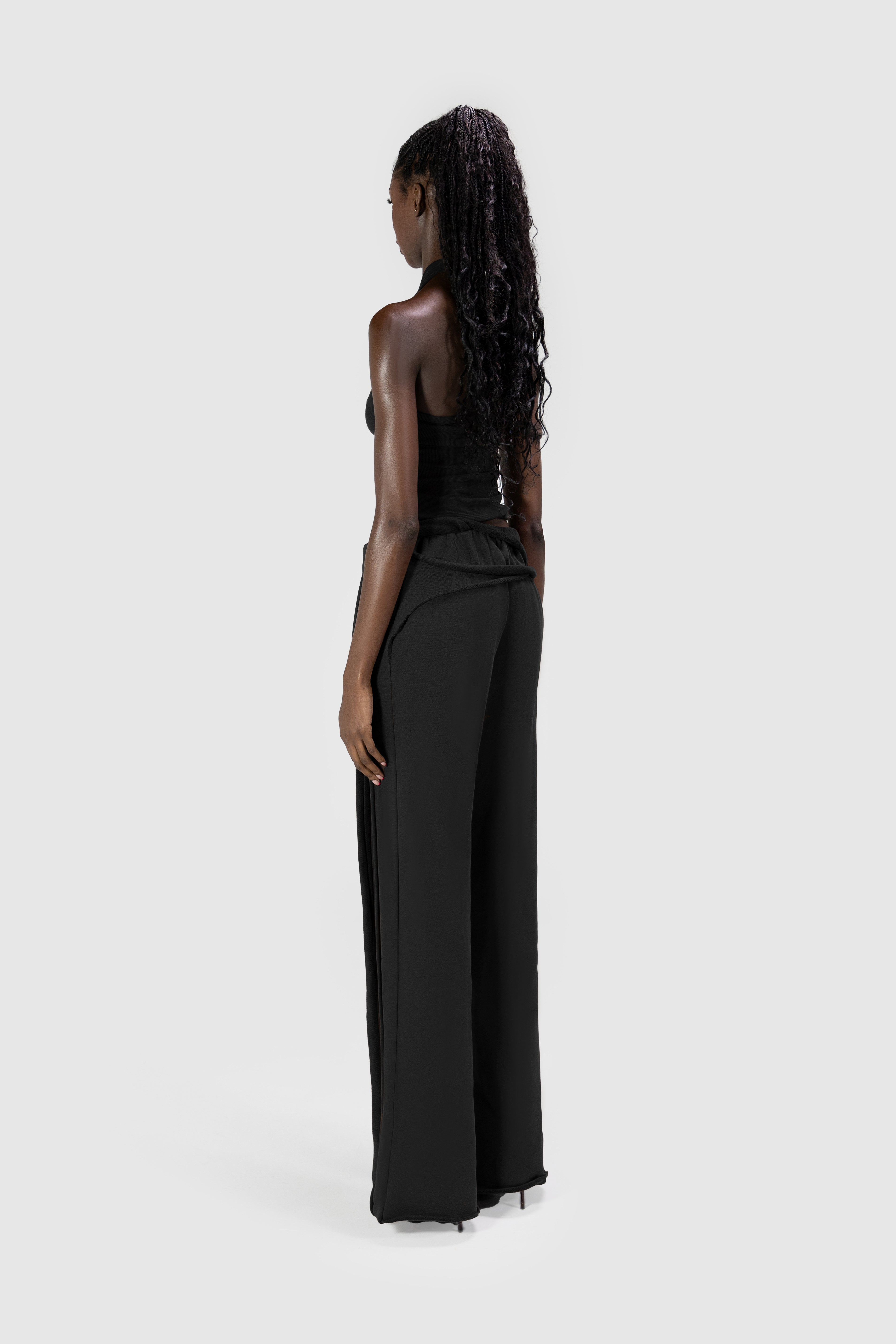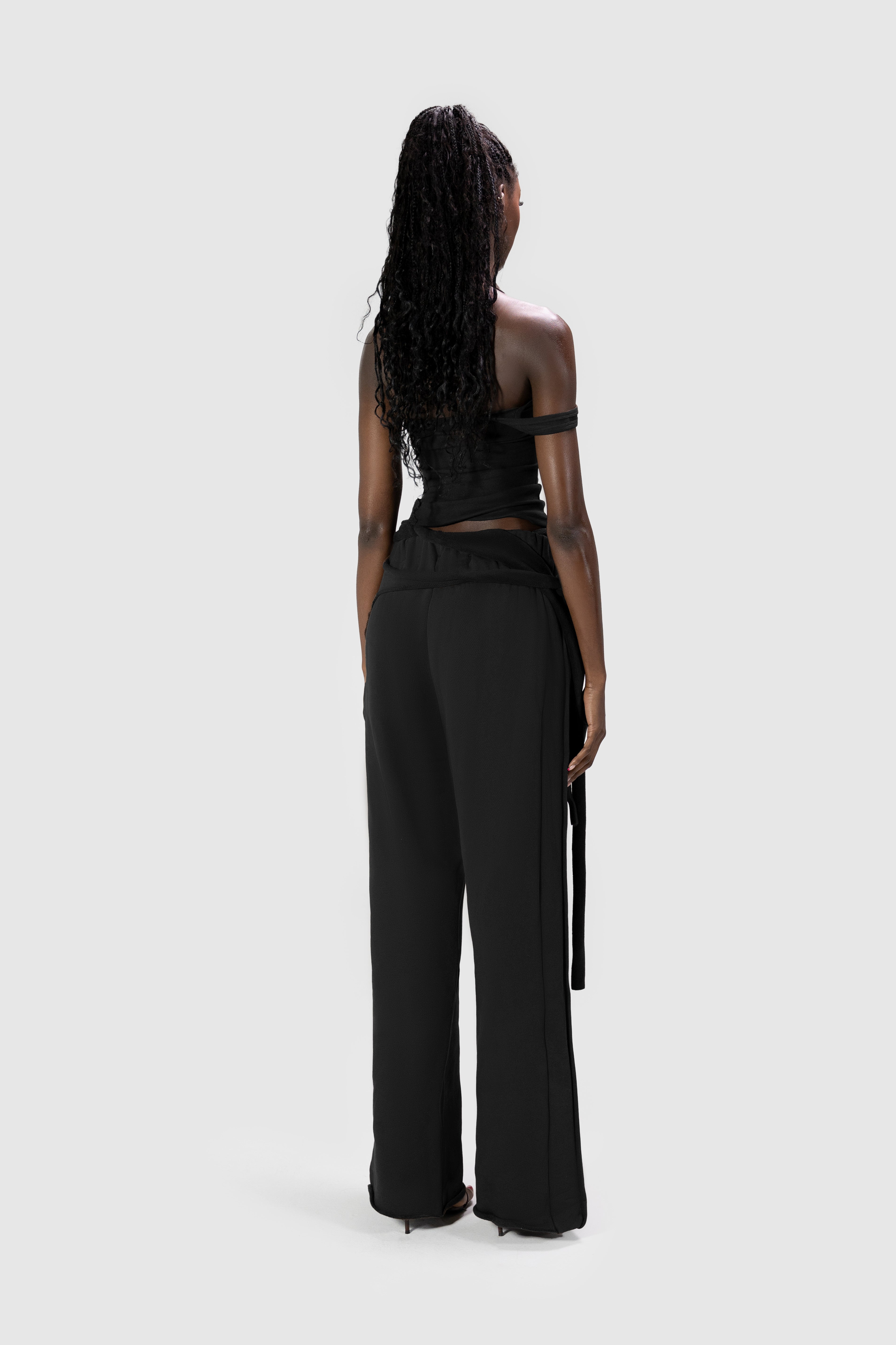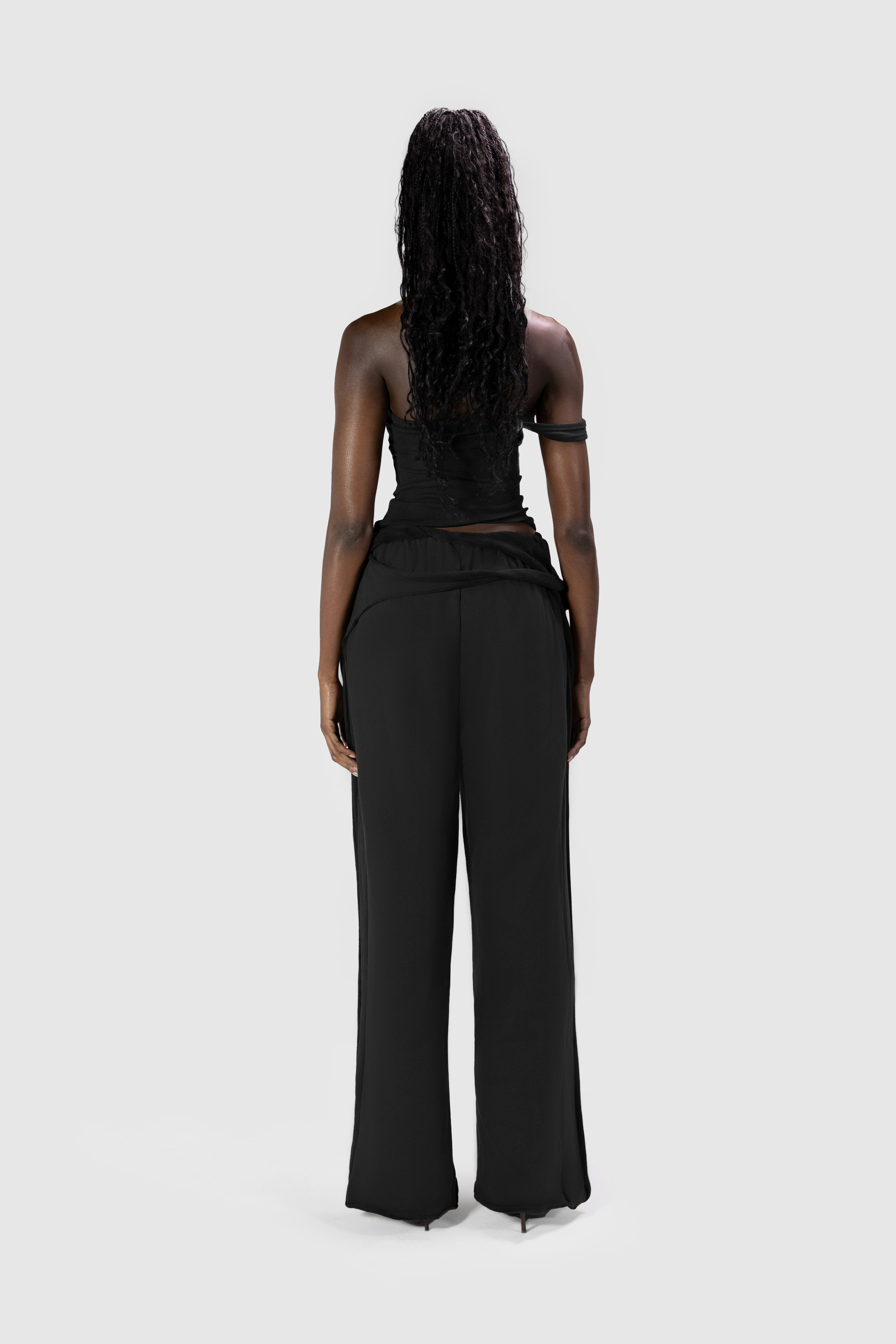 Wrapped panel wide leg joggers with raw edge seams and high waist. Easy cut to shorten length.