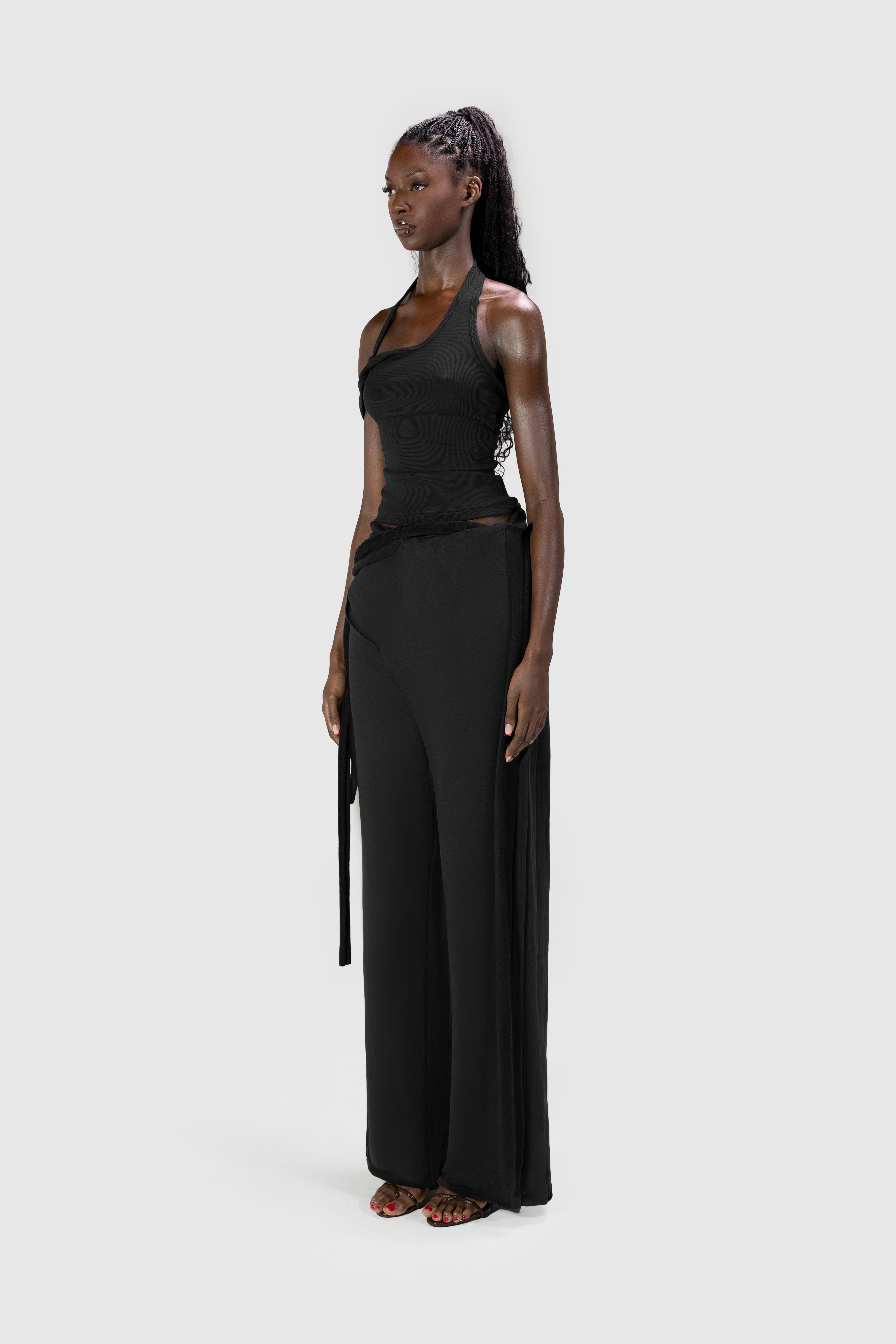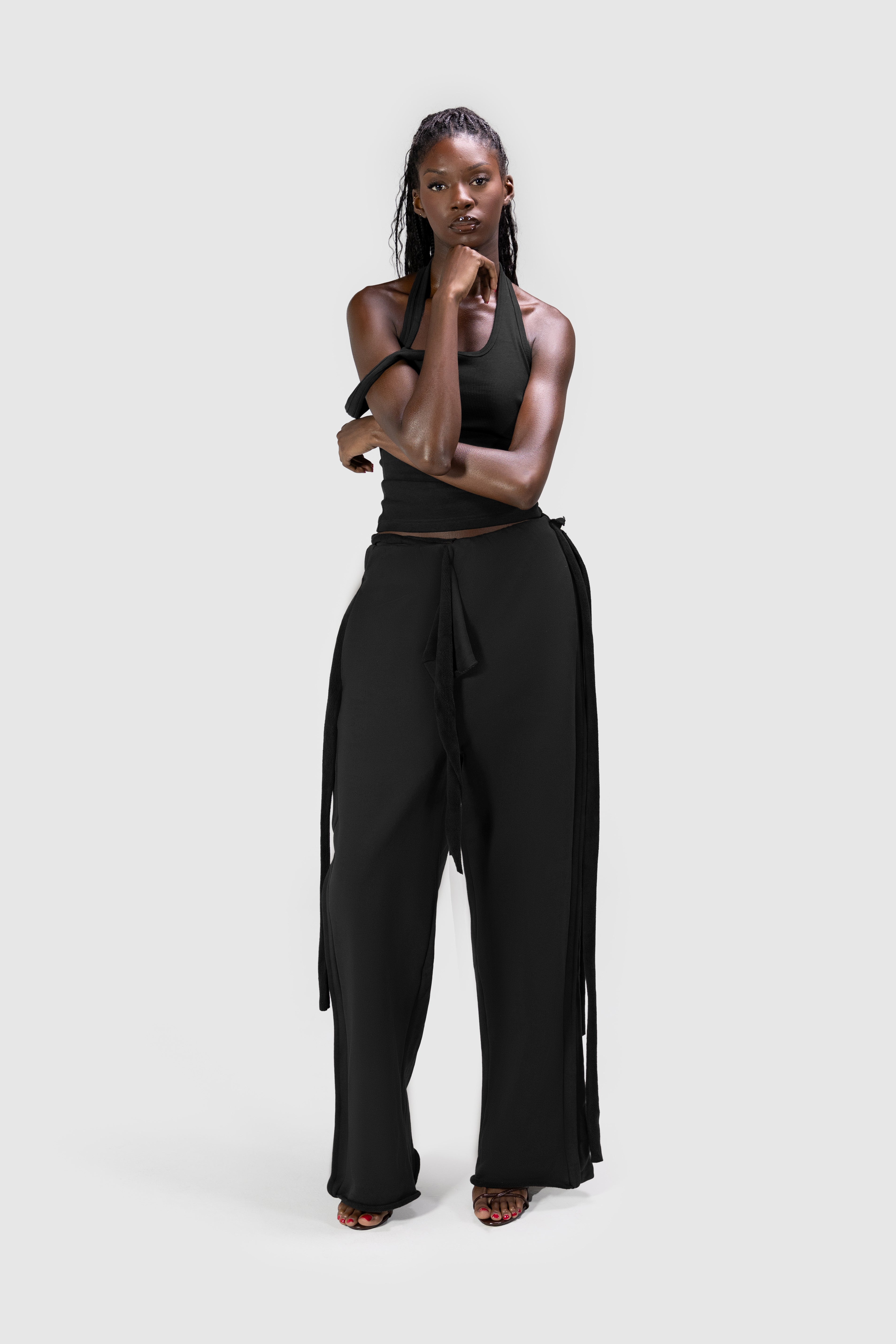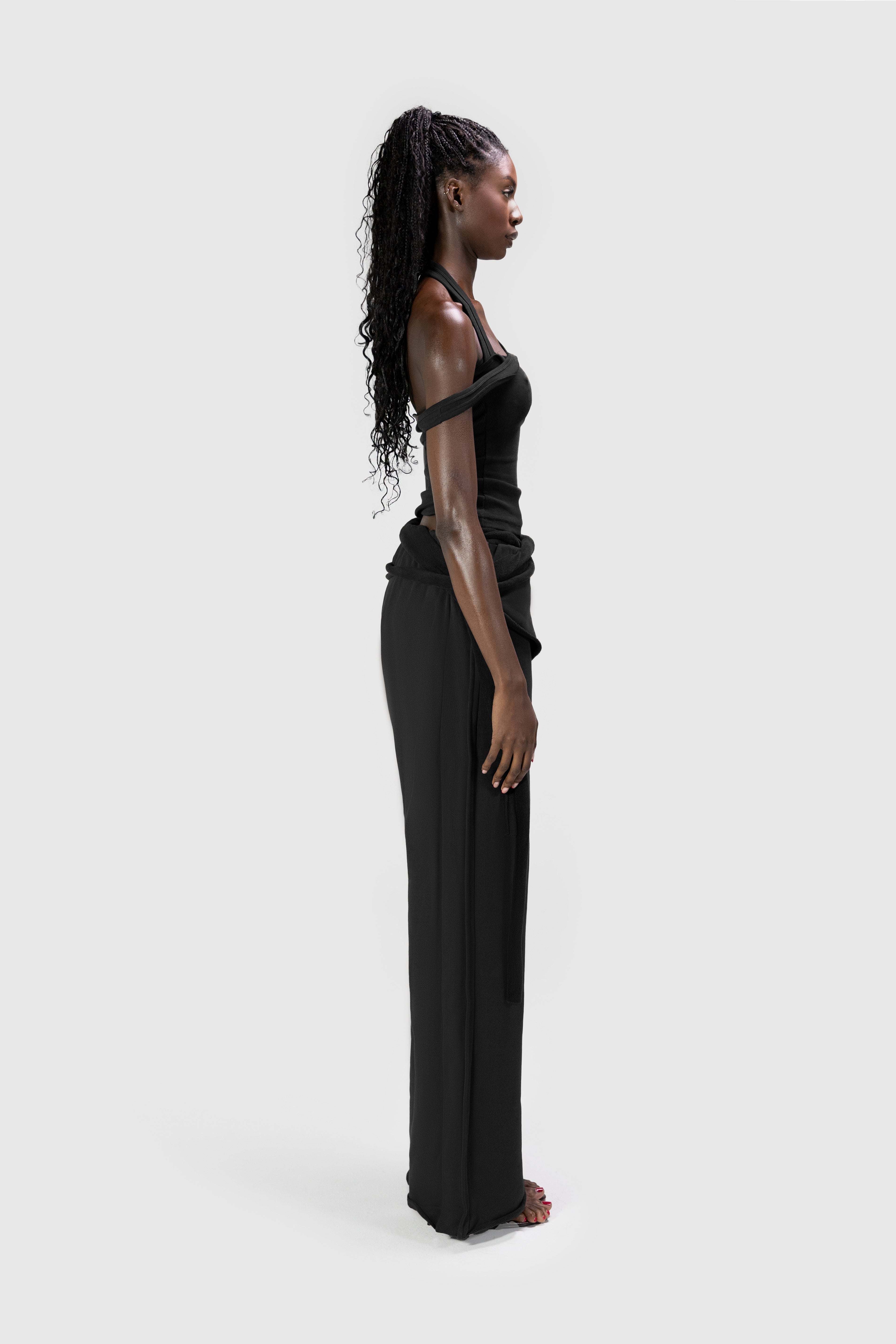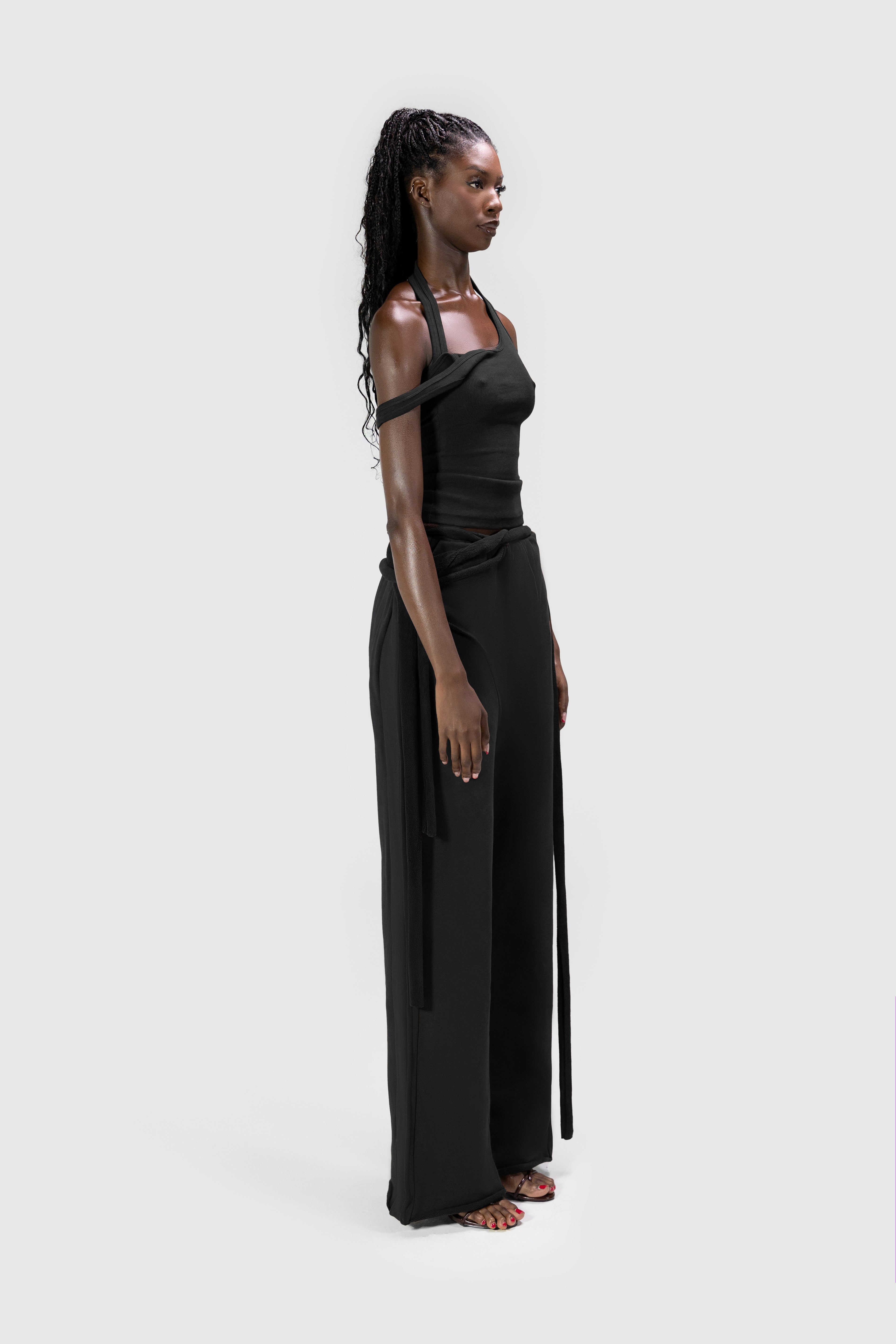 Wrapped panel wide leg joggers with raw edge seams and high waist. Easy cut to shorten length.