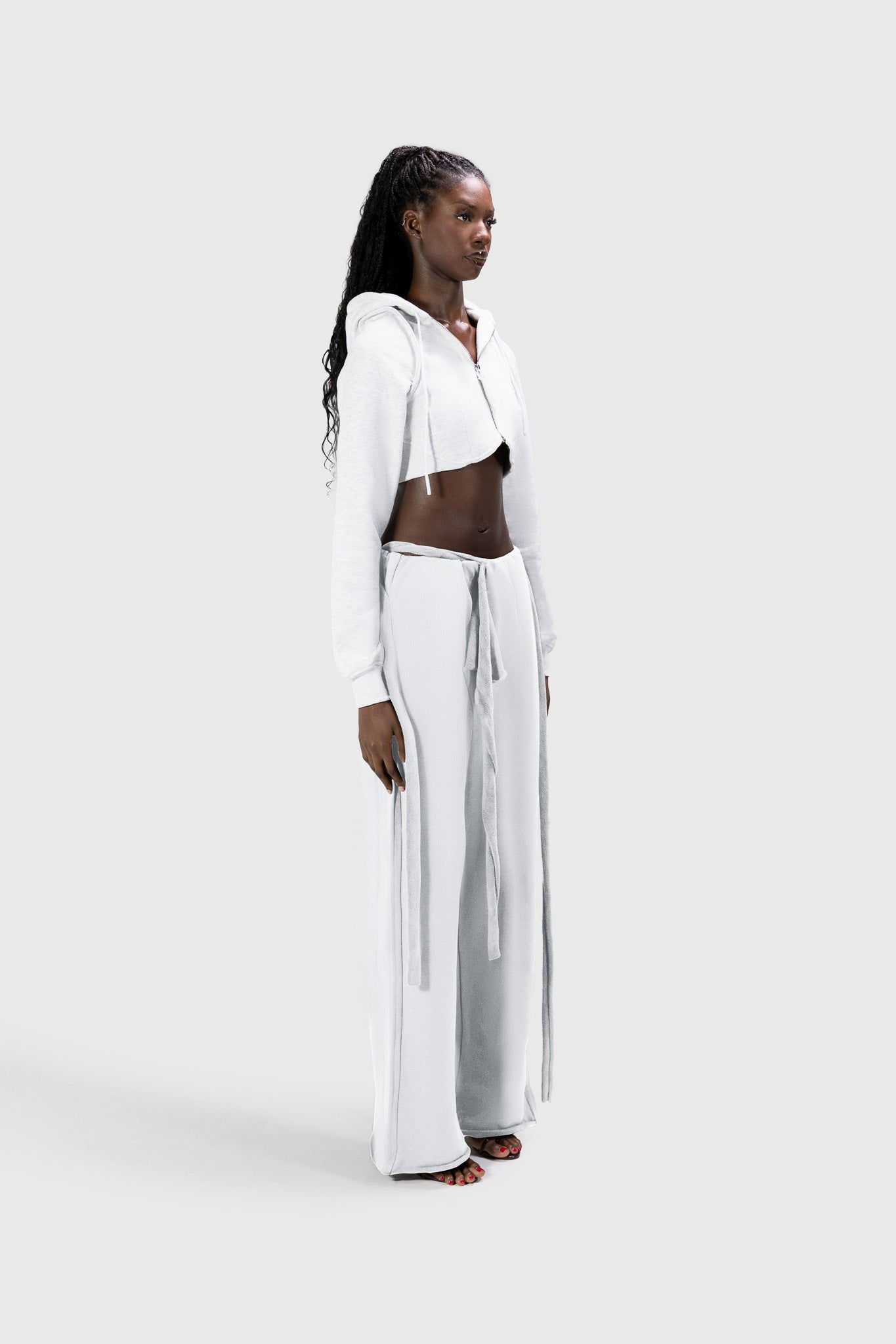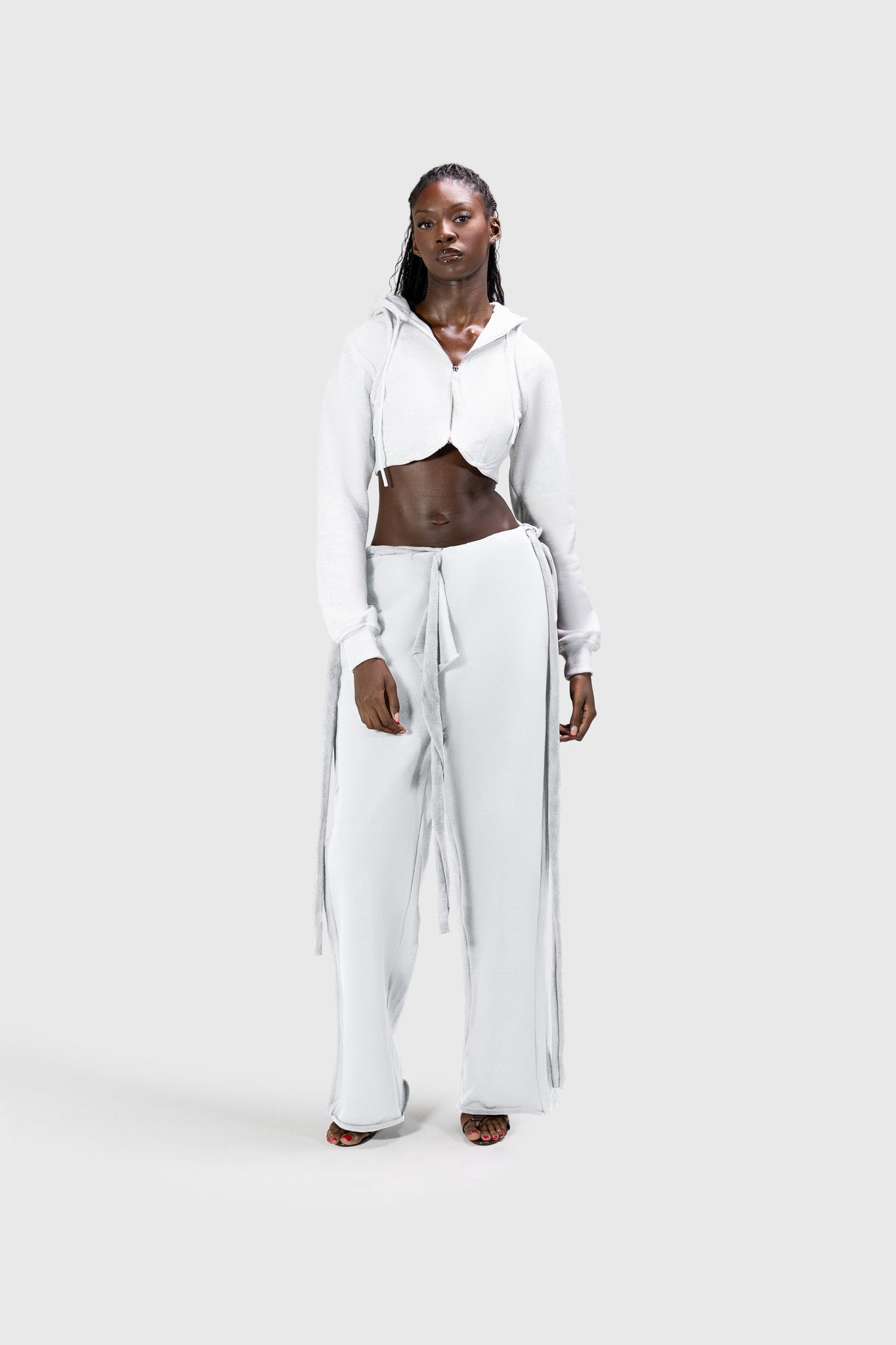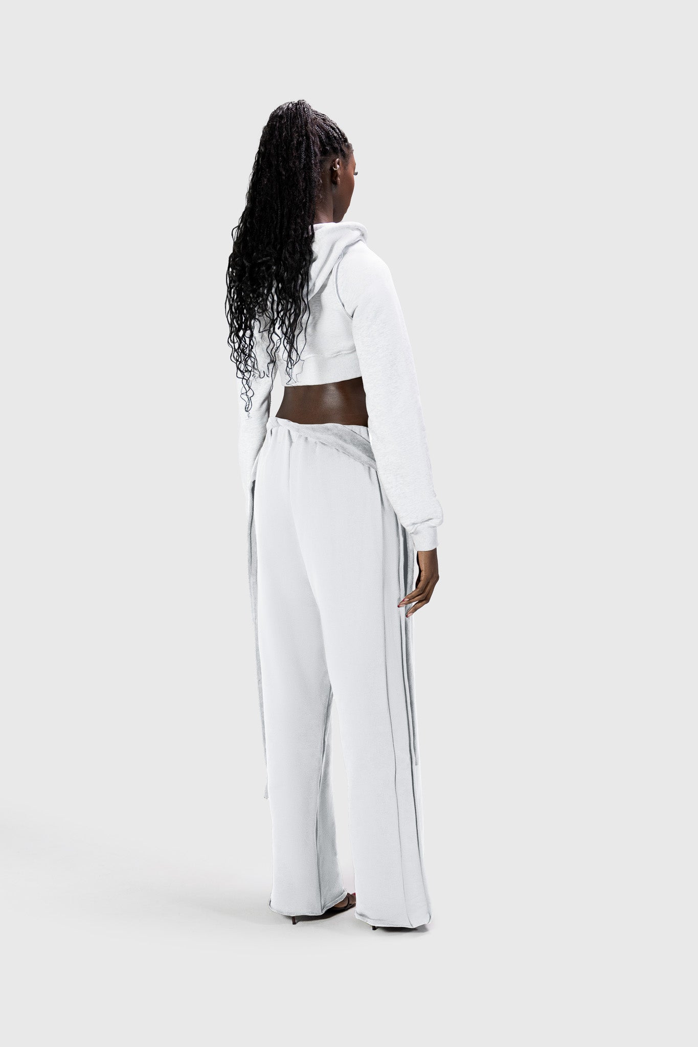 Wrapped panel wide leg joggers with raw edge seams and high waist. Easy cut to shorten length.
