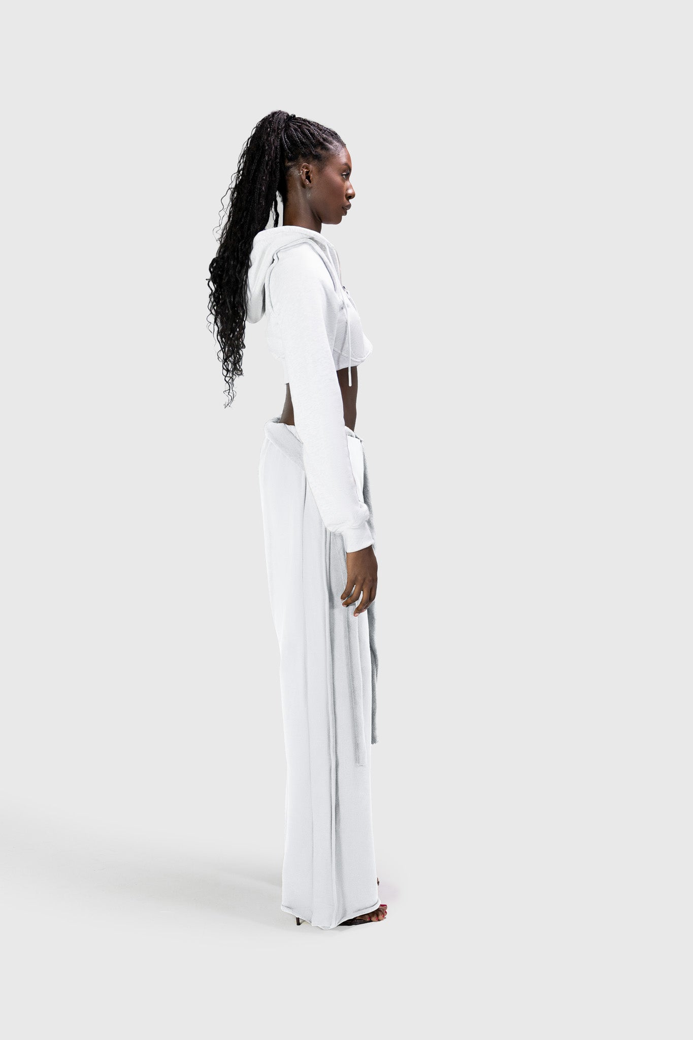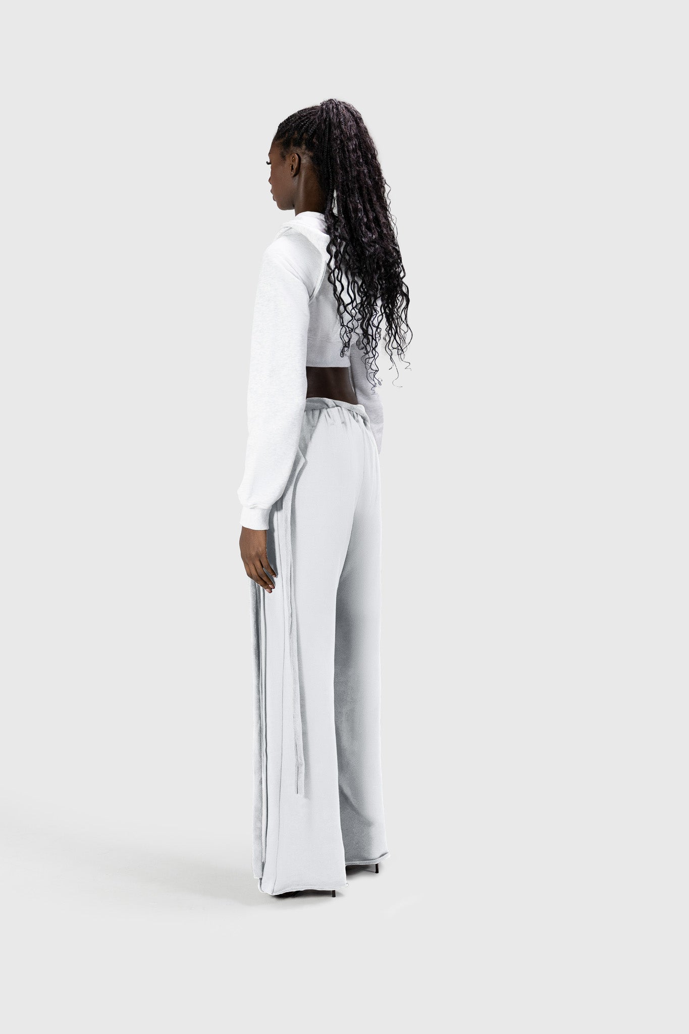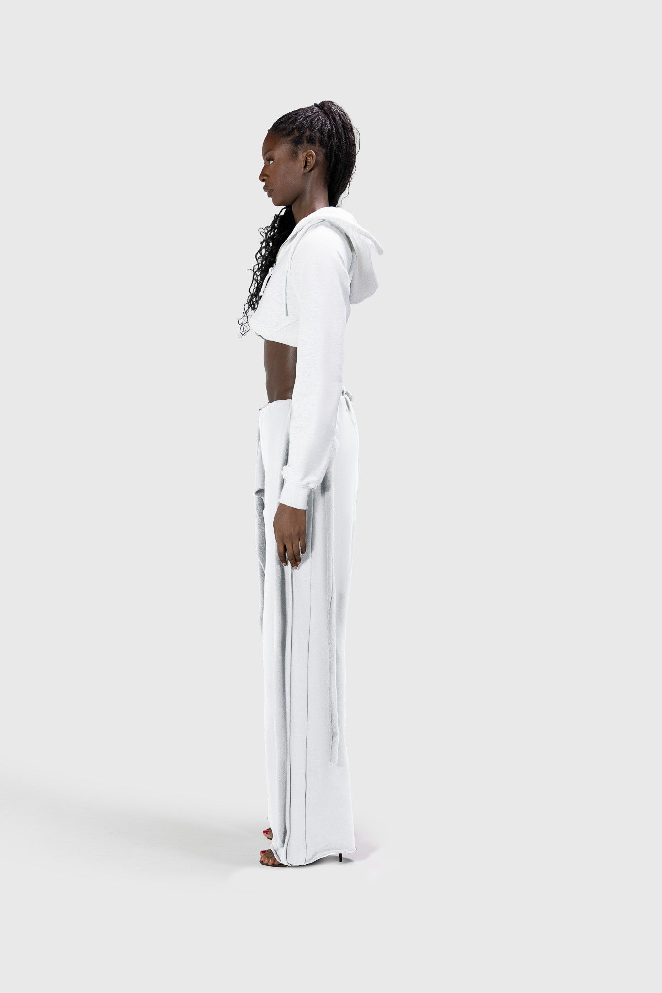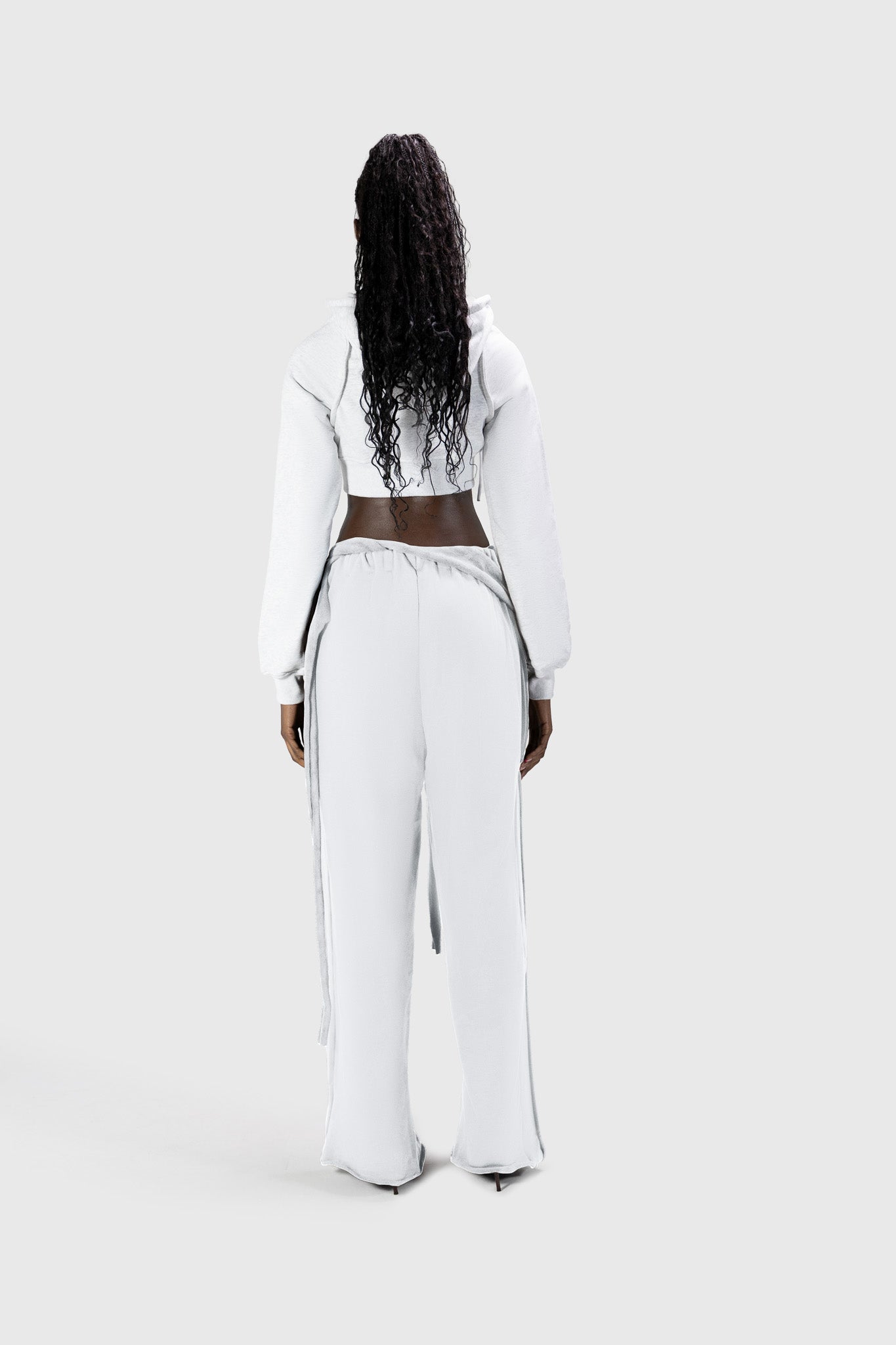 Wrapped panel wide leg joggers with raw edge seams and high waist. Easy cut to shorten length.