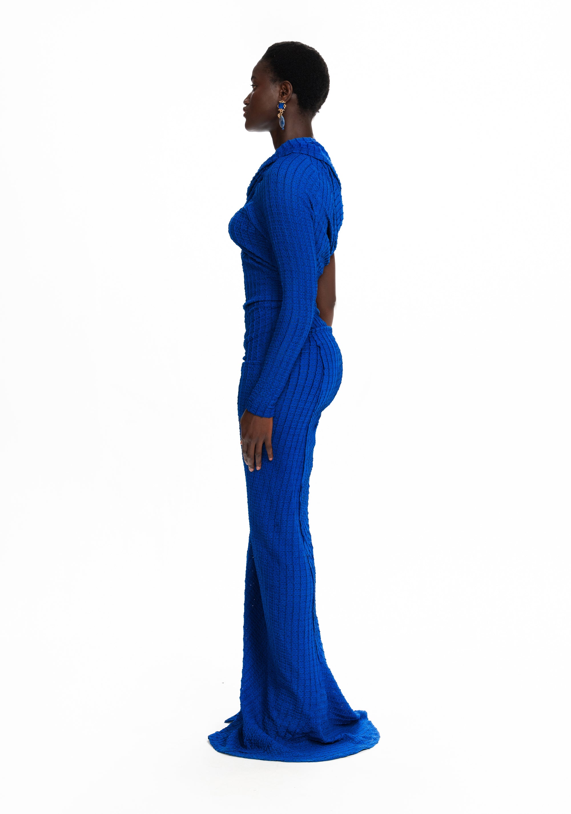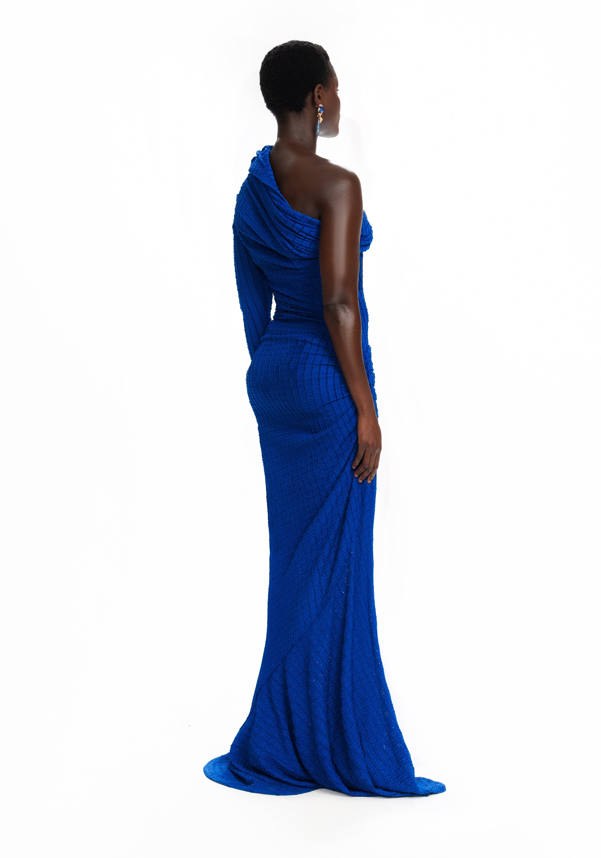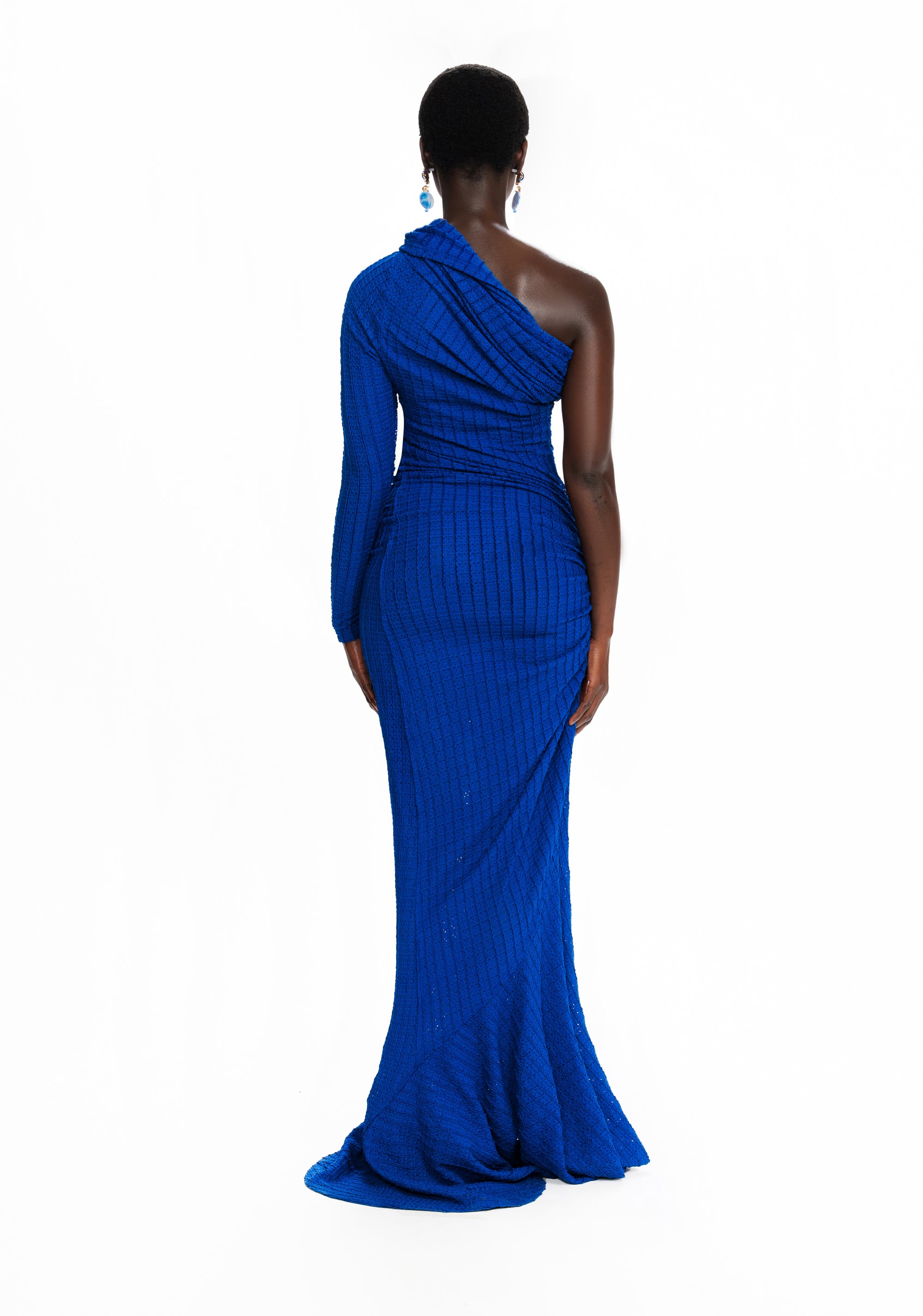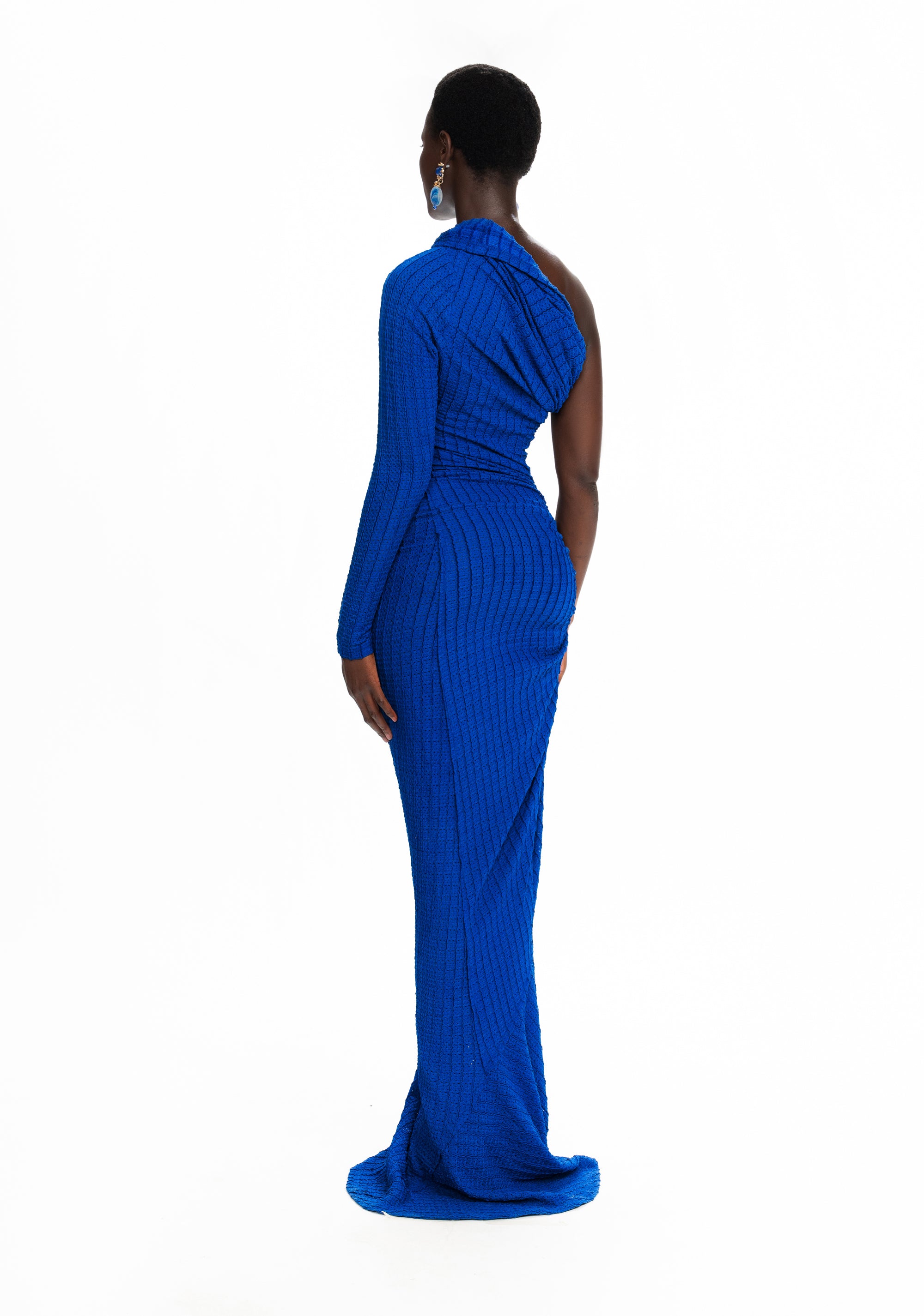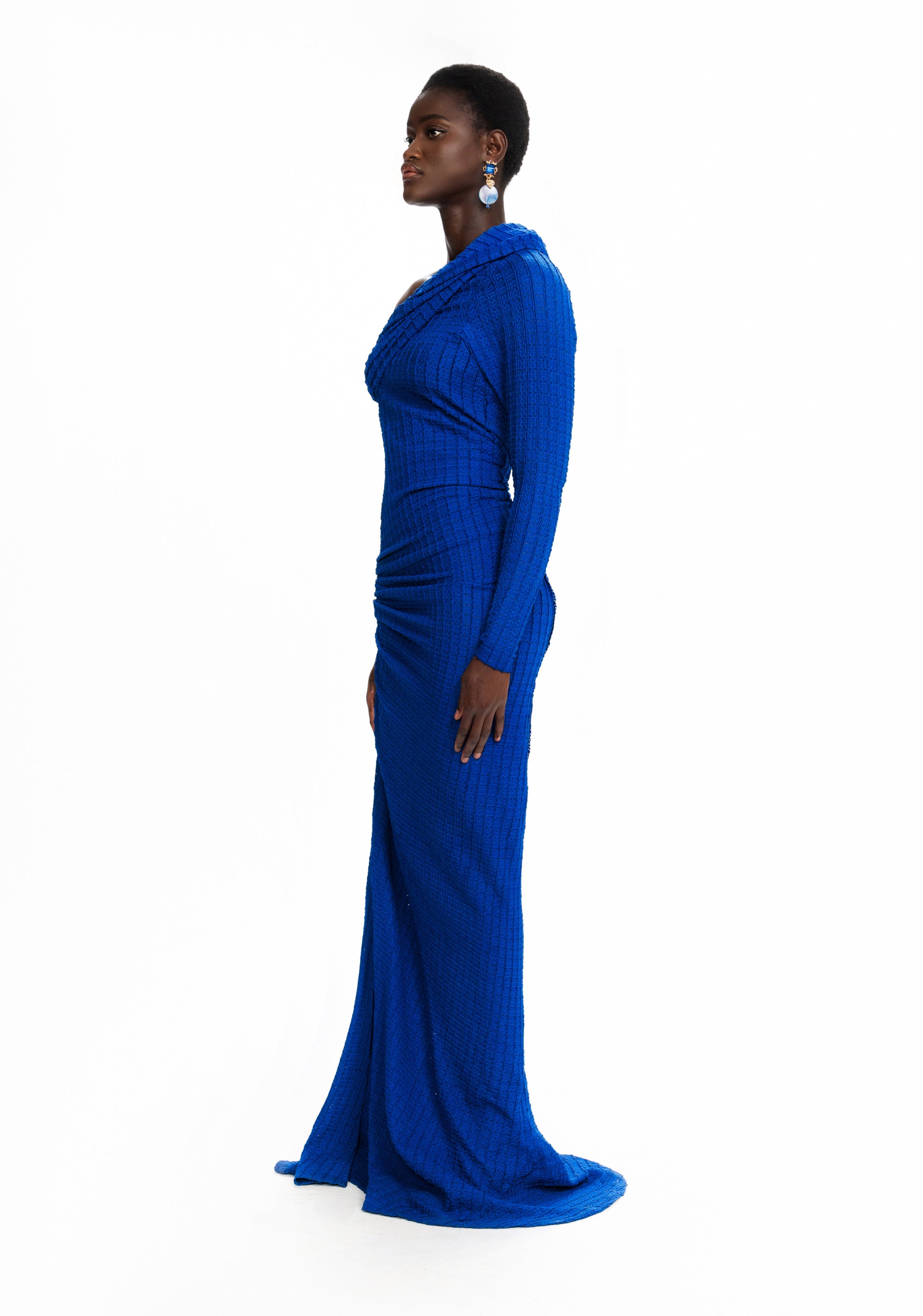 This asymmetric style dress is the perfect contemporary maxi dress. With an elongated asymmetric neckline that can be worn in different ways, create a style that suits you. Constructed with raw edge detailing for an unfinished look, ruching throughout to accentuate your curves and a panelled pooled hem that skims the floor.