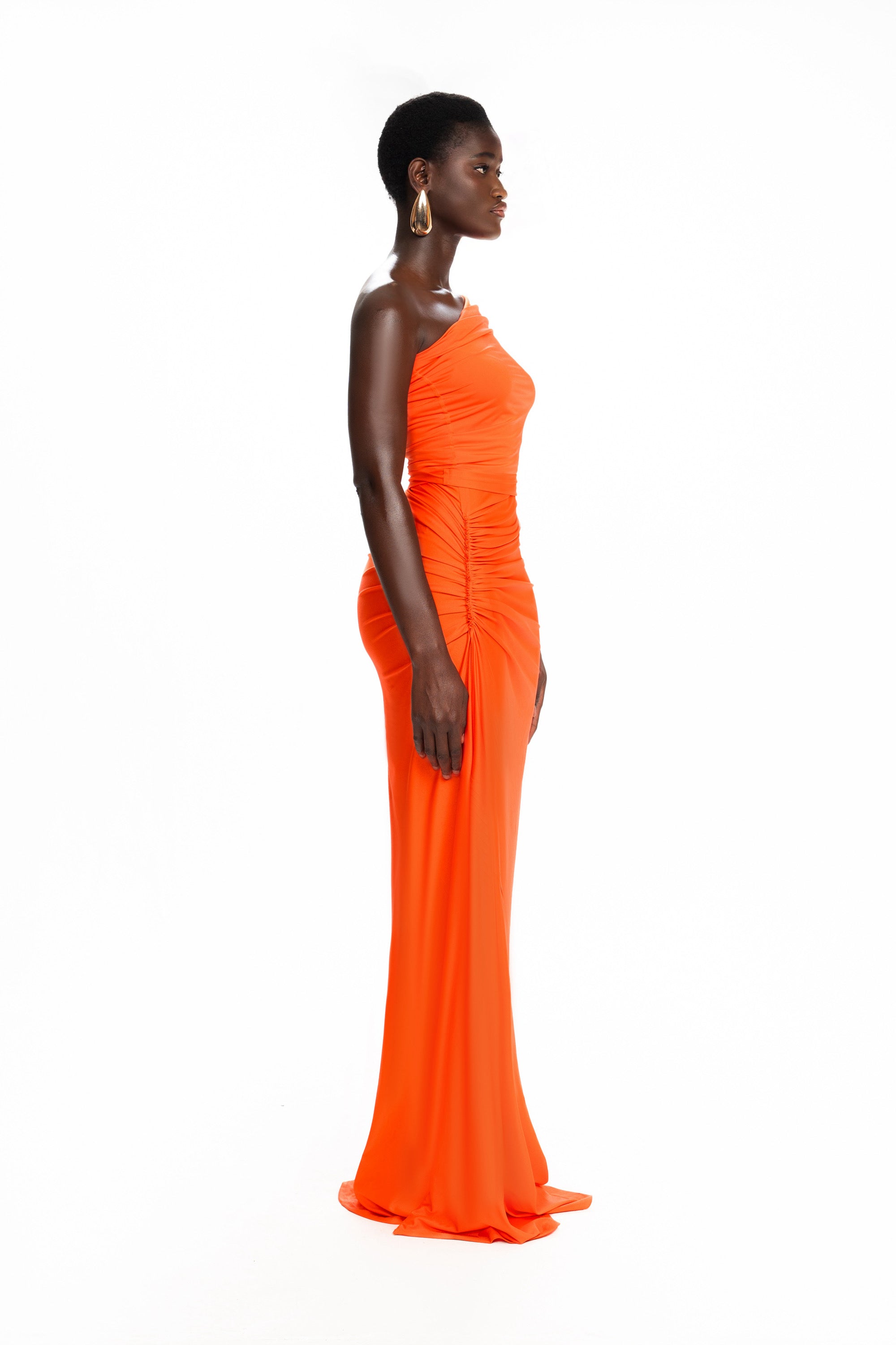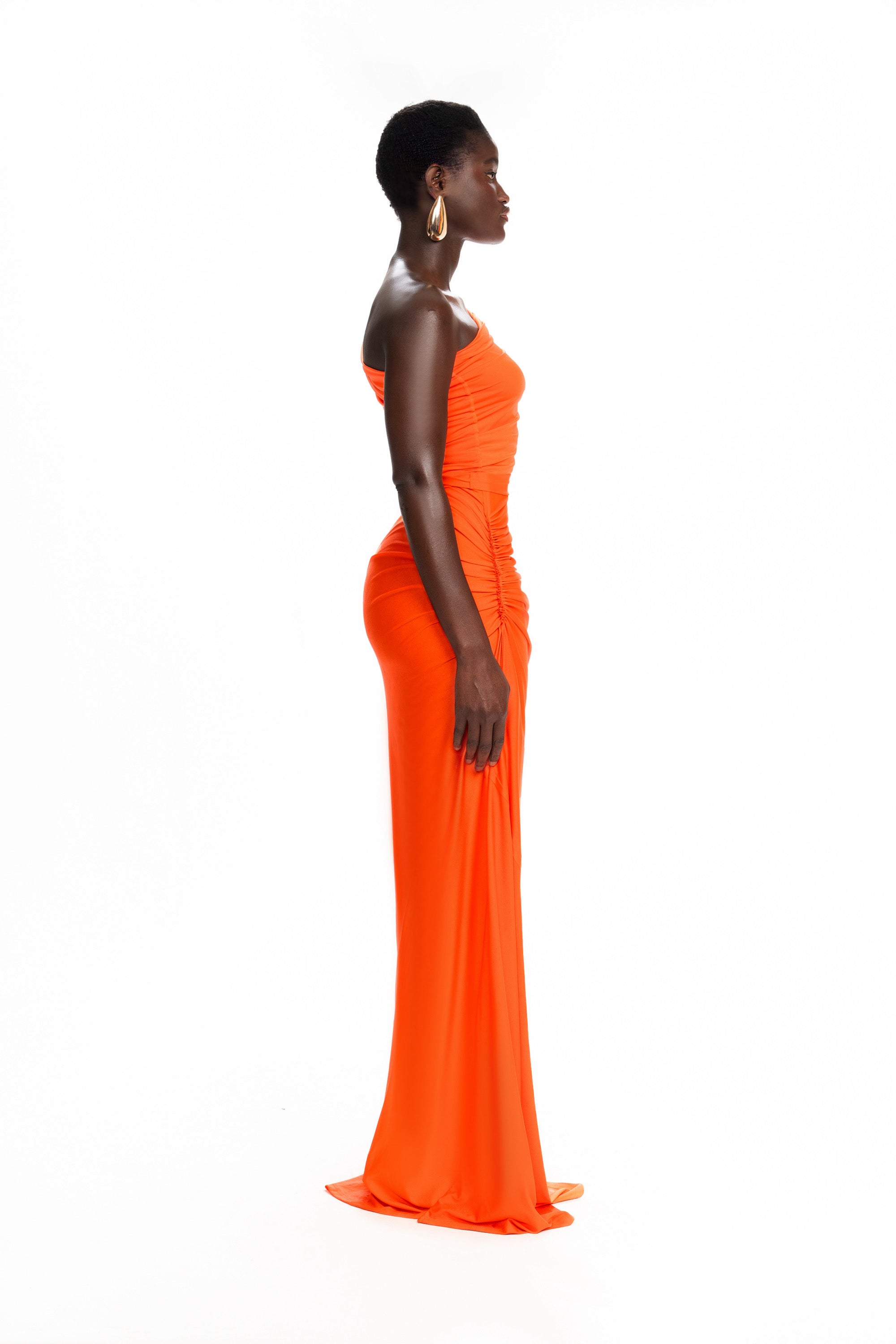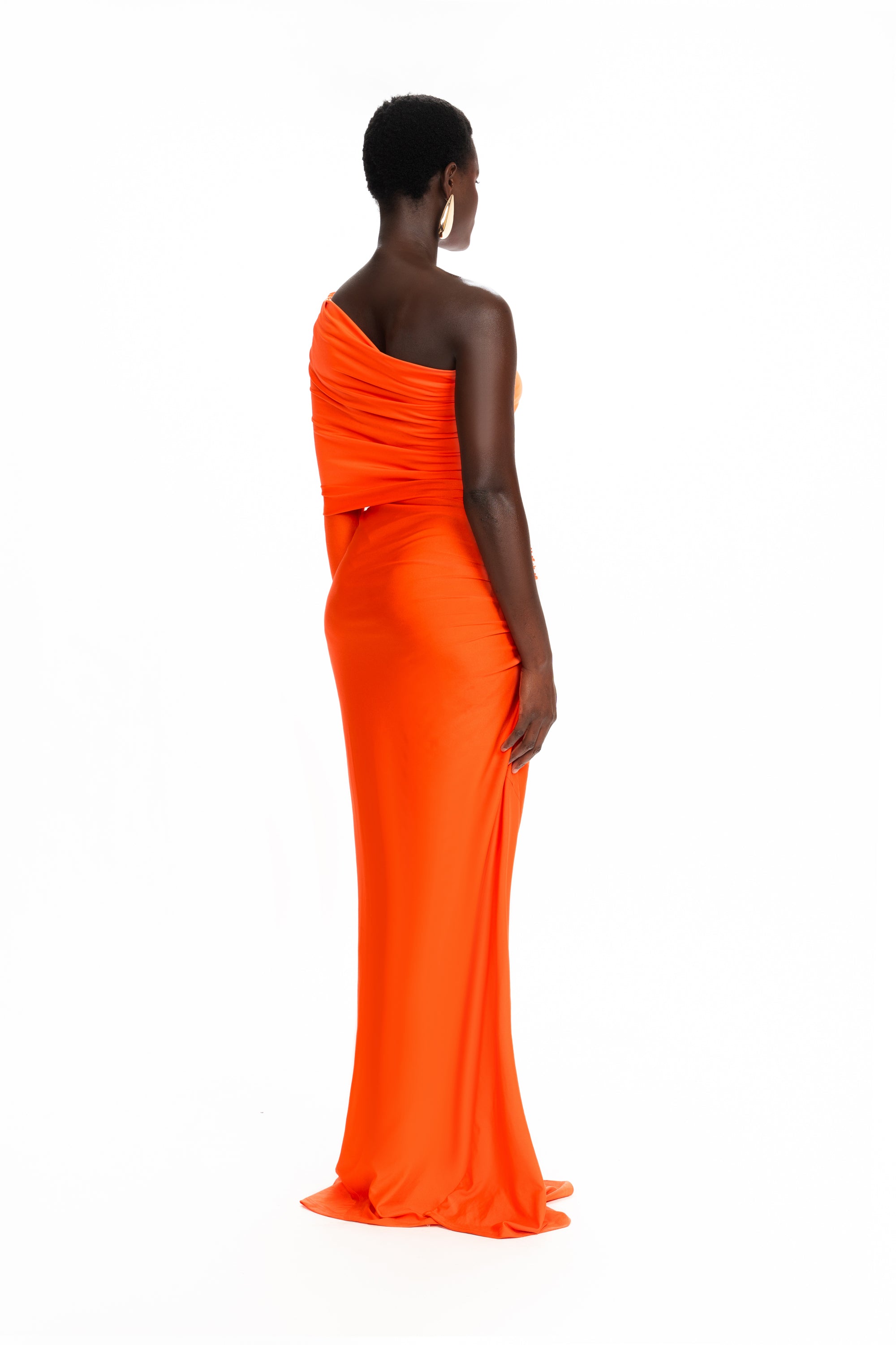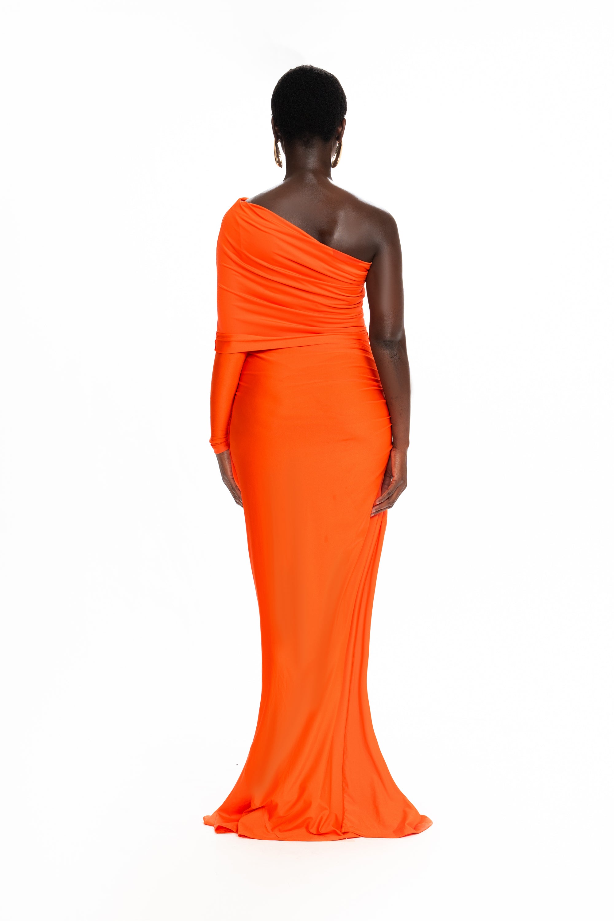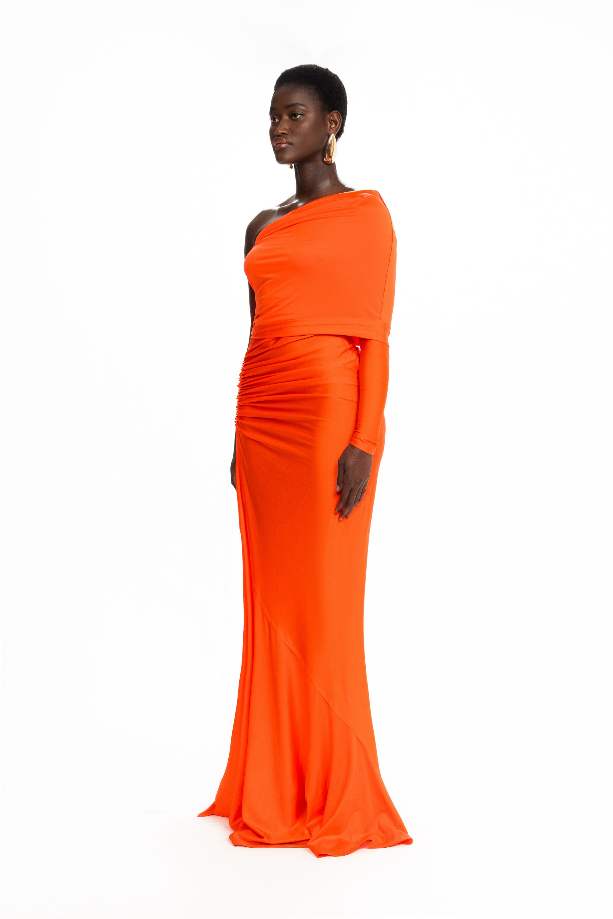 Made from our glossy spandex fabric, this asymmetric style dress is the perfect contemporary maxi dress. With an elongated asymmetric neckline that can be worn in different ways, create a style that suits you. Constructed with raw edge detailing for an unfinished look, ruching throughout to accentuate your curves and a panelled pooled hem that skims the floor.