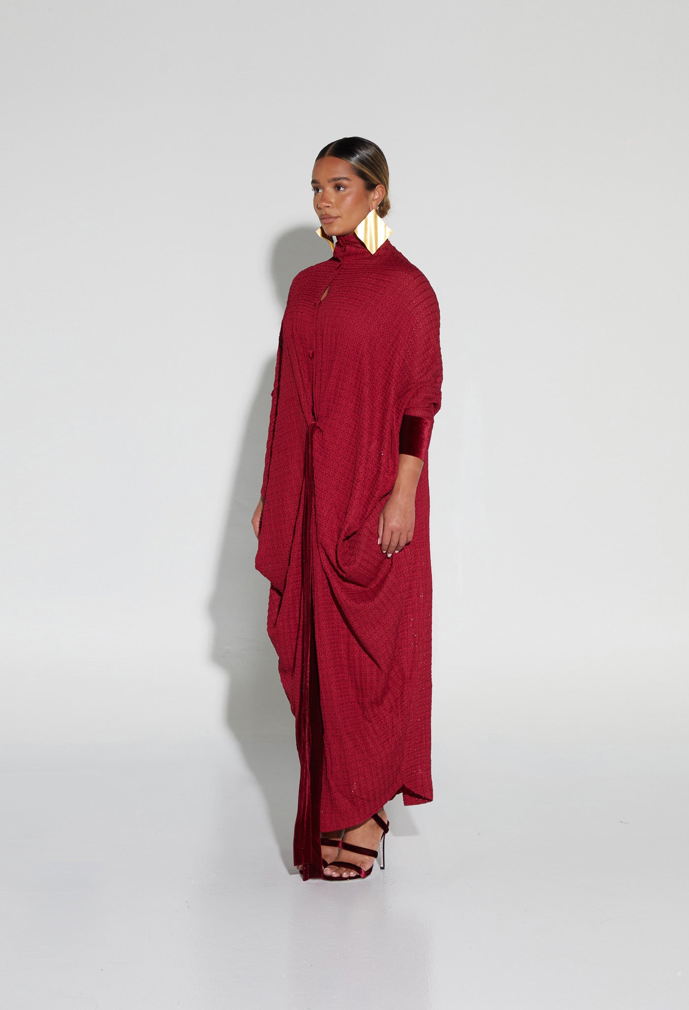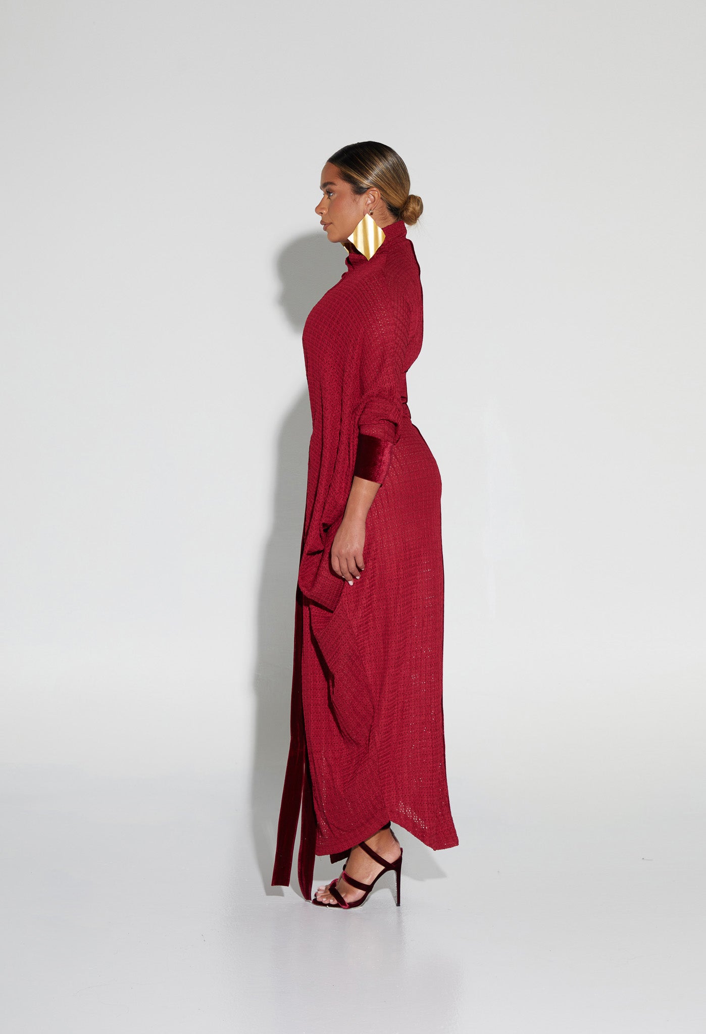 Our new tunic style dresses are amazing! Simply flowy with subtle draping creating and elegant look using the most beautiful knitted textured fabric. With fixed velvet straps on the inside waist, this tunic can be styled cinched or left loose. Finished with signature velvet detailing, prepare to be complimented all night!
