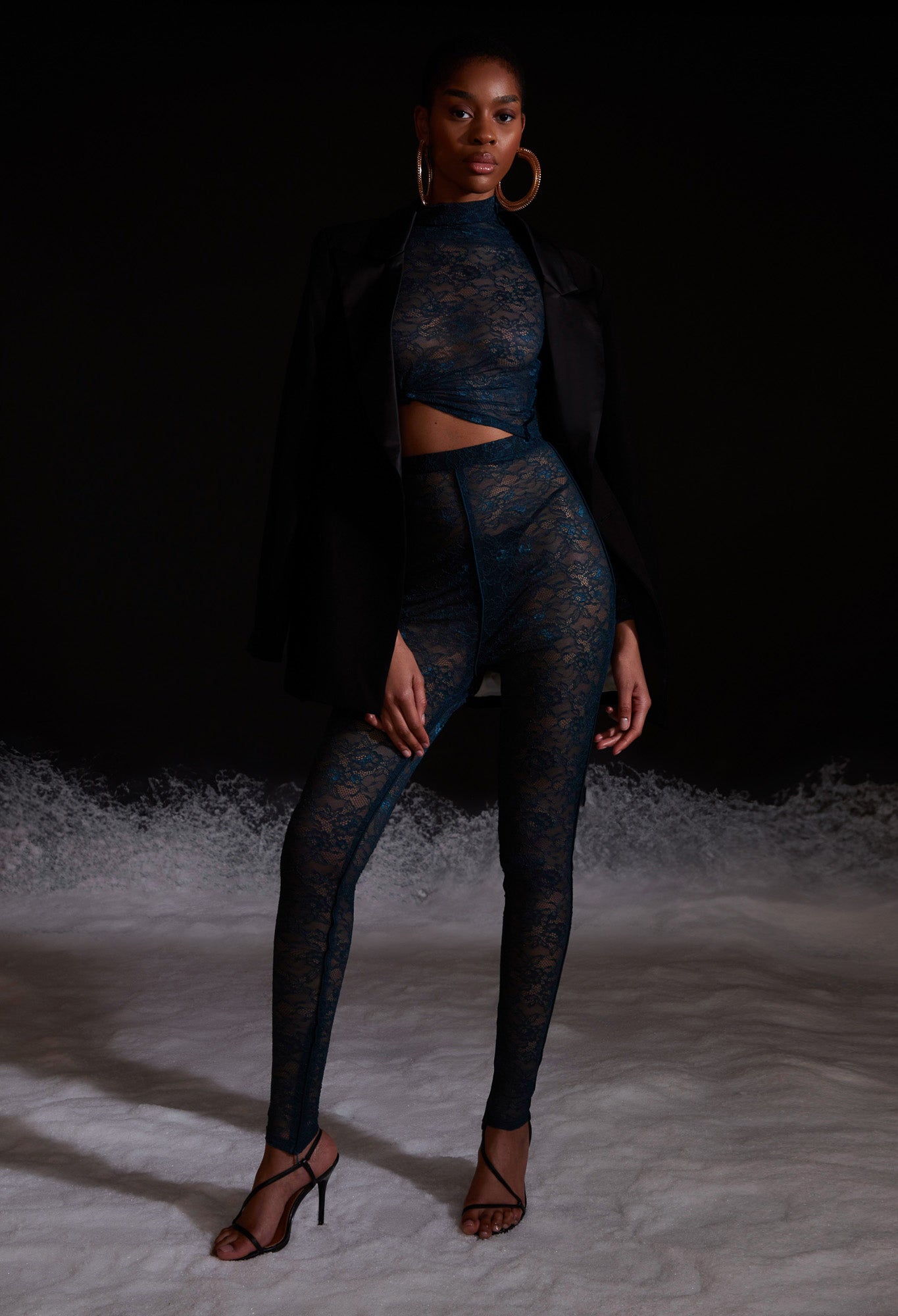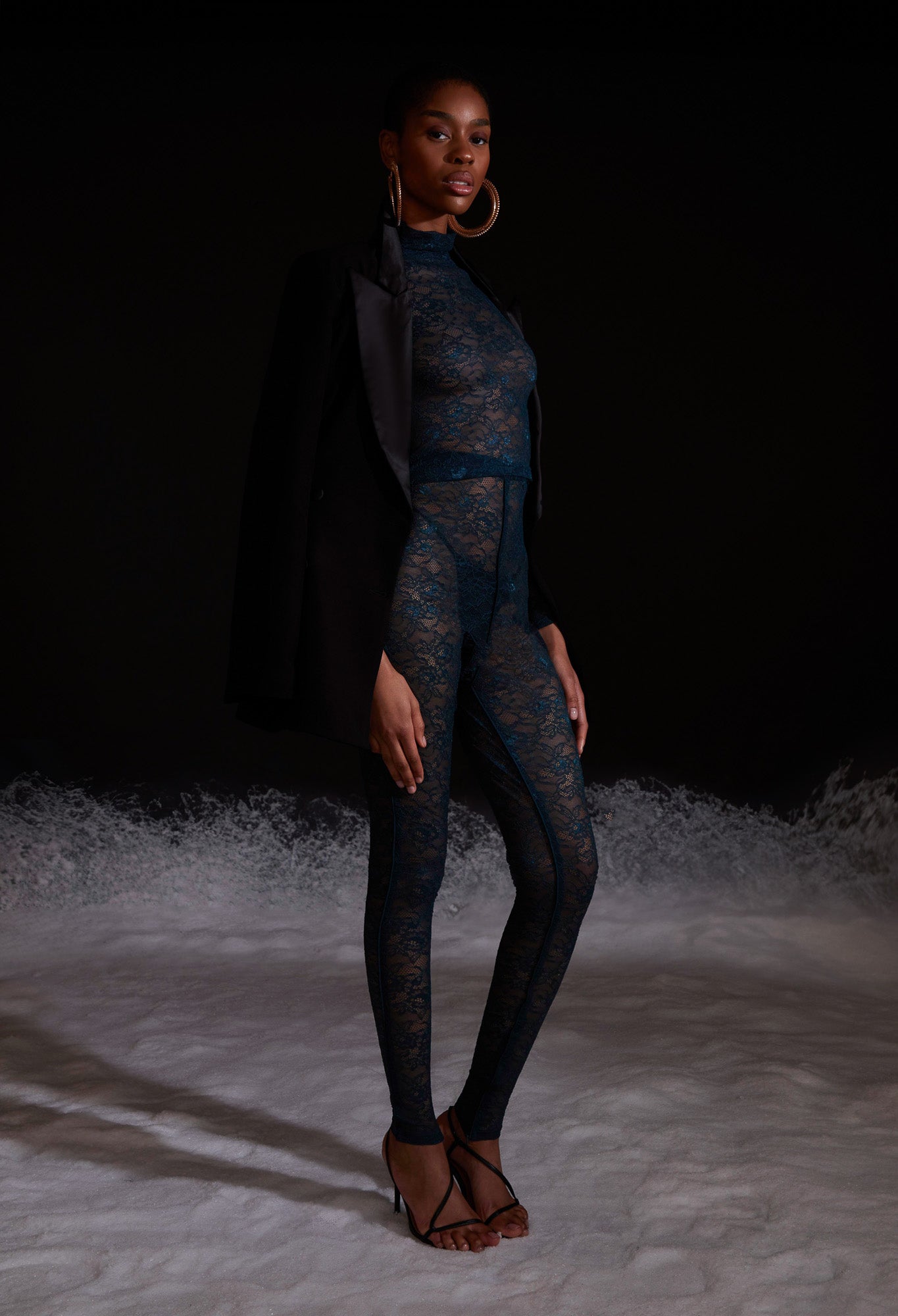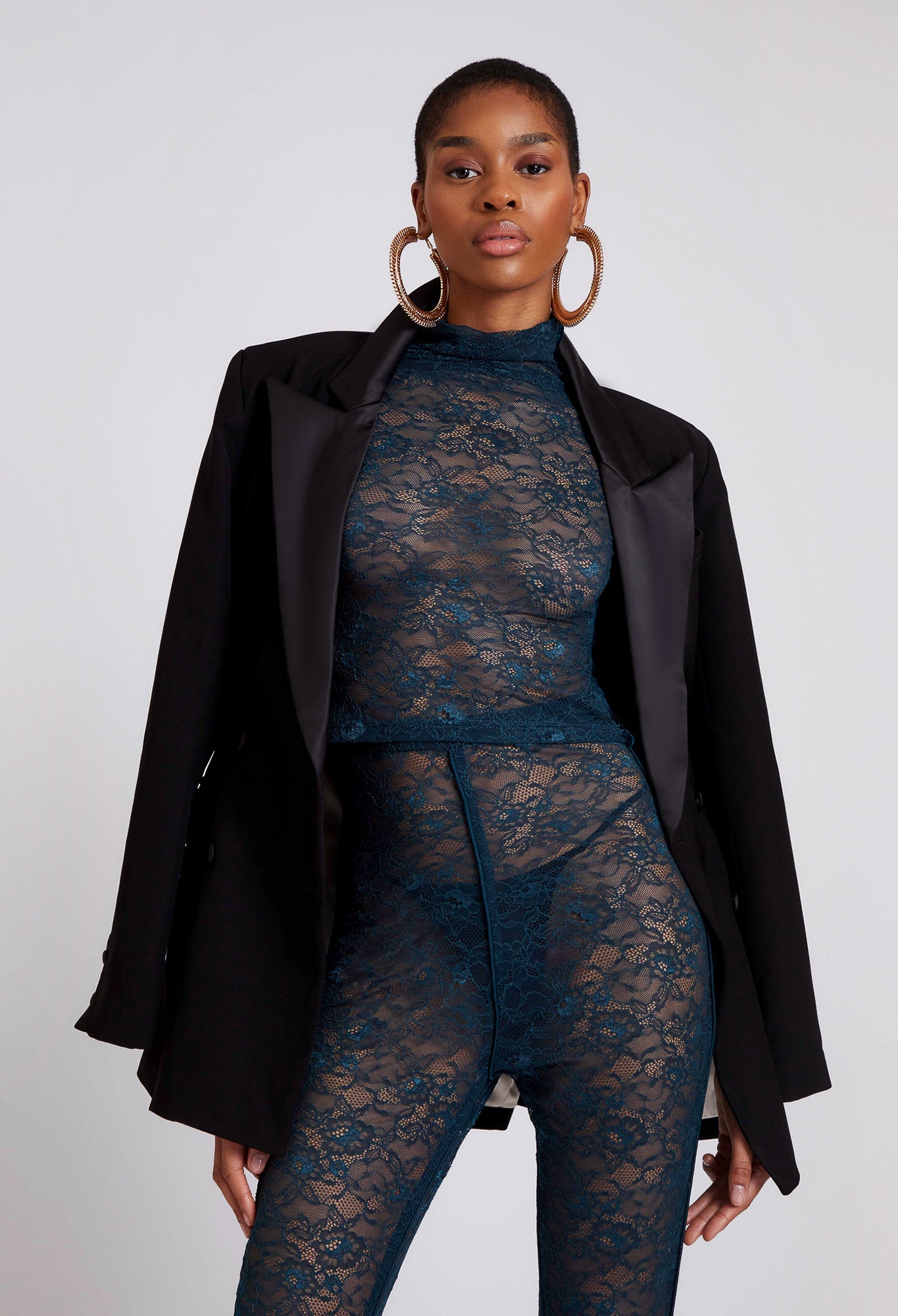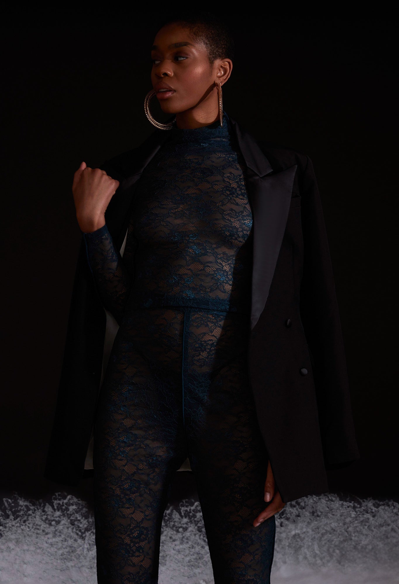 Our viral sexy jumpsuit now in a turtle neck top! Crafted from delicate lace, with velvet covered buttons, this piece is a must-have in any wardrobe. It’s all the small details that make this piece a statement! Pair with our Laced Legging Pants to finish the look. Lace pattern will vary in each piece.