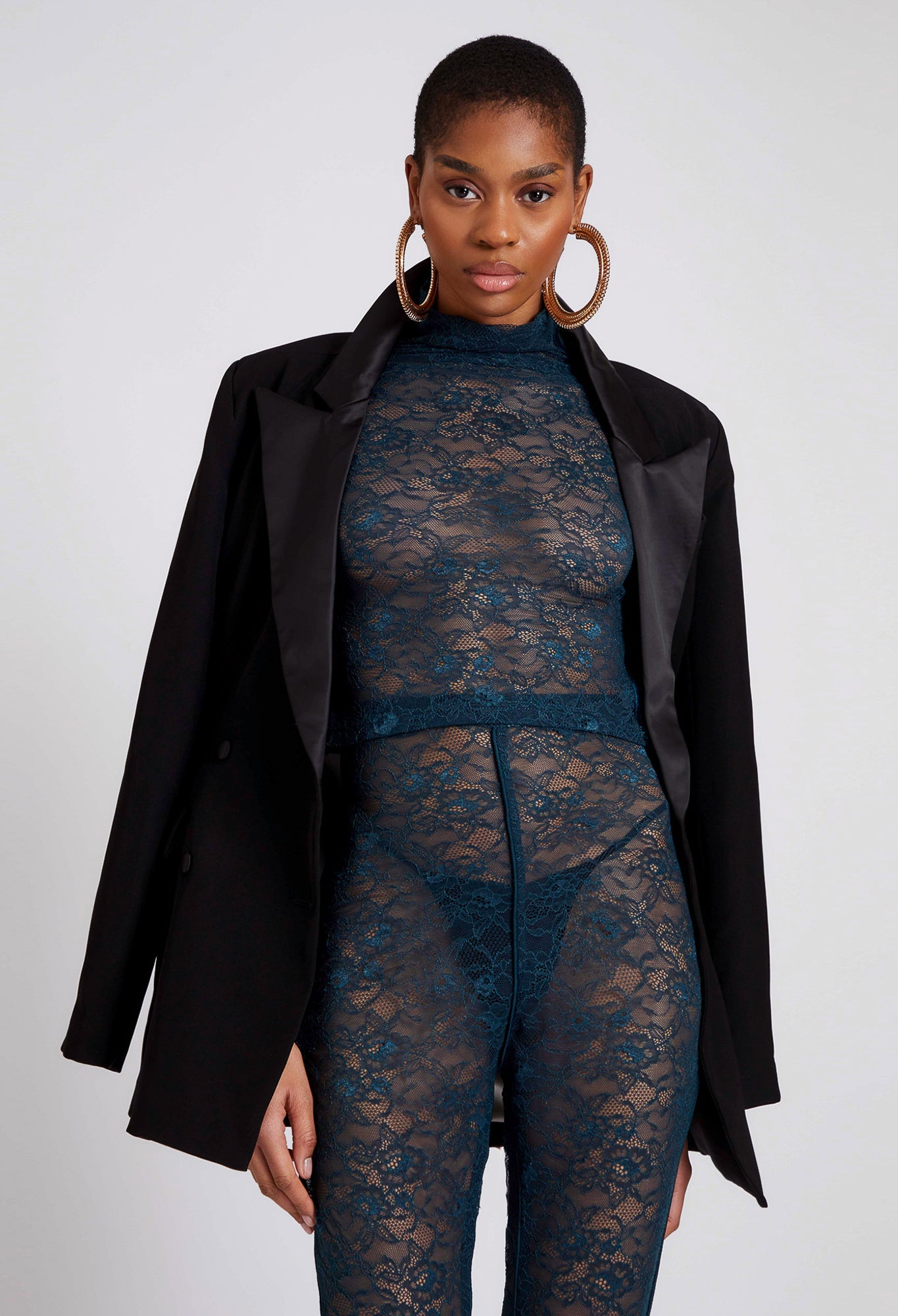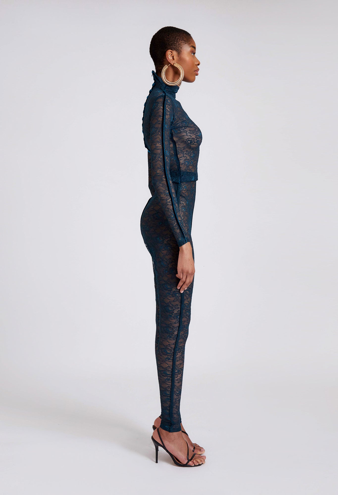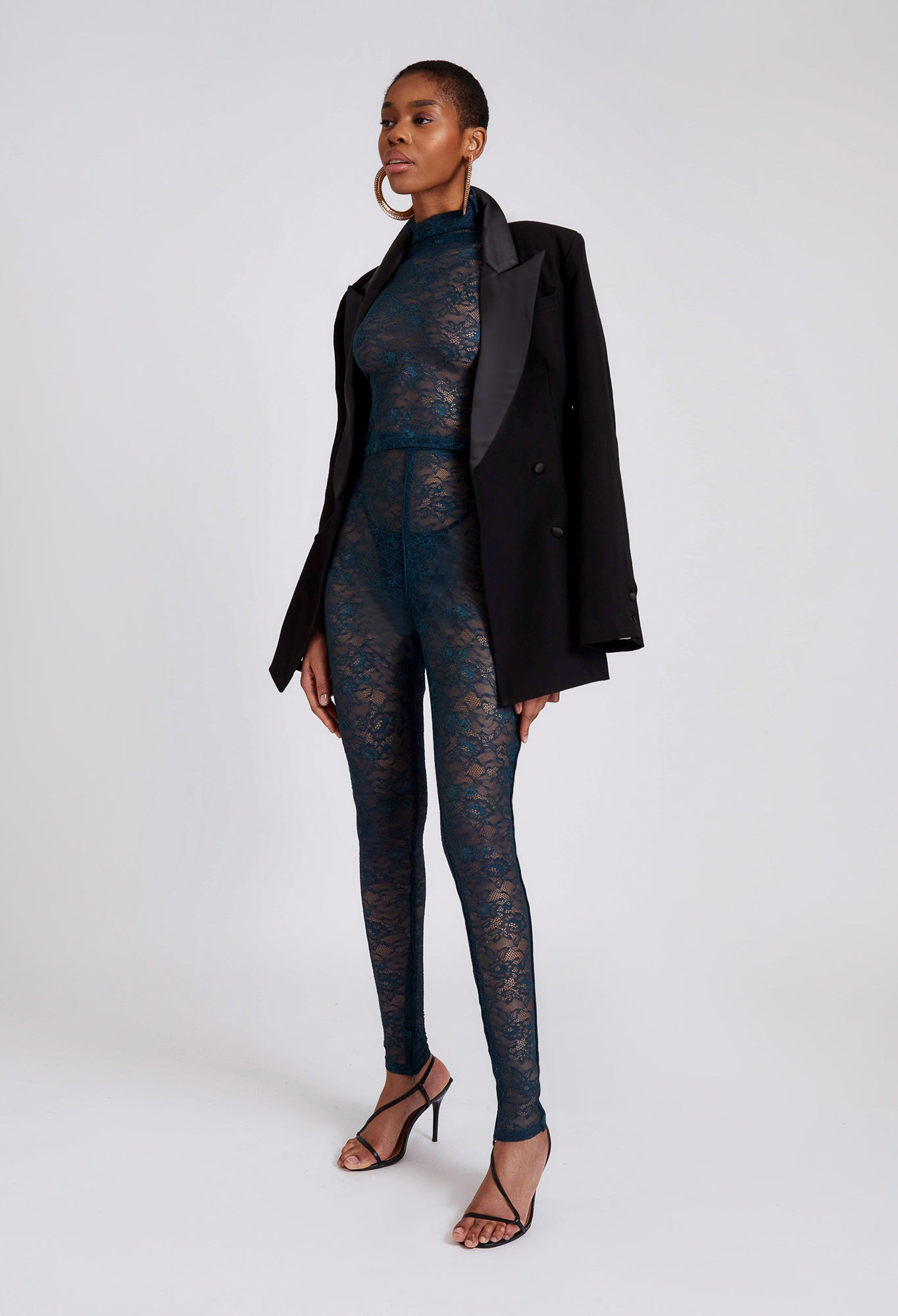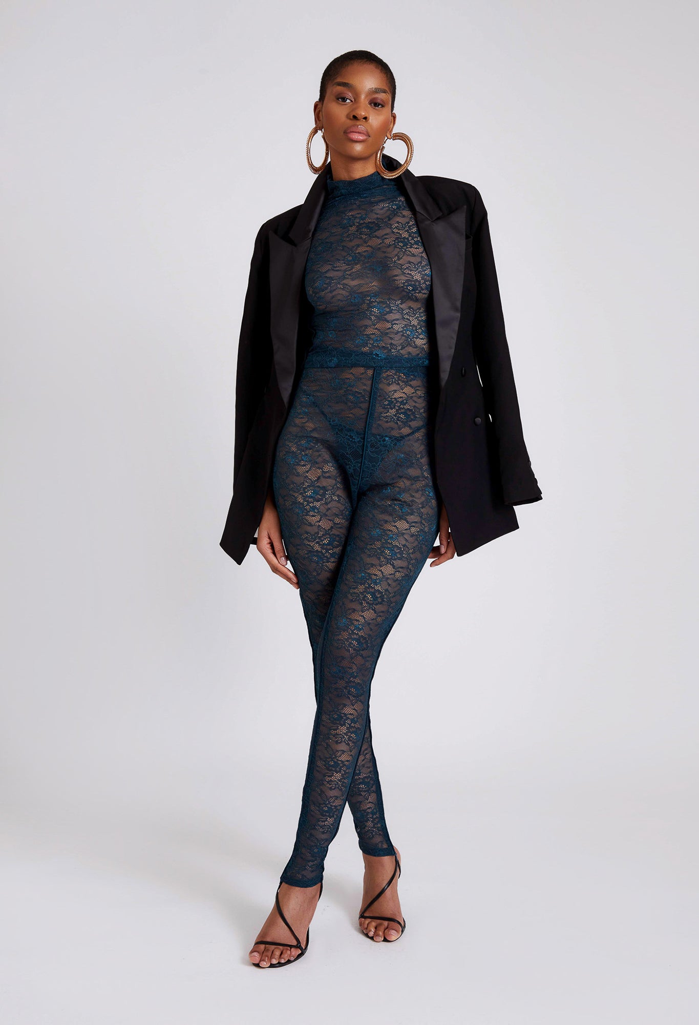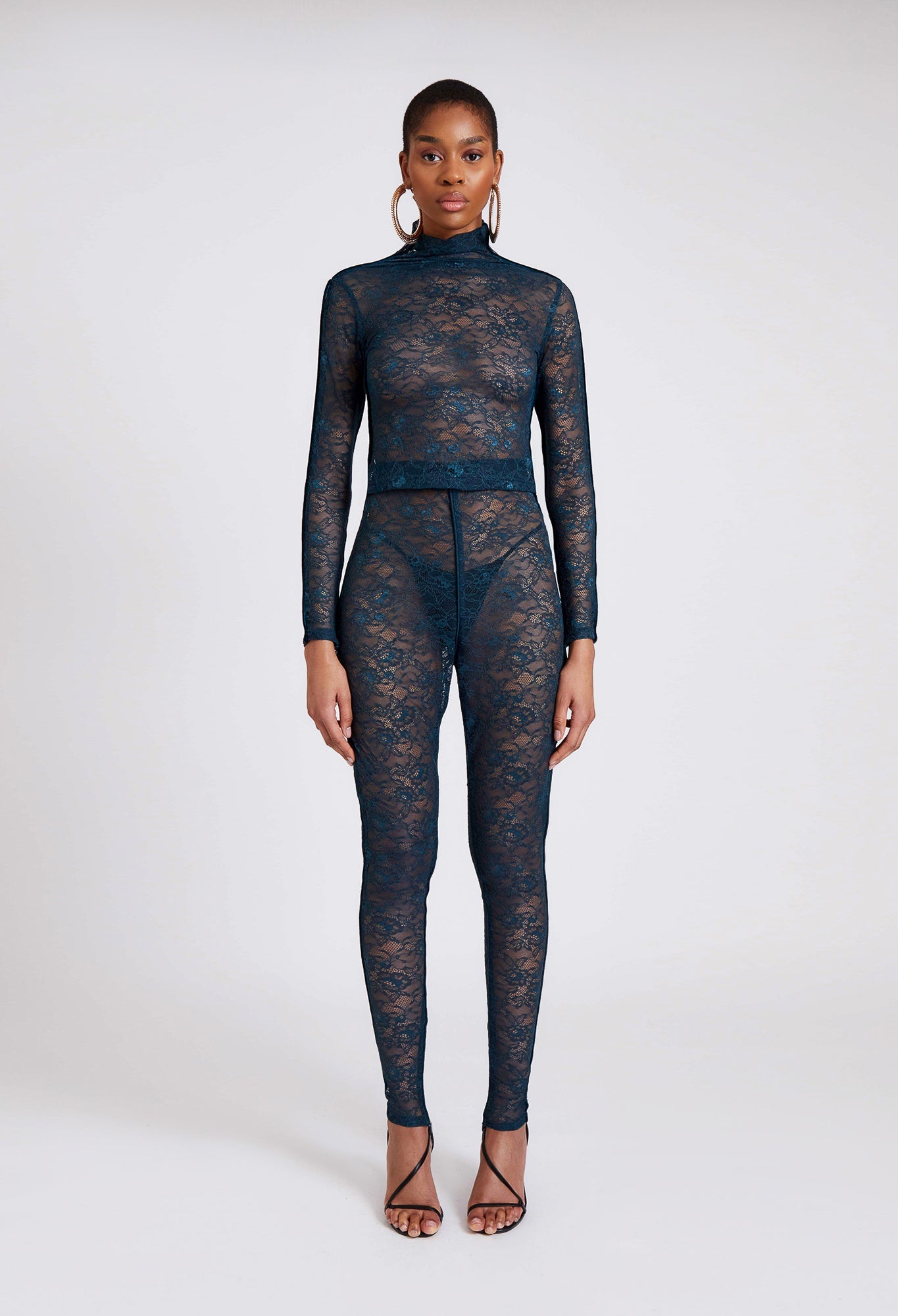 Our viral sexy jumpsuit now in a turtle neck top! Crafted from delicate lace, with velvet covered buttons, this piece is a must-have in any wardrobe. It’s all the small details that make this piece a statement! Pair with our Laced Legging Pants to finish the look. Lace pattern will vary in each piece.