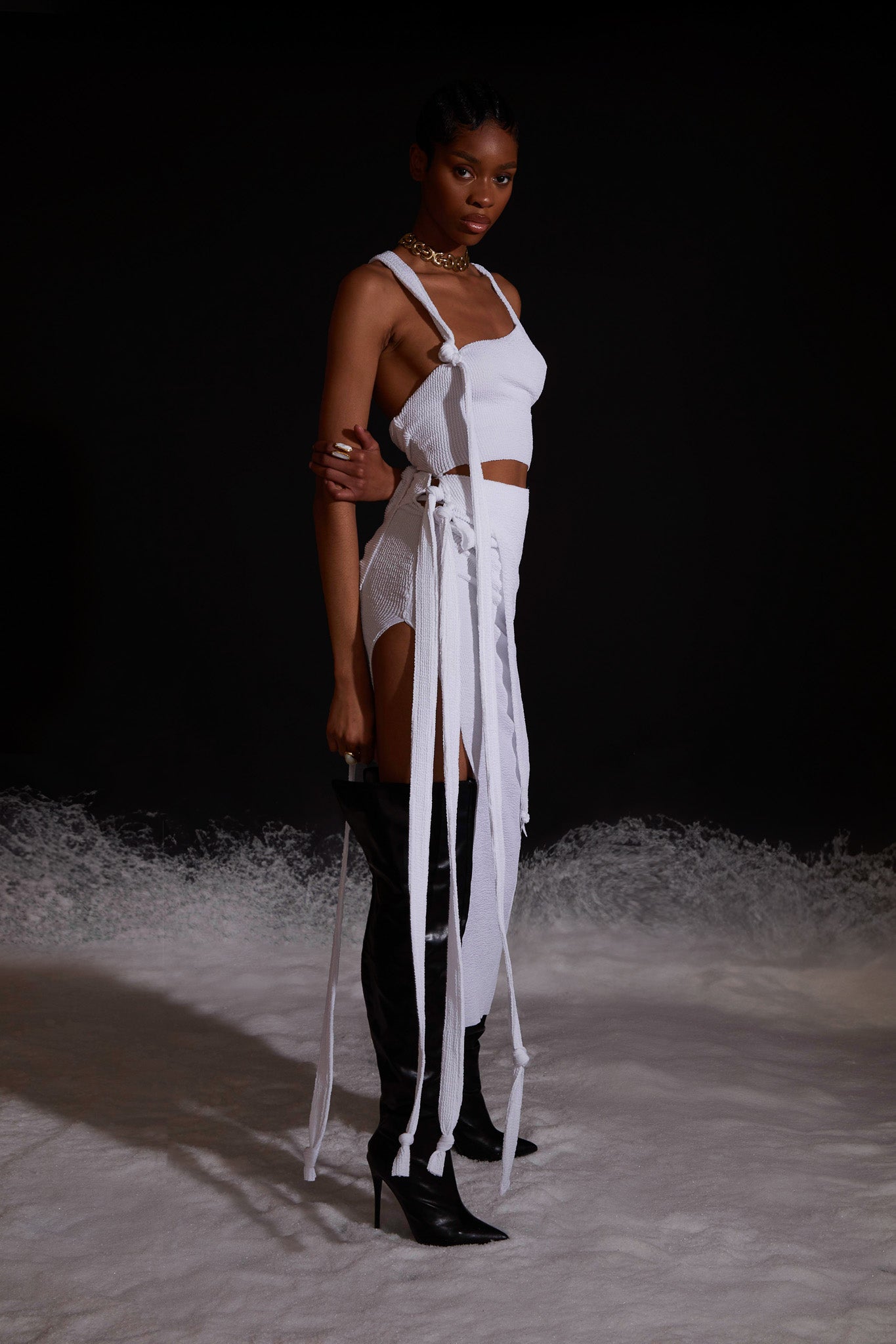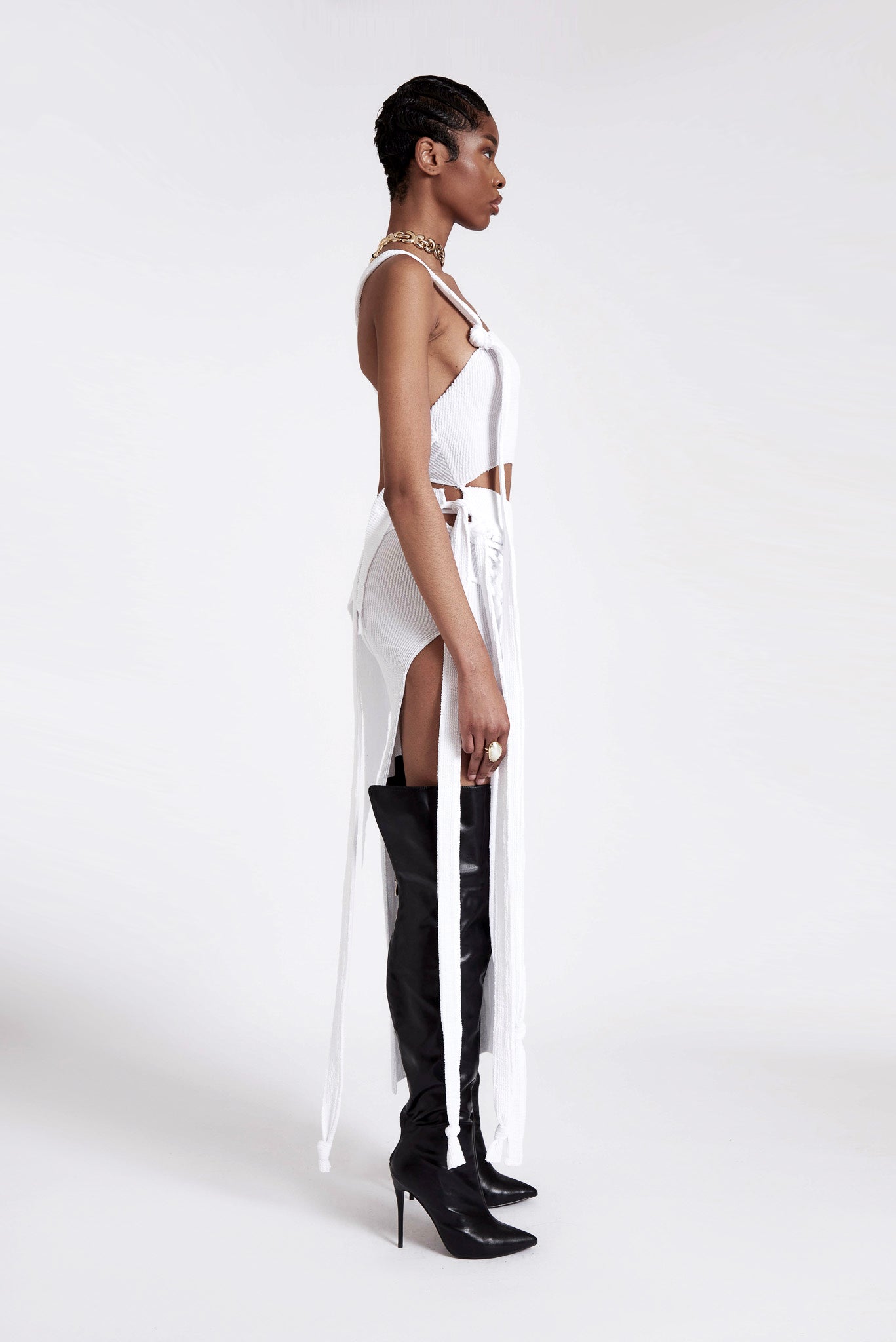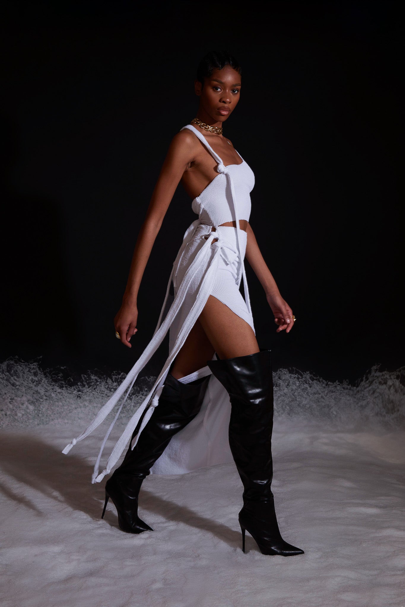 Deconstructed creativeness with this new piece. Made from a super stretchy fabric, this chic look can be tied in many ways. Elongated straps create subtle drape movements in whichever style you prefer. Style with strappy heels or thigh high boots.