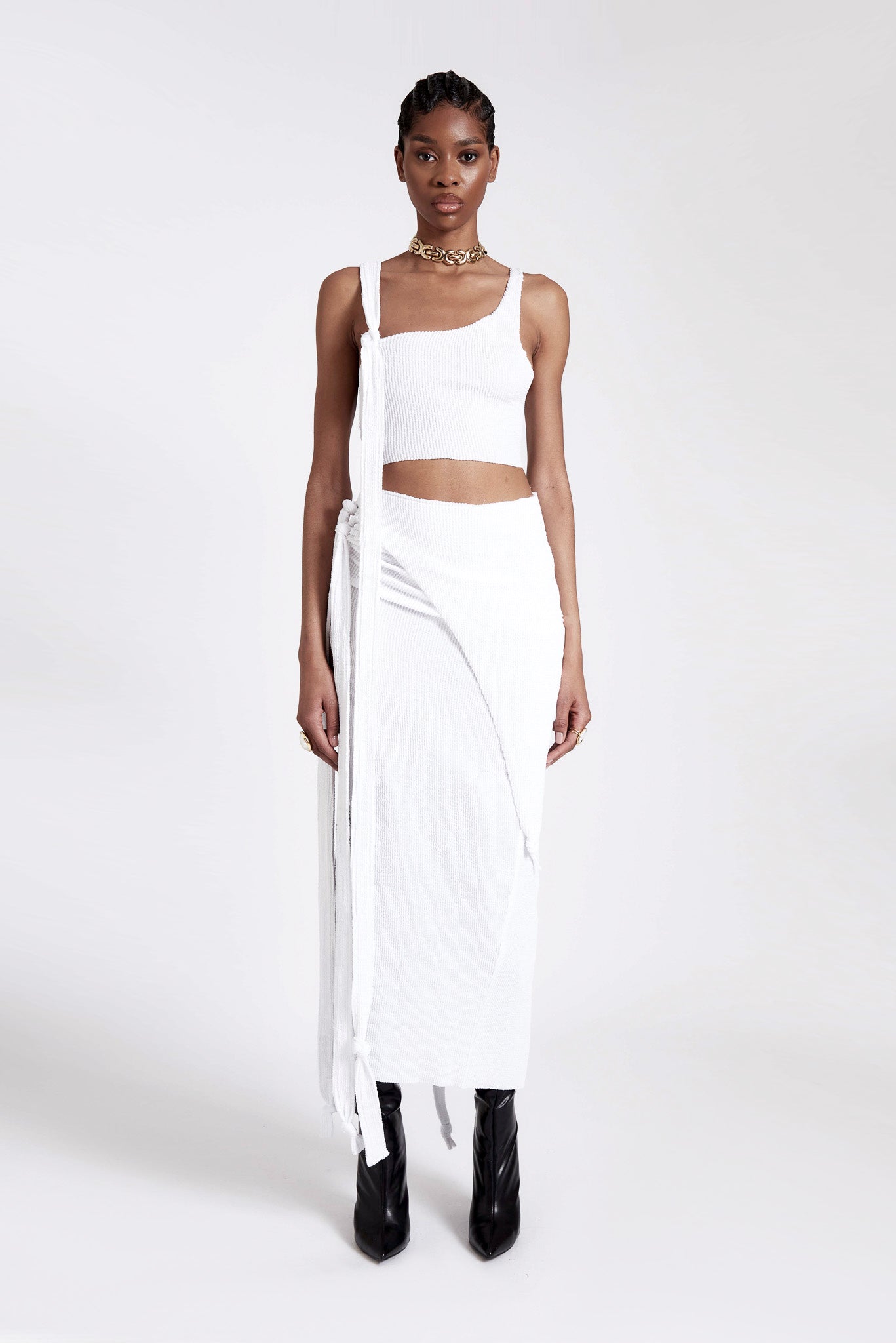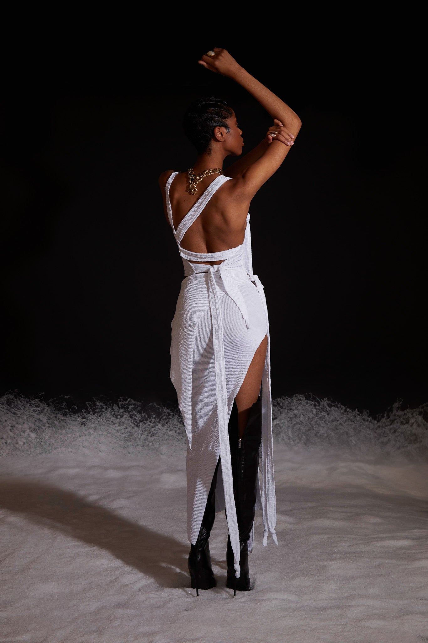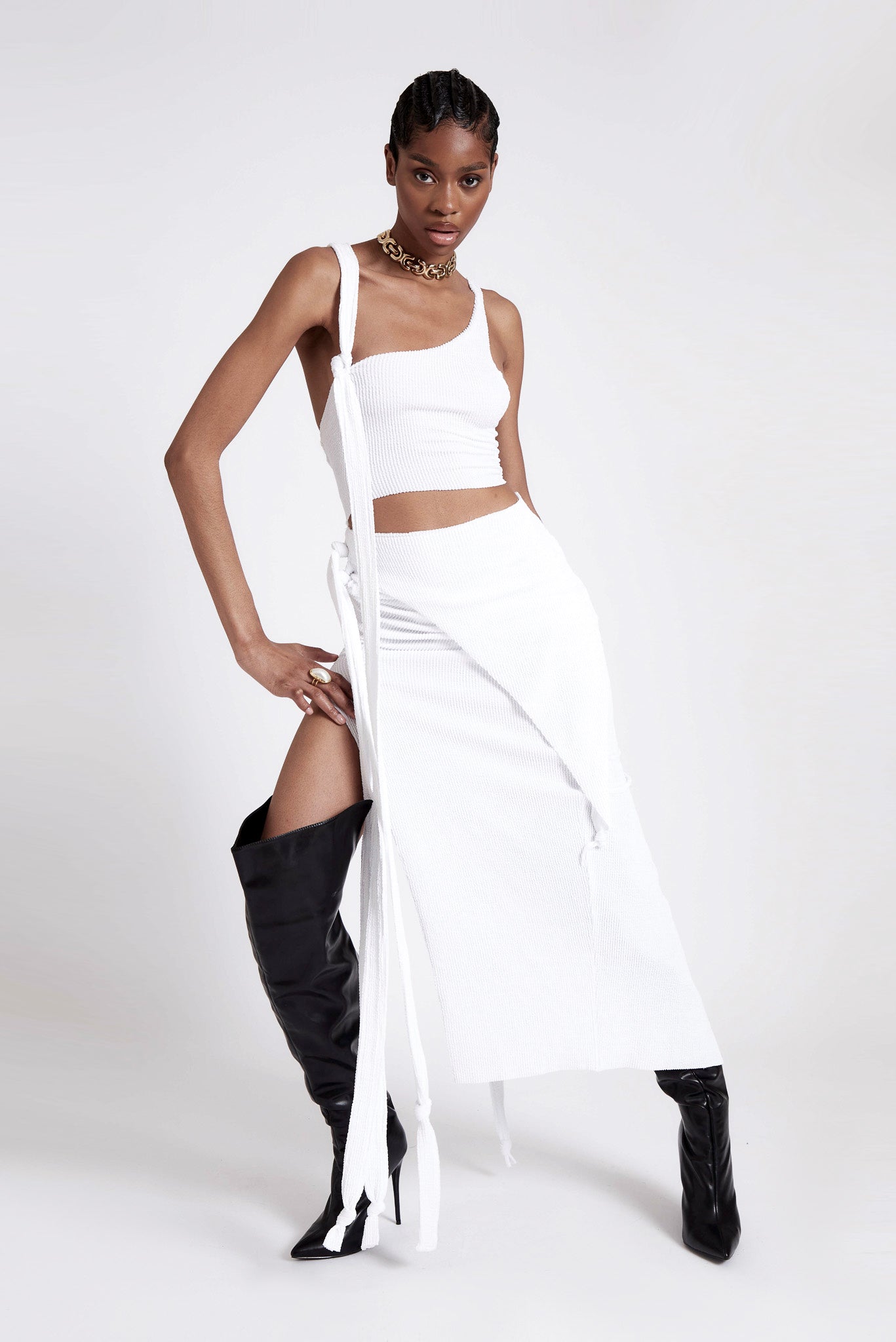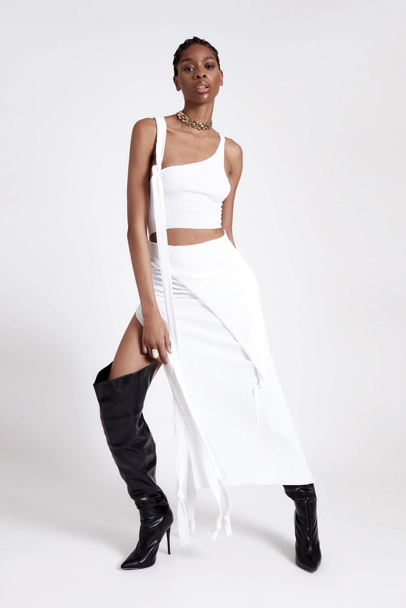 Deconstructed creativeness with this new piece. Made from a super stretchy fabric, this chic look can be tied in many ways. Elongated straps create subtle drape movements in whichever style you prefer. Style with strappy heels or thigh high boots.
