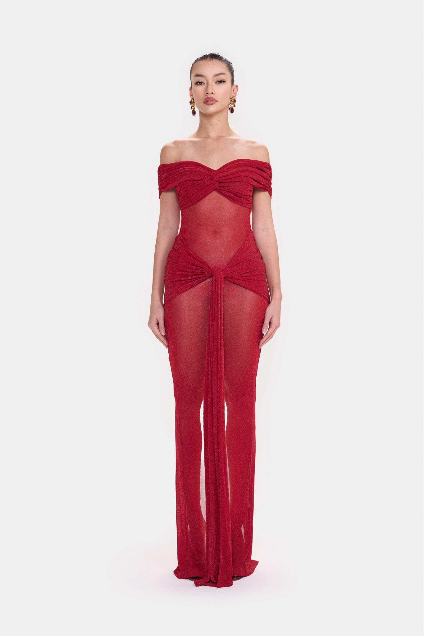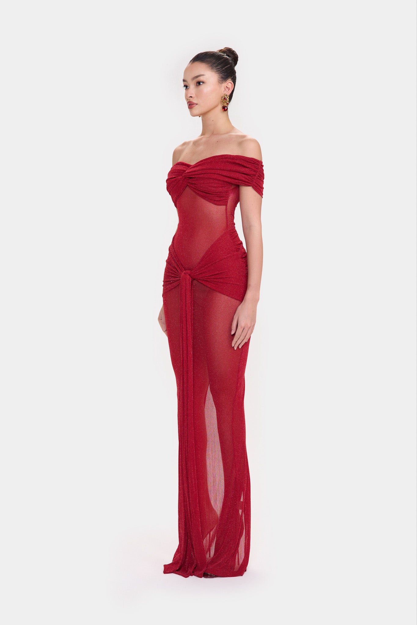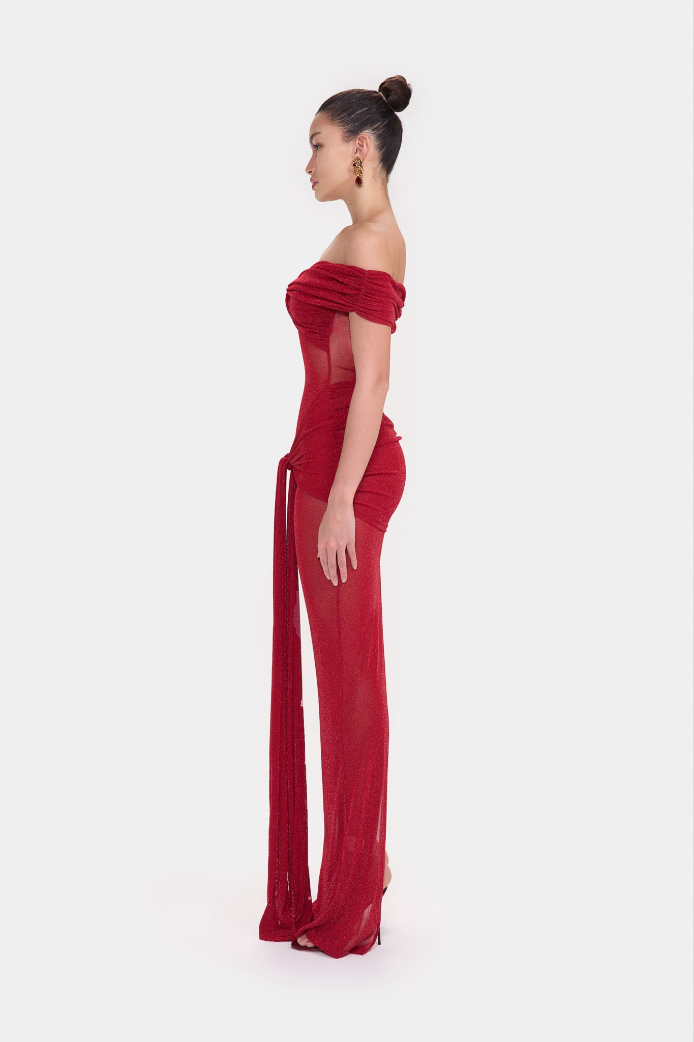 Introducing the Jayval Bandeau Maxi. Made with soft stretchy glittered fabric, this dress offers a bandeau-style bust with ruched cups and bardot sleeves for a stylish and comfortable fit. The maxi length features front and back ruched sarongs with a self-tie strap, making it perfect for any Valentine's occasion.
