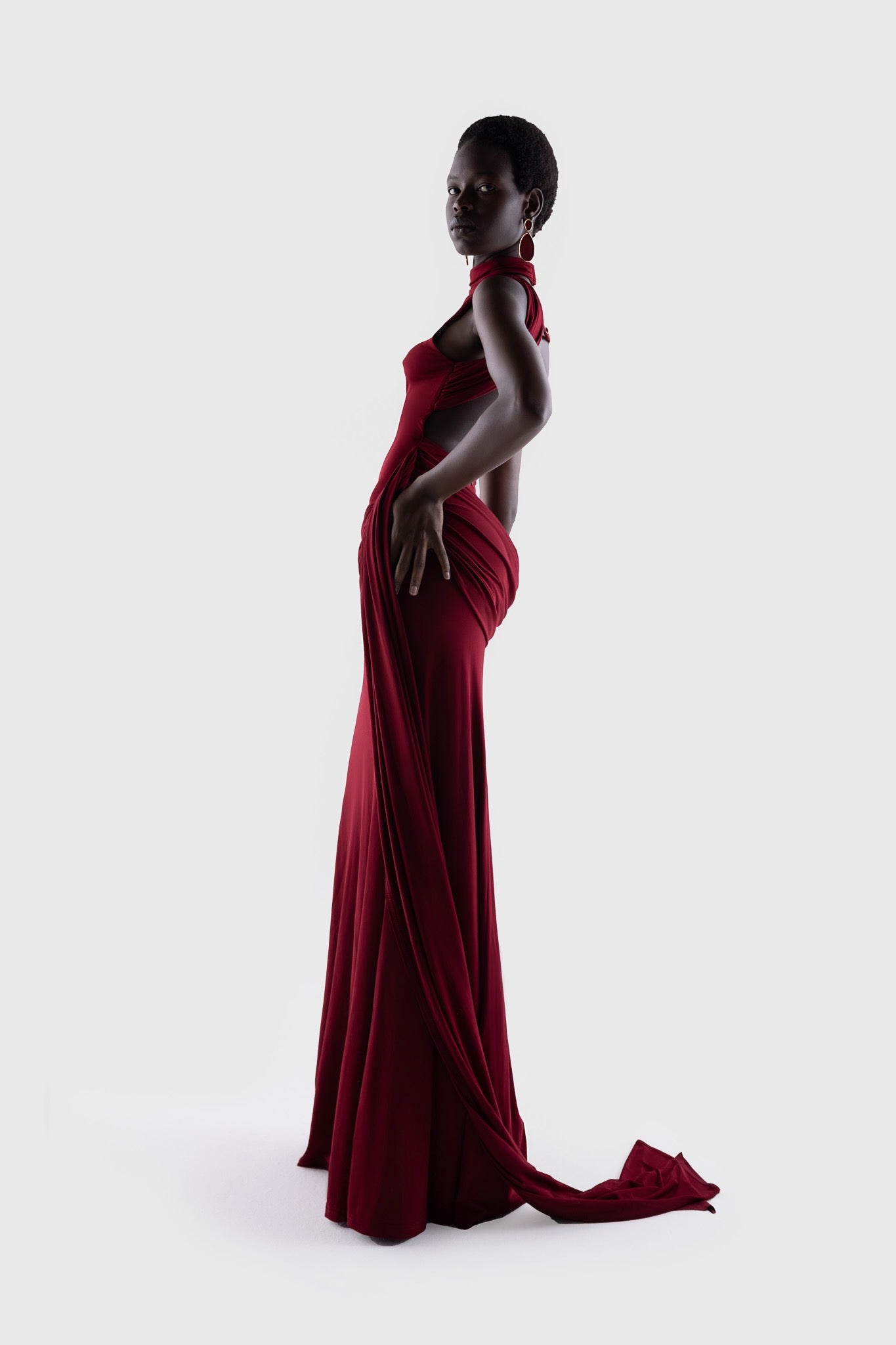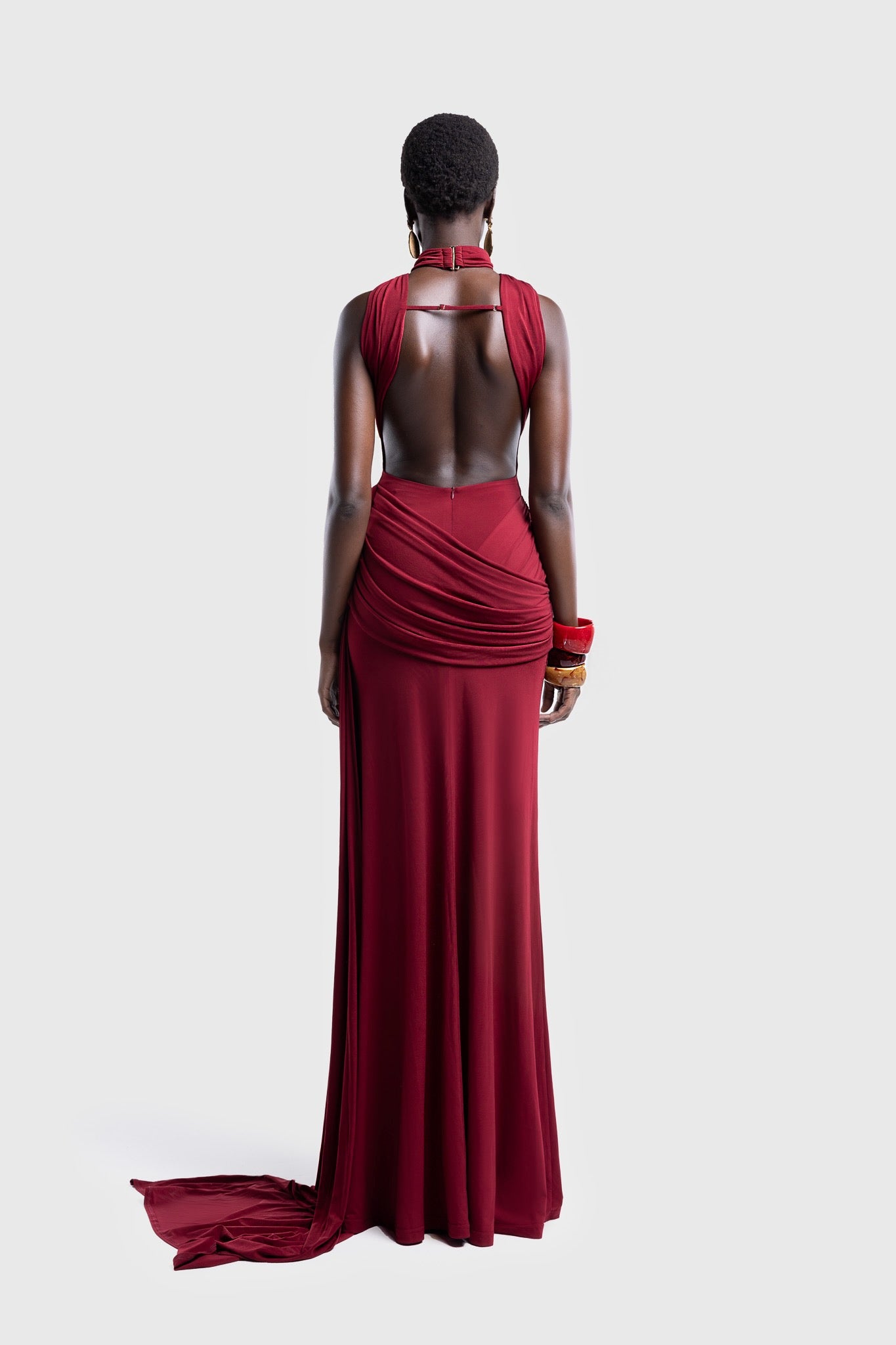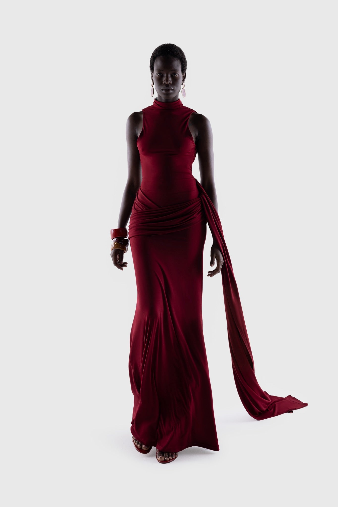 A reimagined saree style maxi with carefully placed pleated panels and open back.